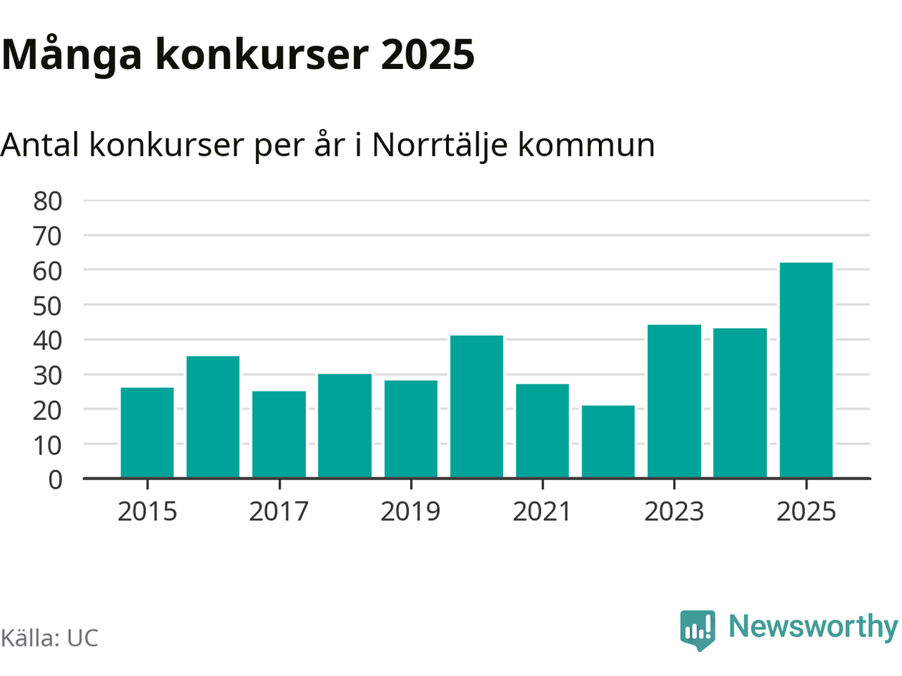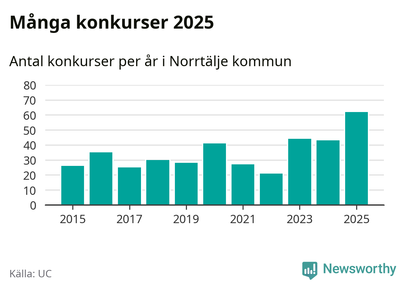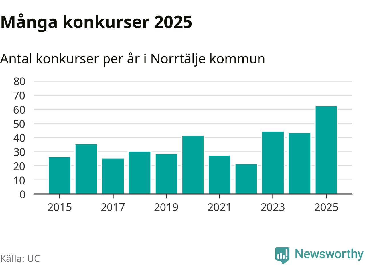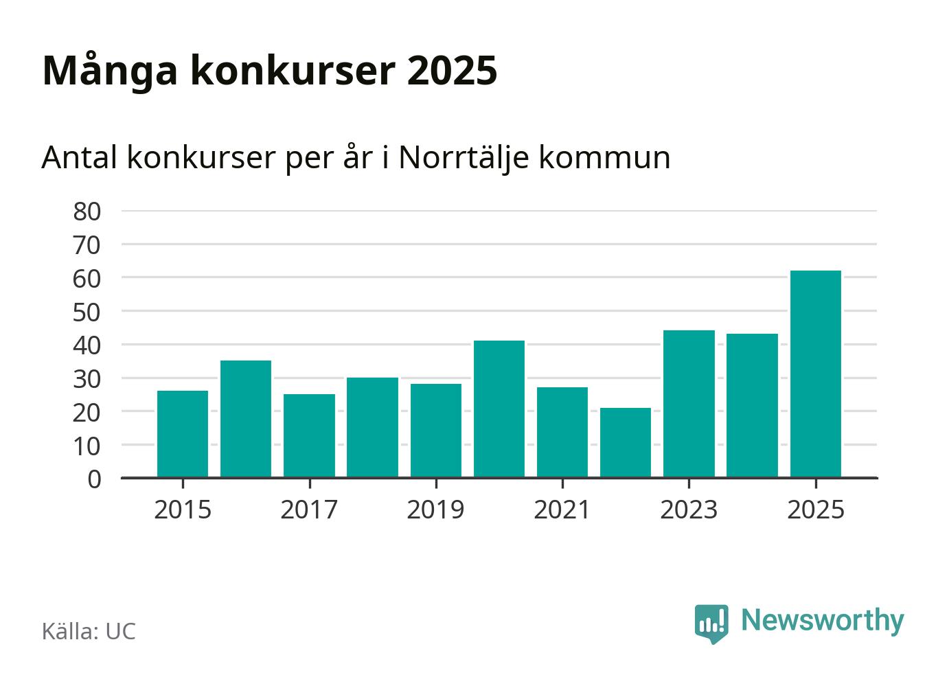 Under år 2025 gick sammanlagt 62 bolag med säte i Norrtälje kommun i konkurs. Det är det högsta antalet sedan åtminstone år 2015. Det visar ny statistik från UC.