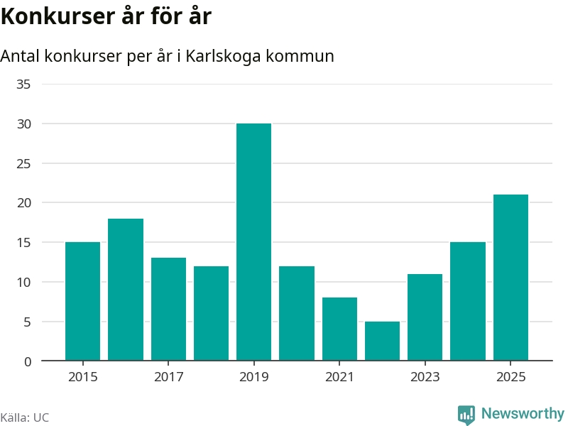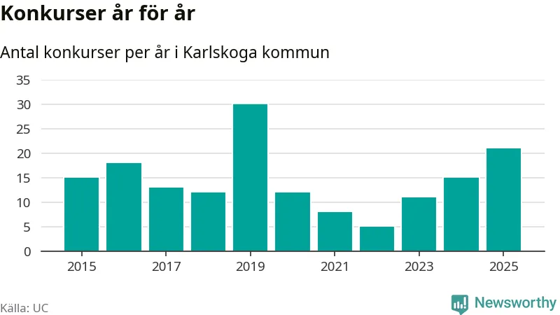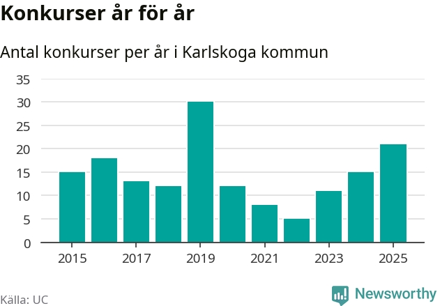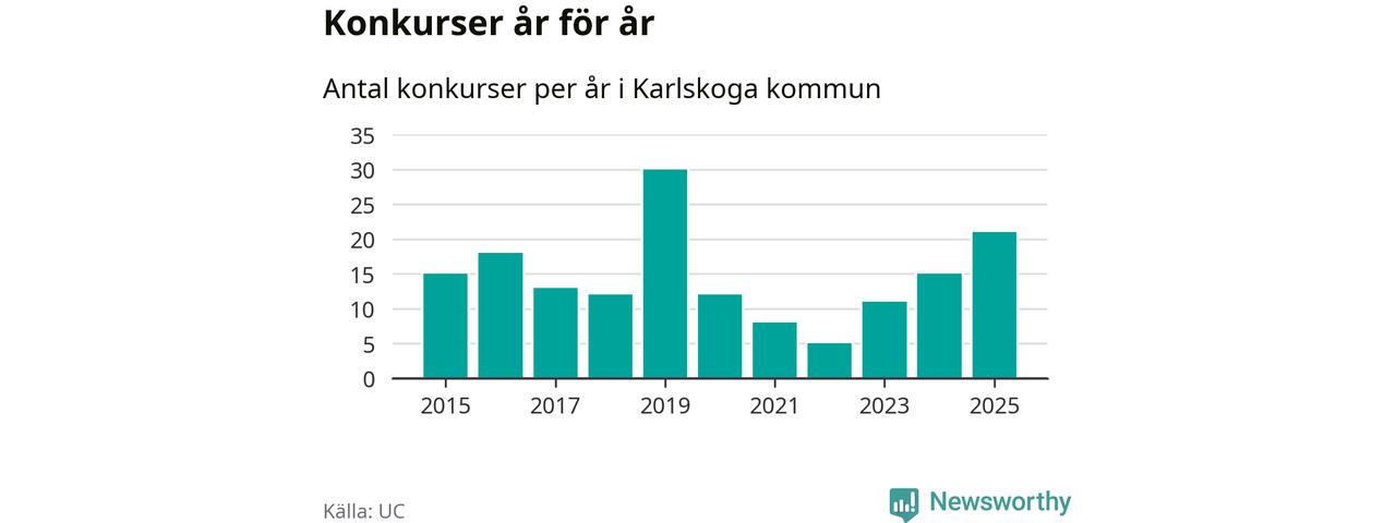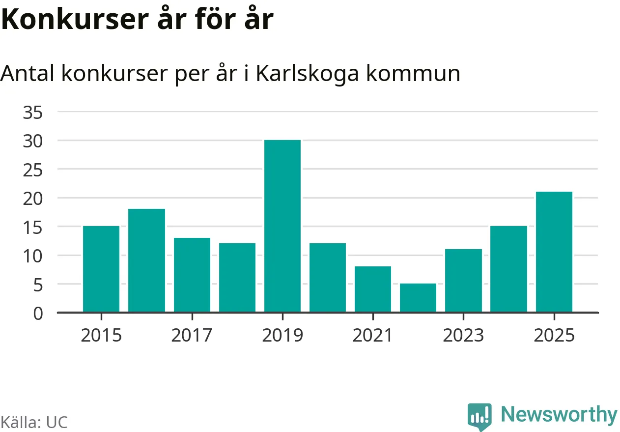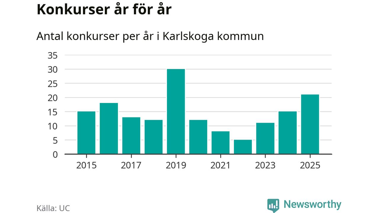 Under år 2025 gick sammanlagt 21 bolag med säte i Karlskoga kommun i konkurs. Det är det högsta antalet sedan år 2019. Det visar ny statistik från UC.