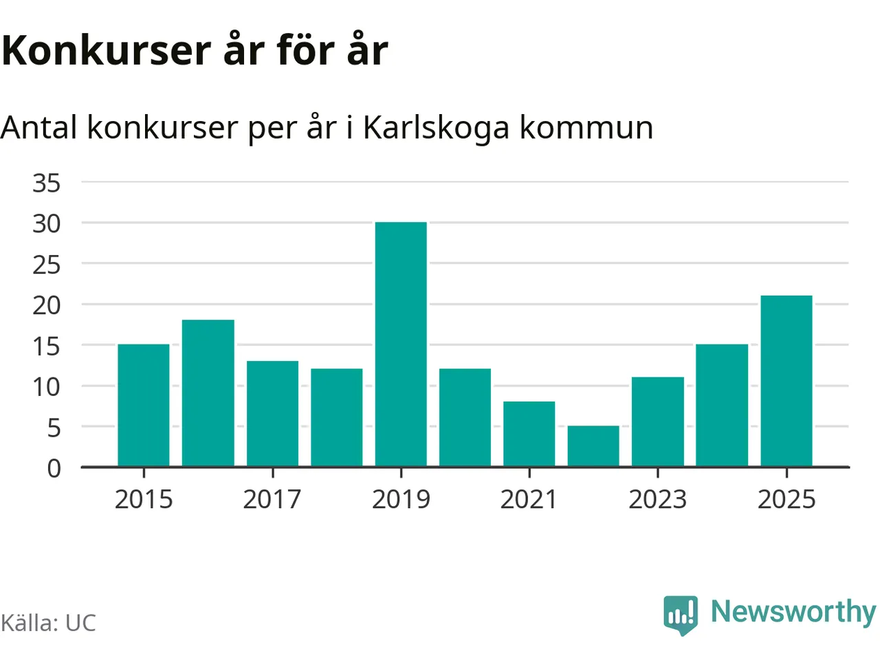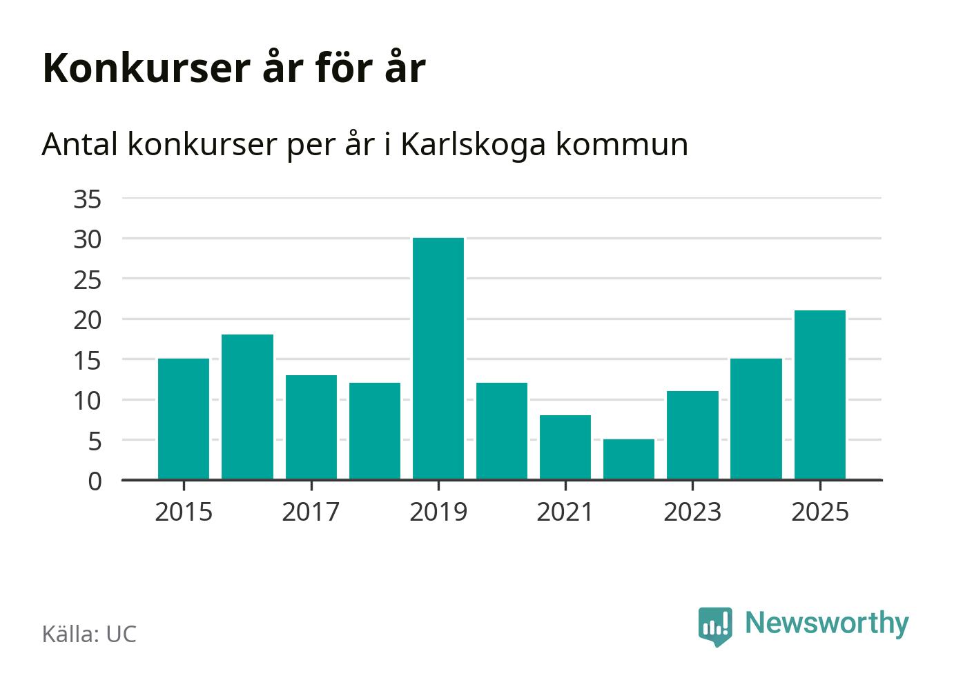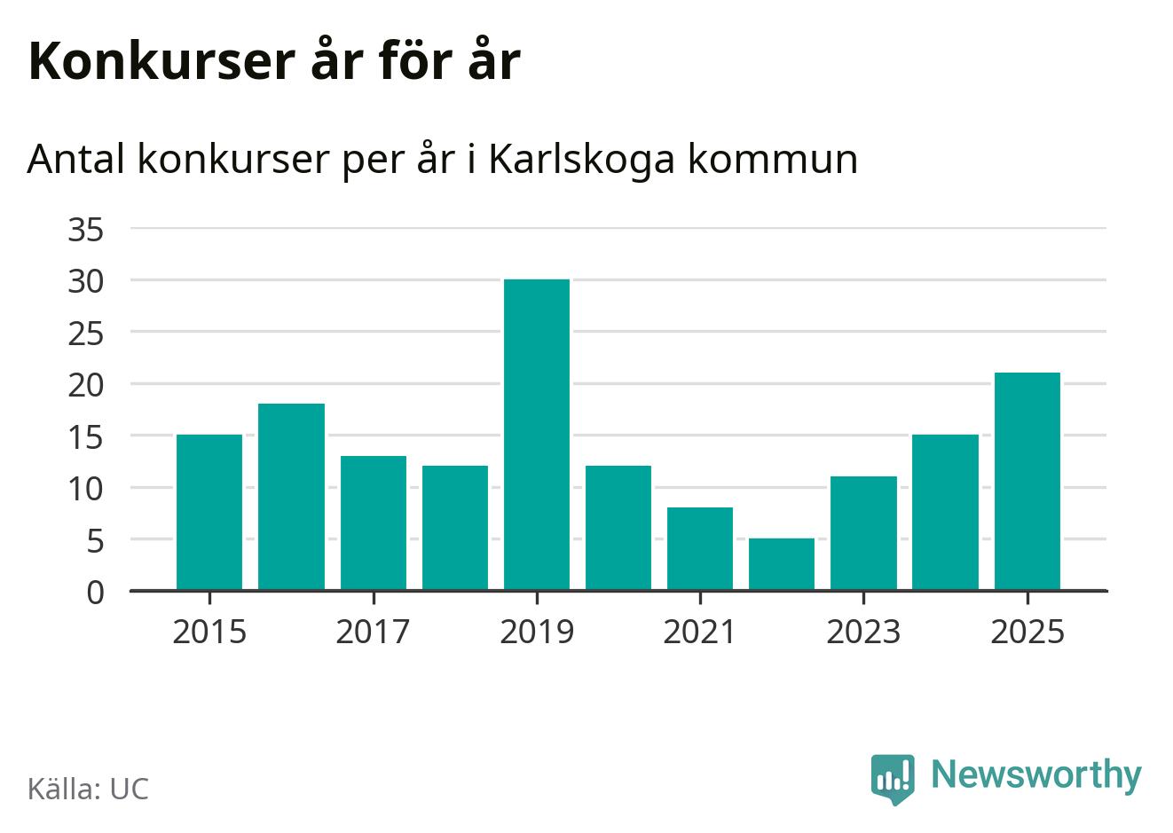 Under år 2025 gick sammanlagt 21 bolag med säte i Karlskoga kommun i konkurs. Det är det högsta antalet sedan år 2019. Det visar ny statistik från UC.
