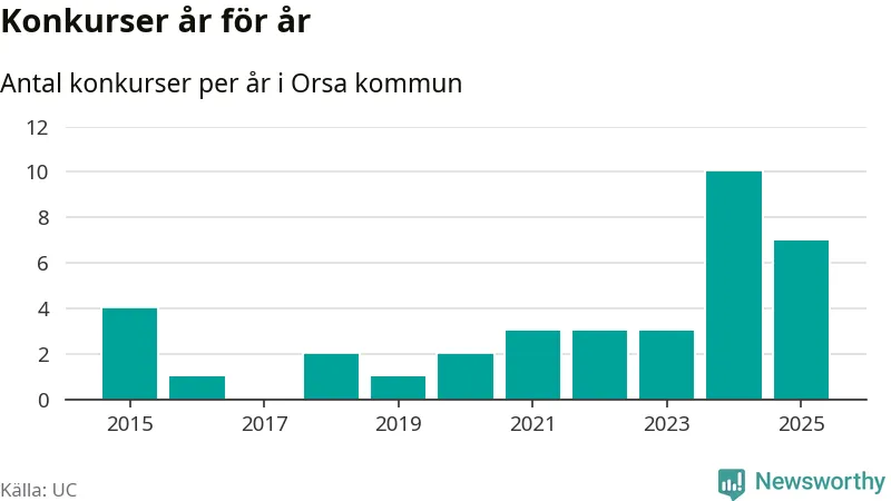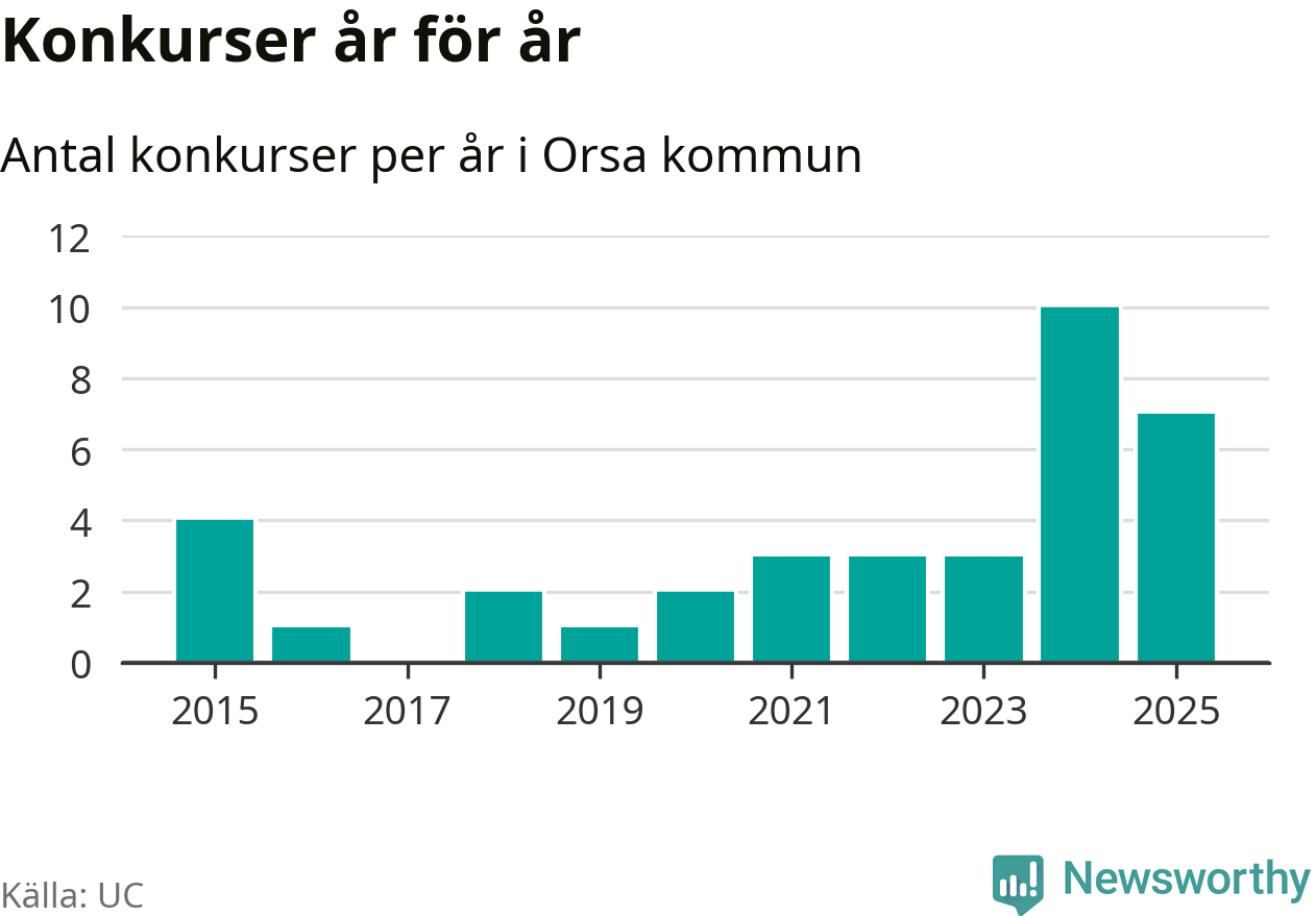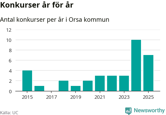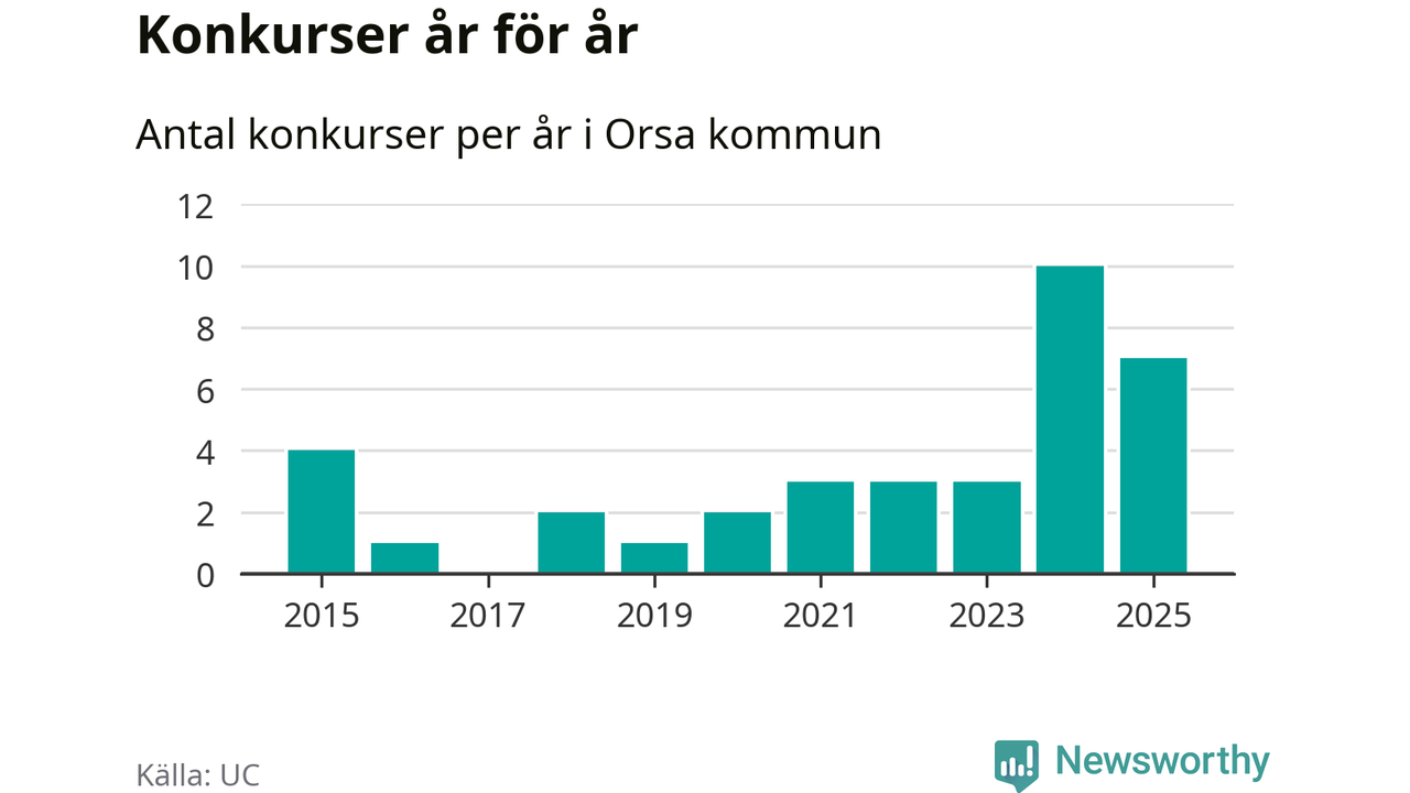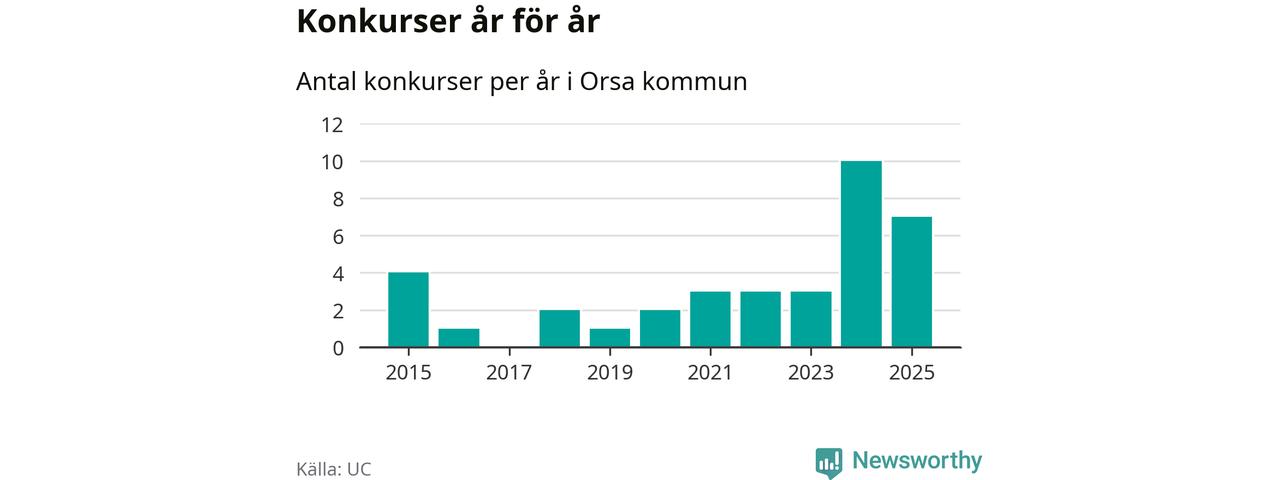 Under år 2025 gick sammanlagt sju bolag med säte i Orsa kommun i konkurs. Det är tre färre än året innan då tio bolag gick i konkurs. Toppåret, sedan 2015, var just 2024 sett till antalet konkursföretag. Det visar ny statistik från UC.