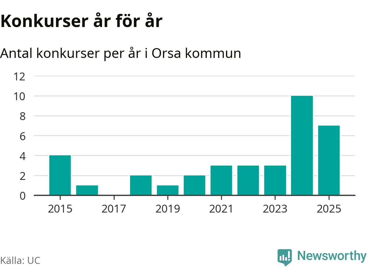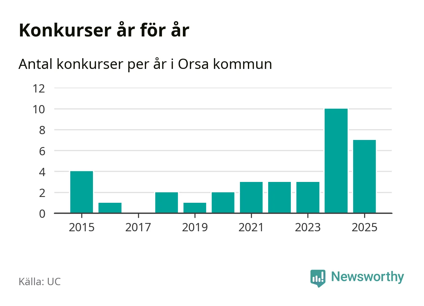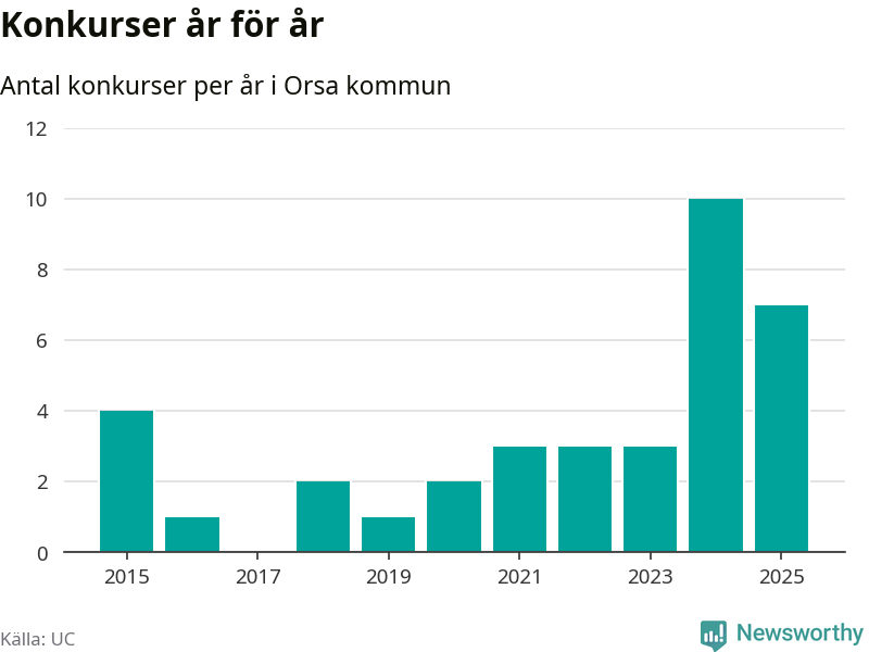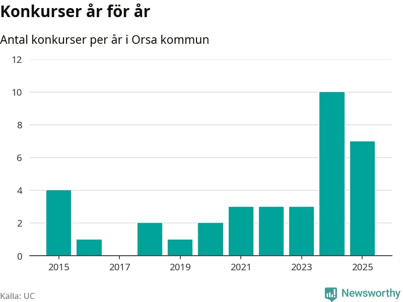 Under år 2025 gick sammanlagt sju bolag med säte i Orsa kommun i konkurs. Det är tre färre än året innan då tio bolag gick i konkurs. Toppåret, sedan 2015, var just 2024 sett till antalet konkursföretag. Det visar ny statistik från UC.