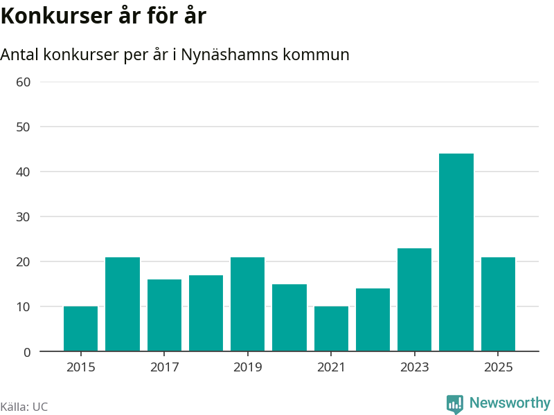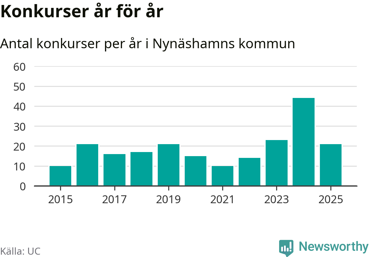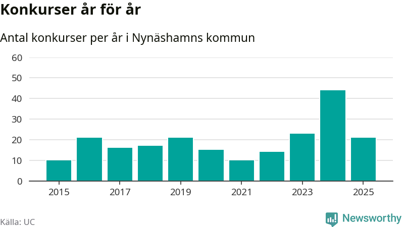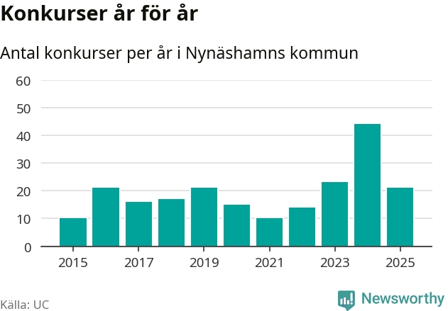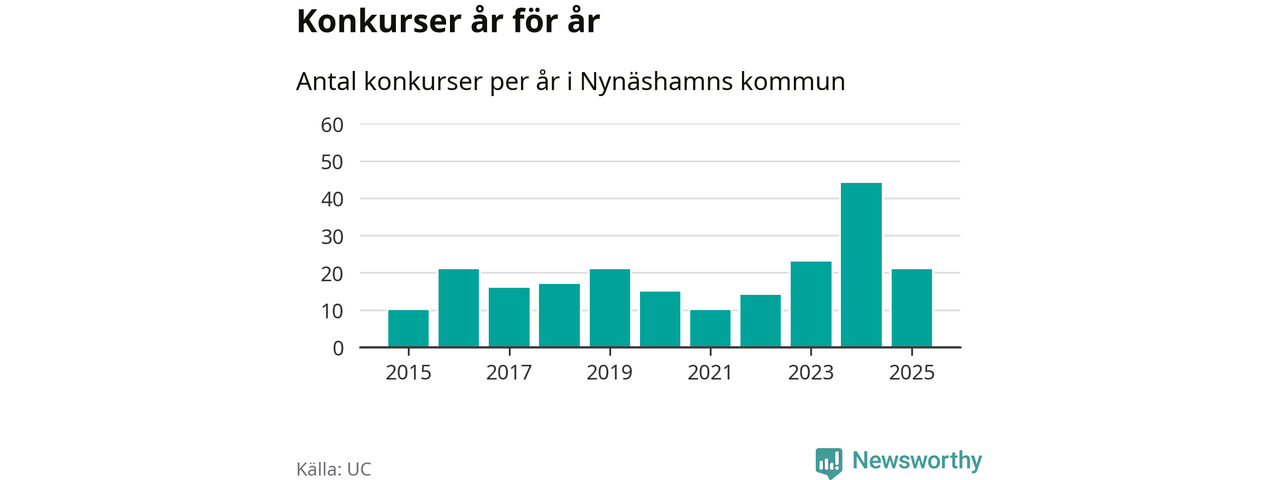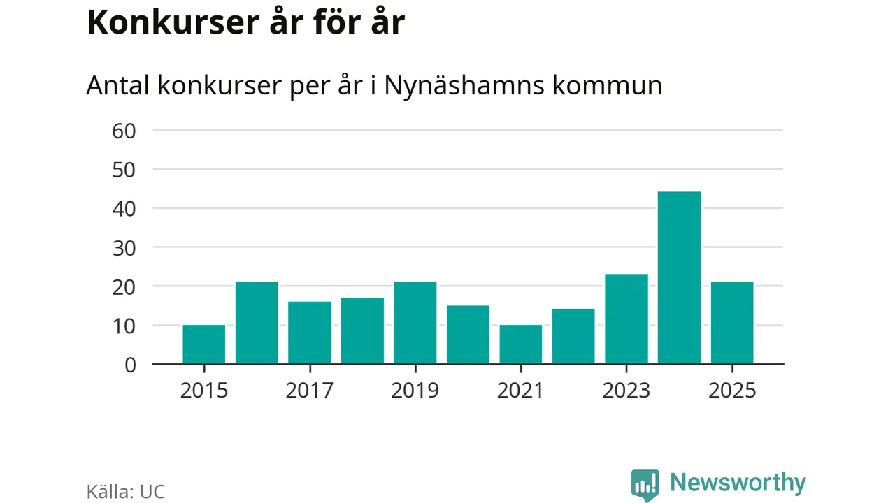 Under år 2025 gick sammanlagt 21 bolag med säte i Nynäshamns kommun i konkurs. Det är 23 färre än året innan då 44 bolag gick i konkurs. Toppåret, sedan 2015, var just 2024 sett till antalet konkursföretag. Det visar ny statistik från UC.
