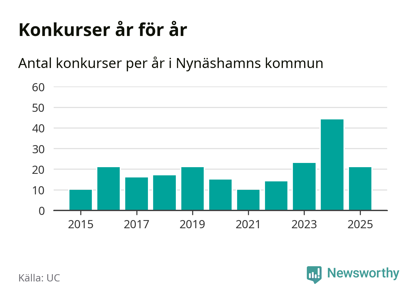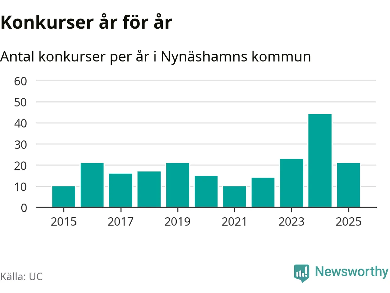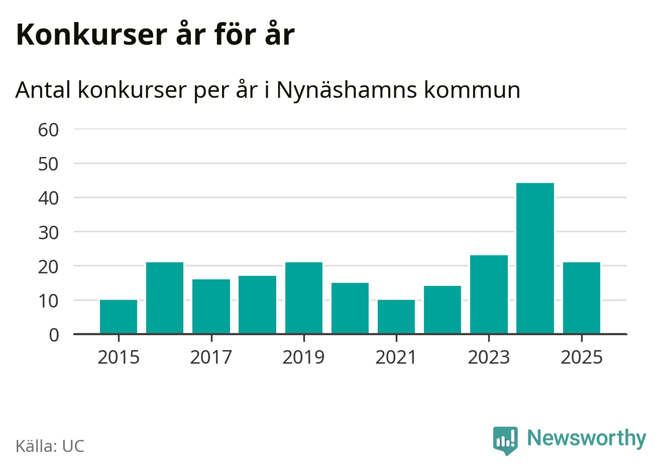 Under år 2025 gick sammanlagt 21 bolag med säte i Nynäshamns kommun i konkurs. Det är 23 färre än året innan då 44 bolag gick i konkurs. Toppåret, sedan 2015, var just 2024 sett till antalet konkursföretag. Det visar ny statistik från UC.