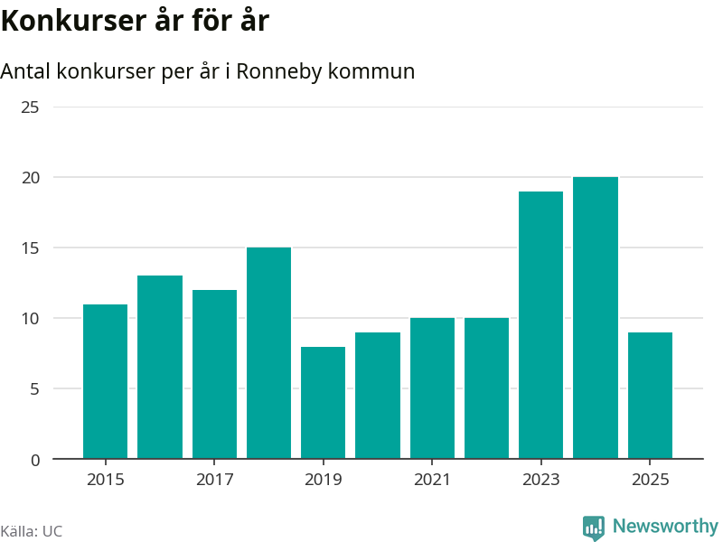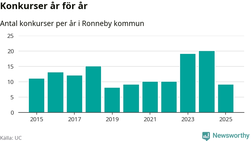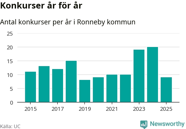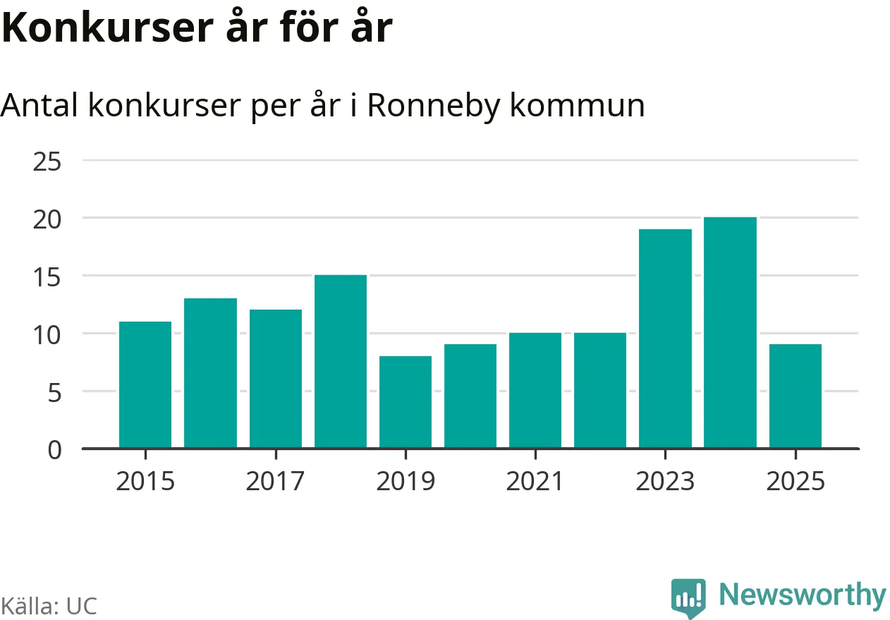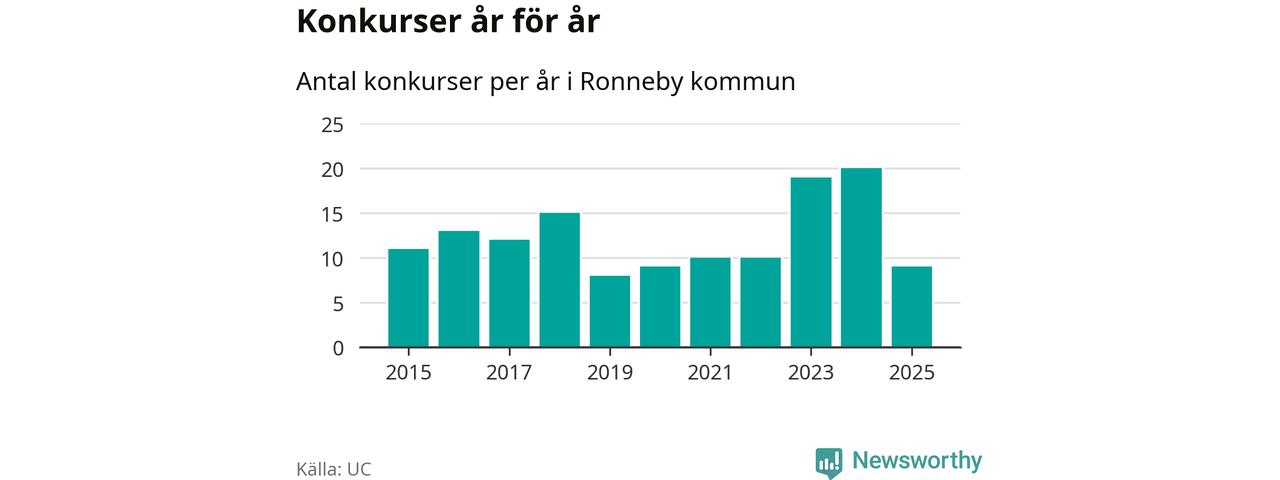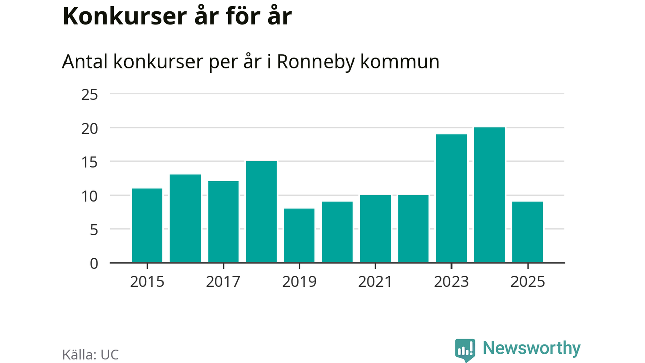 Under år 2025 gick sammanlagt nio bolag med säte i Ronneby kommun i konkurs. Det är elva färre än året innan då 20 bolag gick i konkurs. Toppåret, sedan 2015, var just 2024 sett till antalet konkursföretag. Det visar ny statistik från UC.