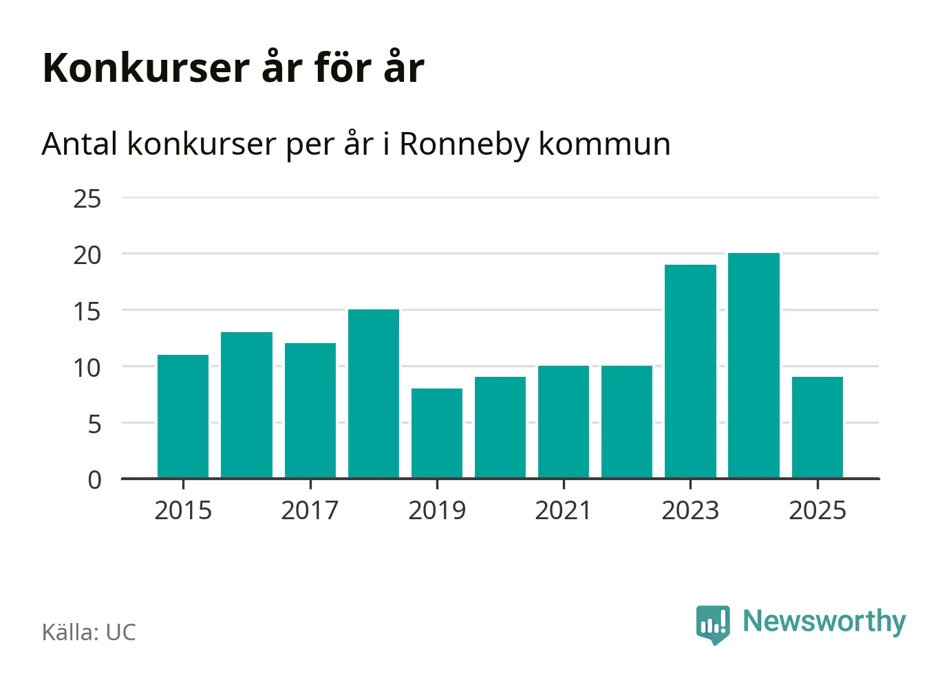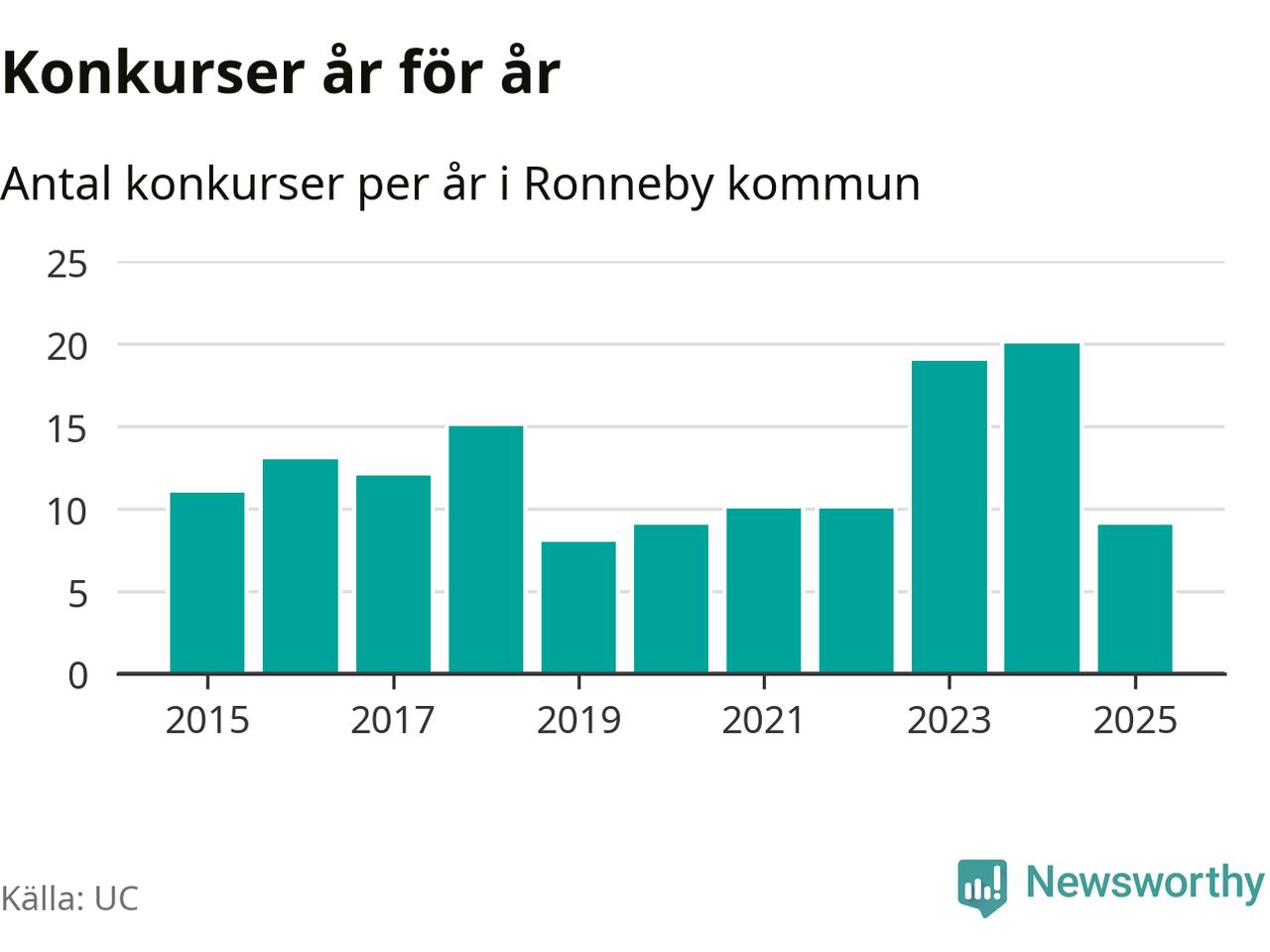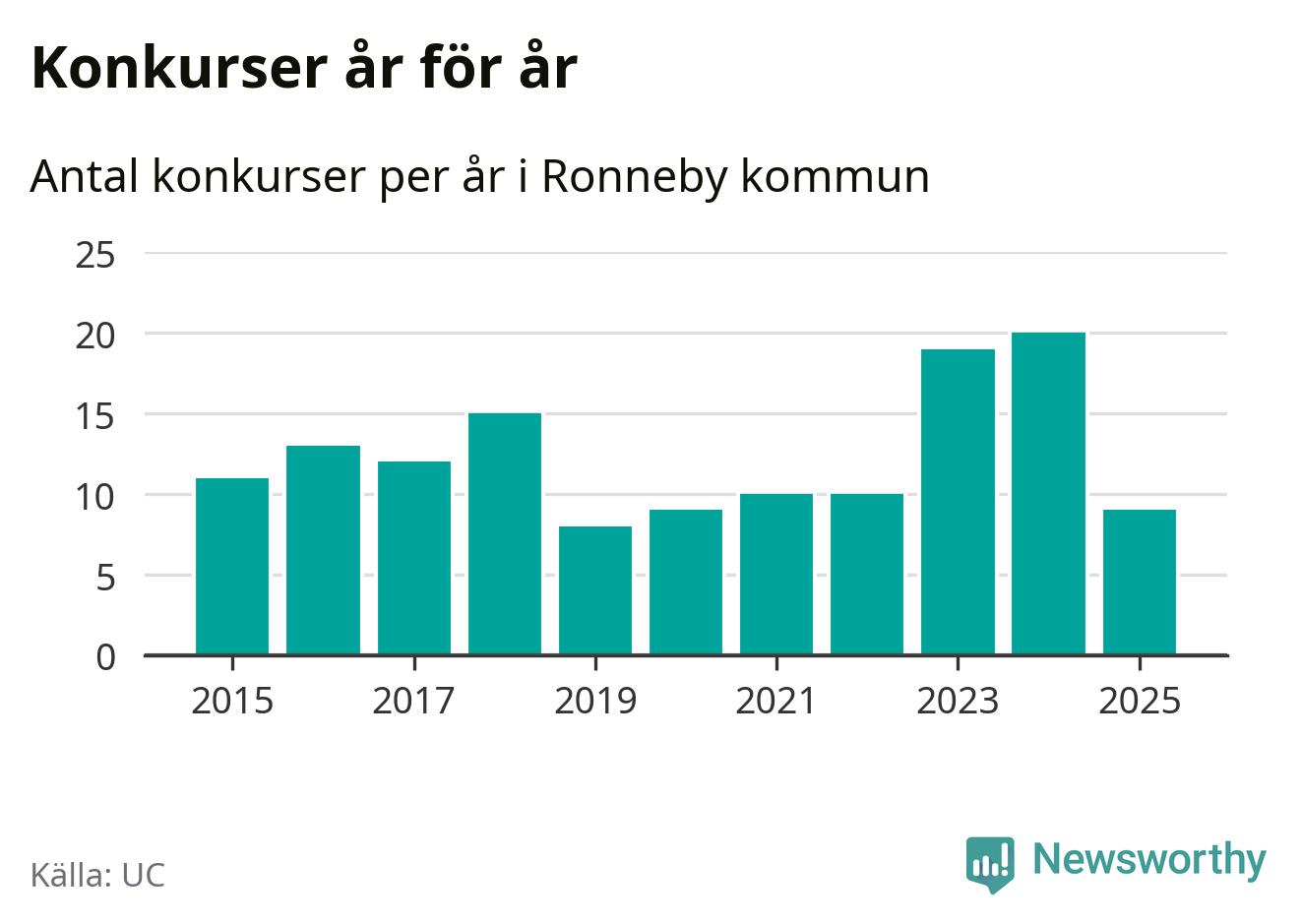 Under år 2025 gick sammanlagt nio bolag med säte i Ronneby kommun i konkurs. Det är elva färre än året innan då 20 bolag gick i konkurs. Toppåret, sedan 2015, var just 2024 sett till antalet konkursföretag. Det visar ny statistik från UC.