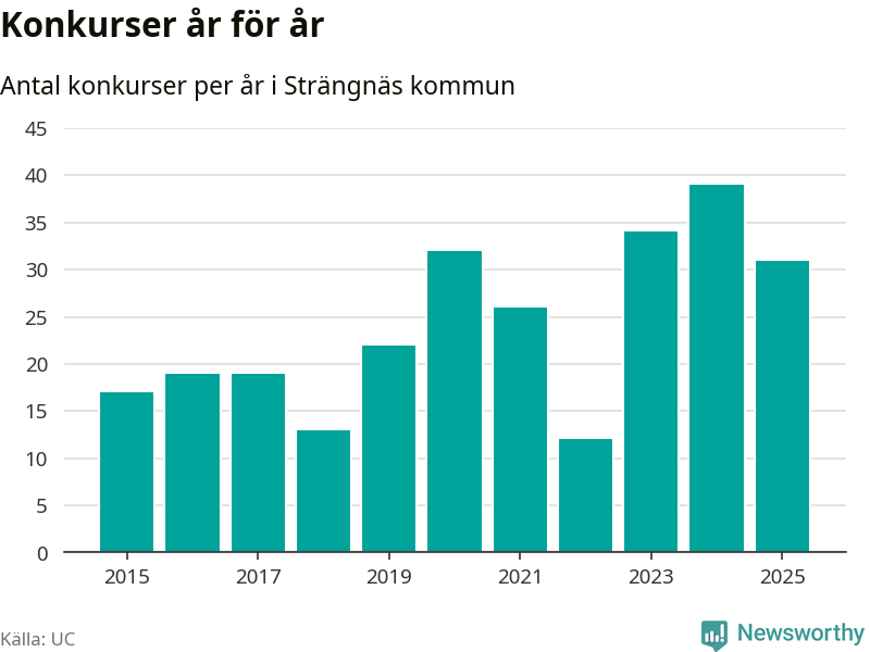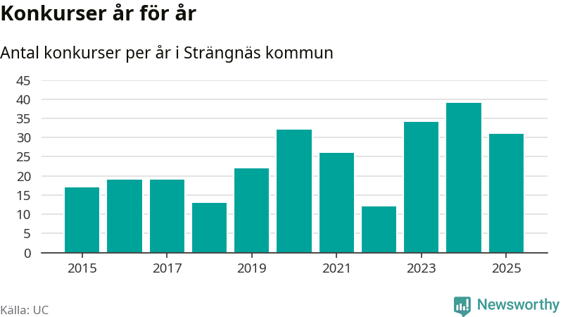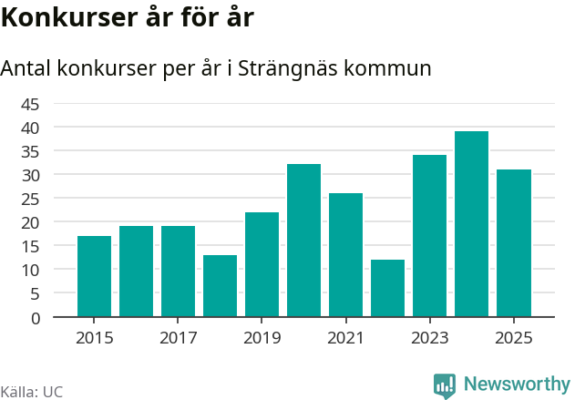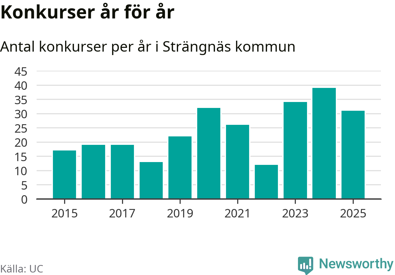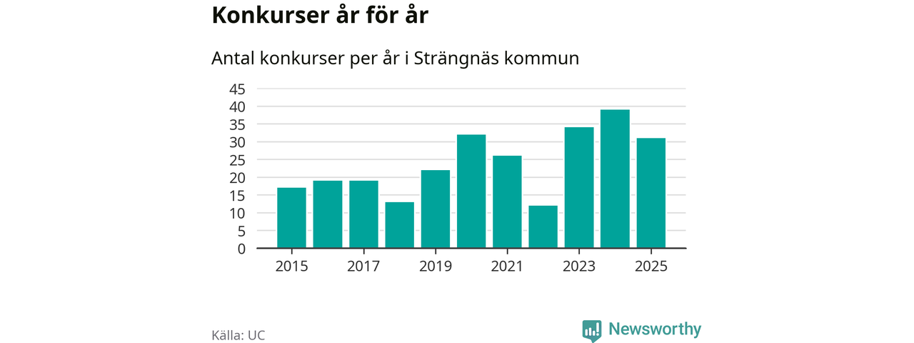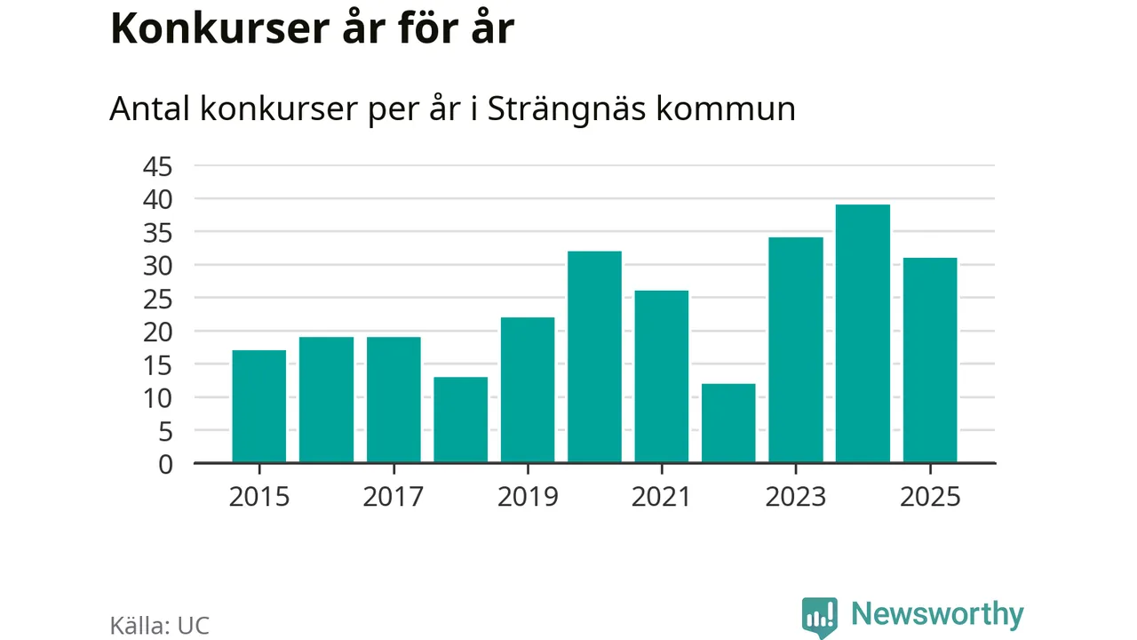 Under år 2025 gick sammanlagt 31 bolag med säte i Strängnäs kommun i konkurs. Det är åtta färre än året innan då 39 bolag gick i konkurs. Toppåret, sedan 2015, var just 2024 sett till antalet konkursföretag. Det visar ny statistik från UC.