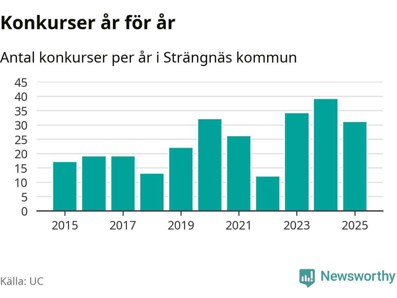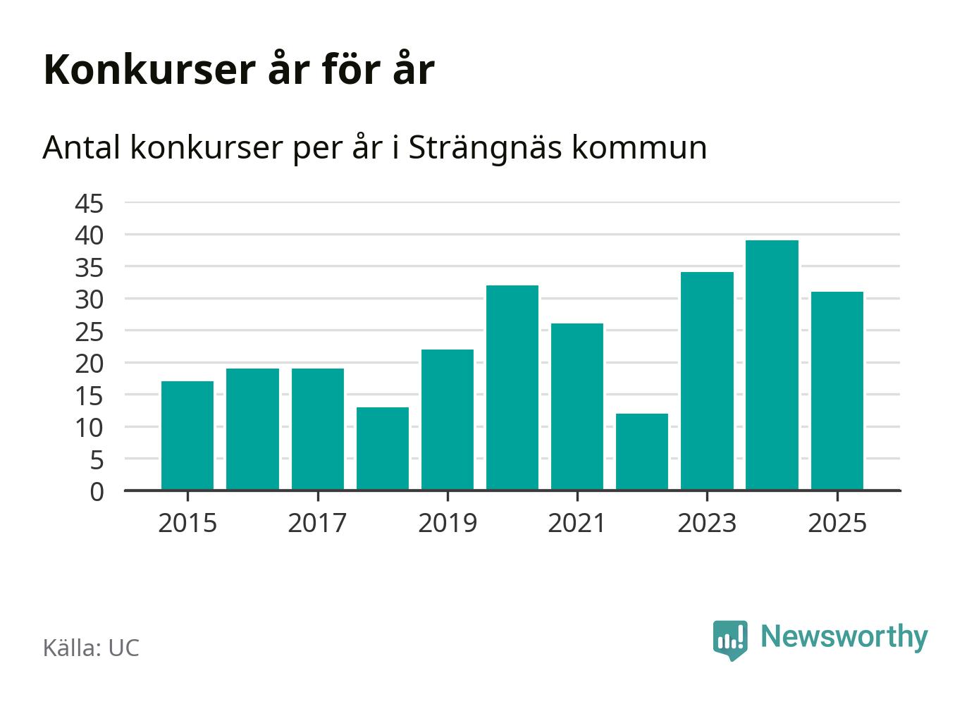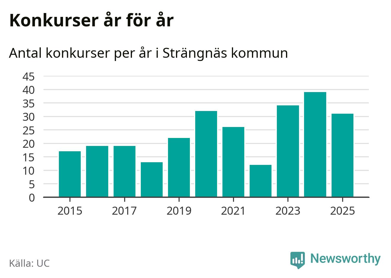 Under år 2025 gick sammanlagt 31 bolag med säte i Strängnäs kommun i konkurs. Det är åtta färre än året innan då 39 bolag gick i konkurs. Toppåret, sedan 2015, var just 2024 sett till antalet konkursföretag. Det visar ny statistik från UC.