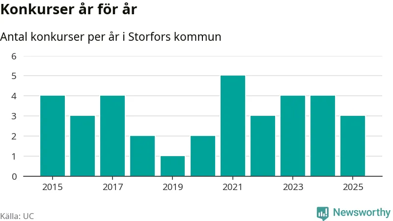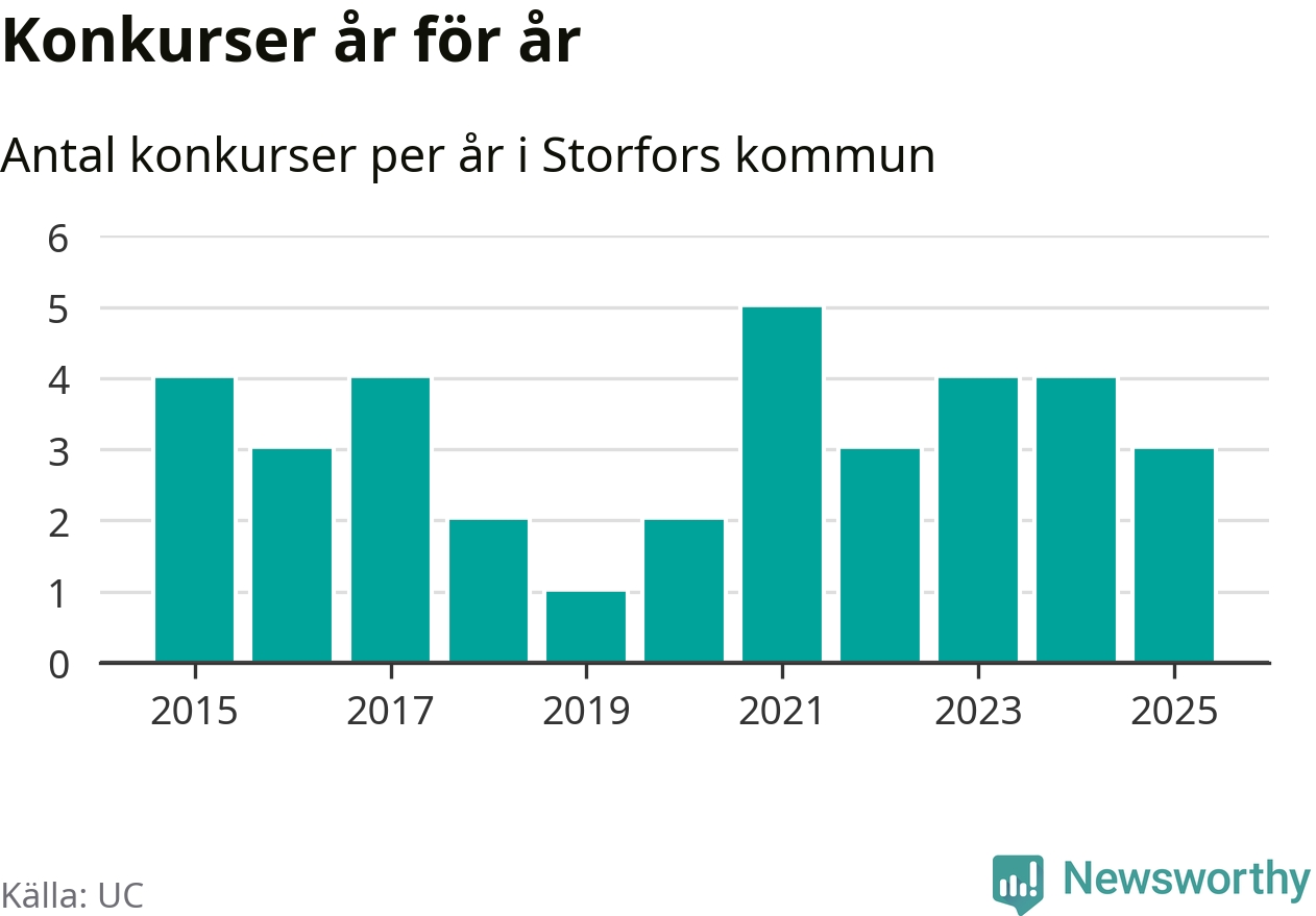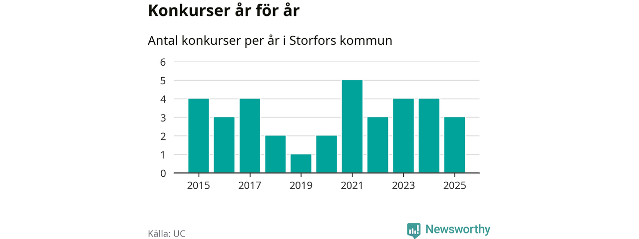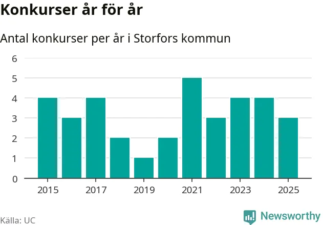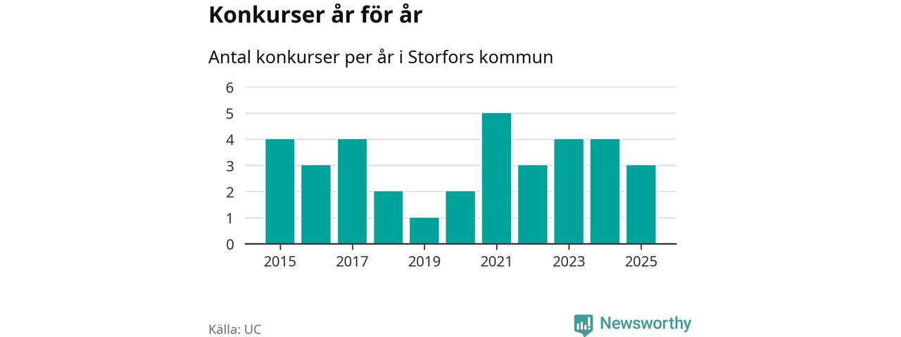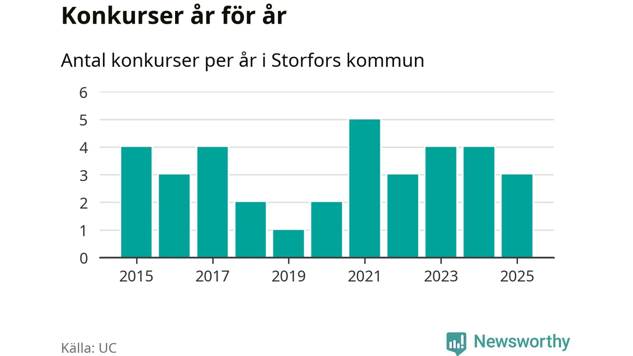 Under år 2025 gick sammanlagt tre bolag med säte i Storfors kommun i konkurs. Det är ett färre än året innan. Toppåret, sedan 2015, var 2021 då fem bolag gick i konkurs. Det visar ny statistik från UC.