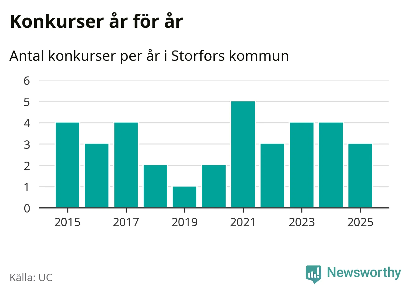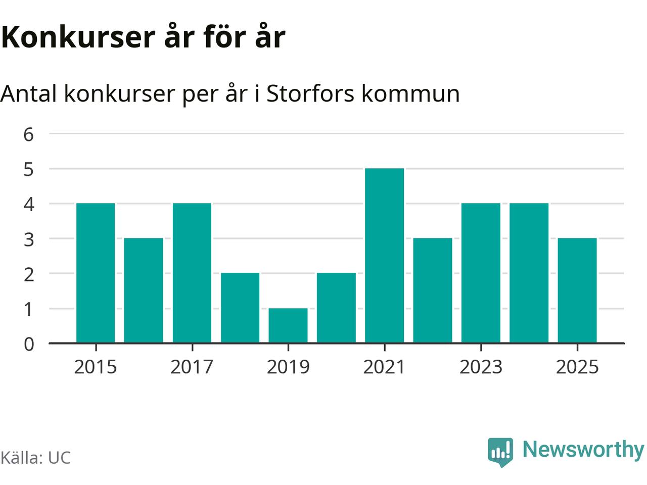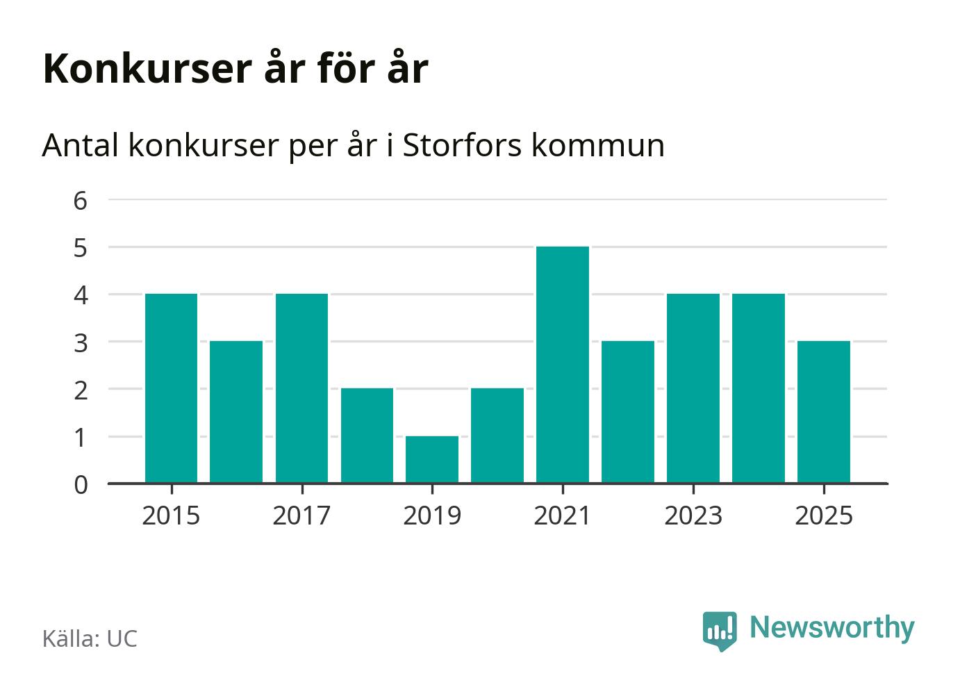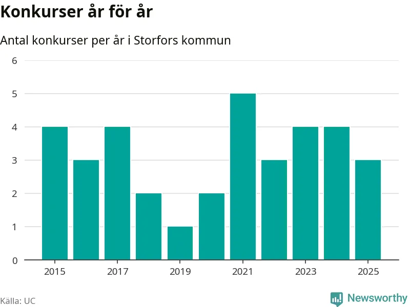 Under år 2025 gick sammanlagt tre bolag med säte i Storfors kommun i konkurs. Det är ett färre än året innan. Toppåret, sedan 2015, var 2021 då fem bolag gick i konkurs. Det visar ny statistik från UC.