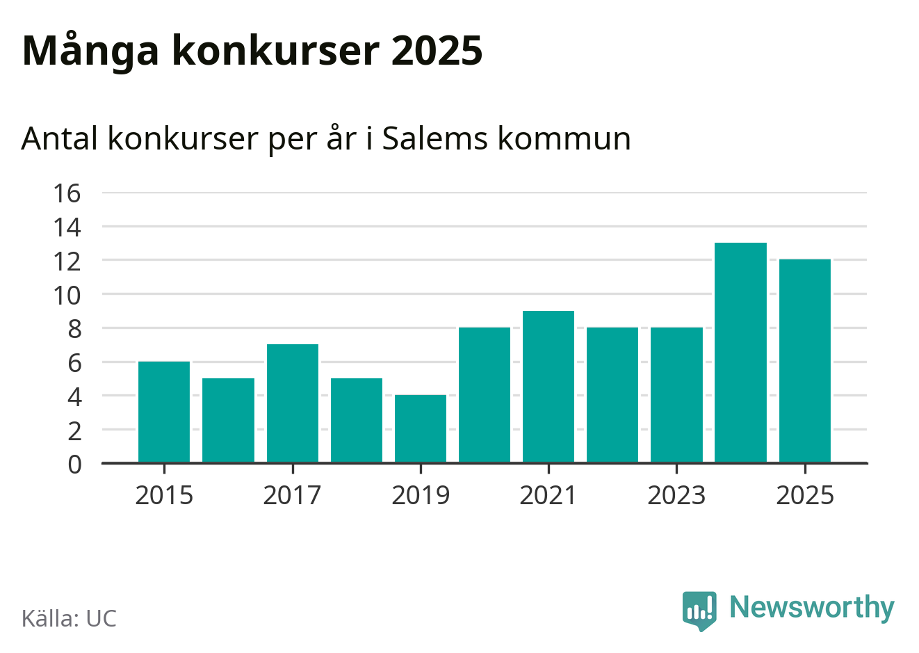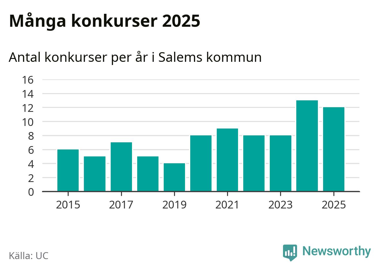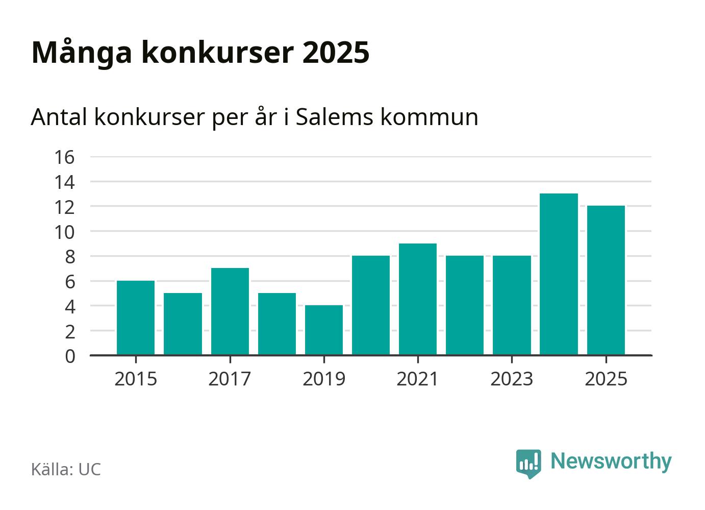Under år 2025 gick sammanlagt tolv bolag med säte i Salems kommun i konkurs. Det är ett färre än året innan. Toppåret, sedan 2015, var just 2024 sett till antalet konkursföretag. Det visar ny statistik från UC.