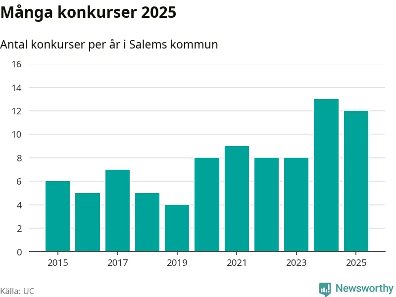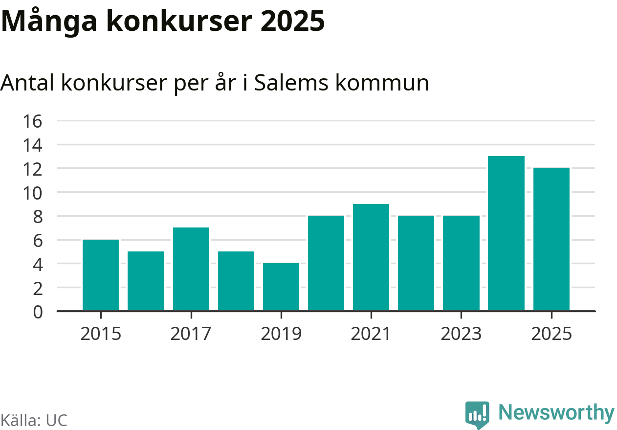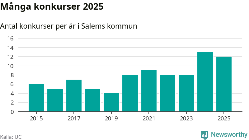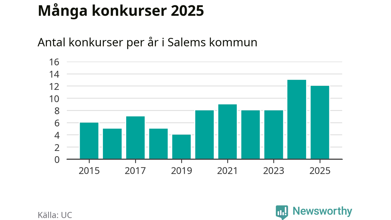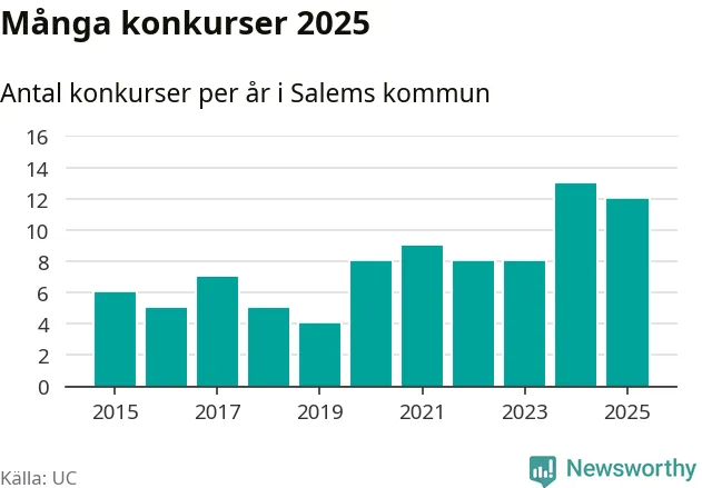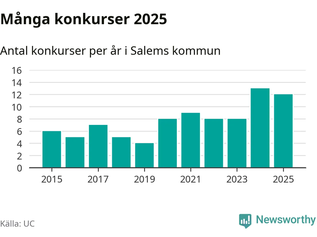 Under år 2025 gick sammanlagt tolv bolag med säte i Salems kommun i konkurs. Det är ett färre än året innan. Toppåret, sedan 2015, var just 2024 sett till antalet konkursföretag. Det visar ny statistik från UC.