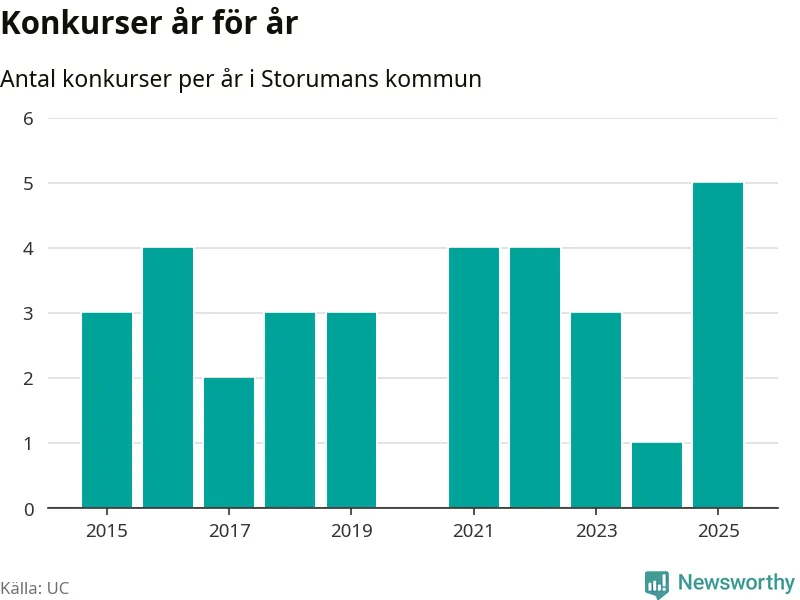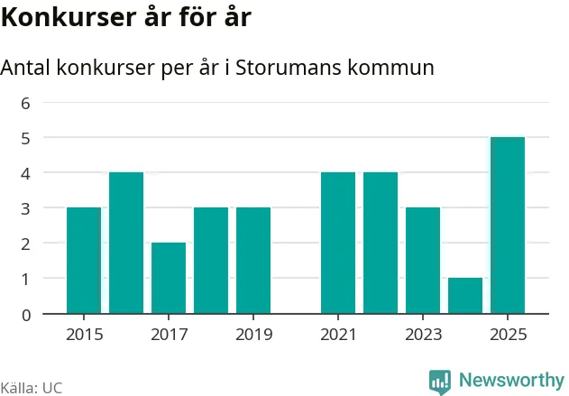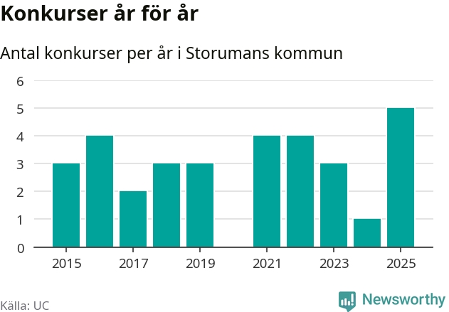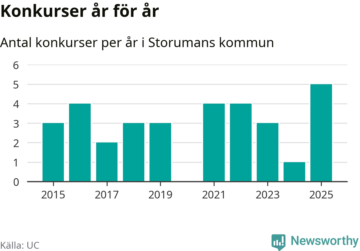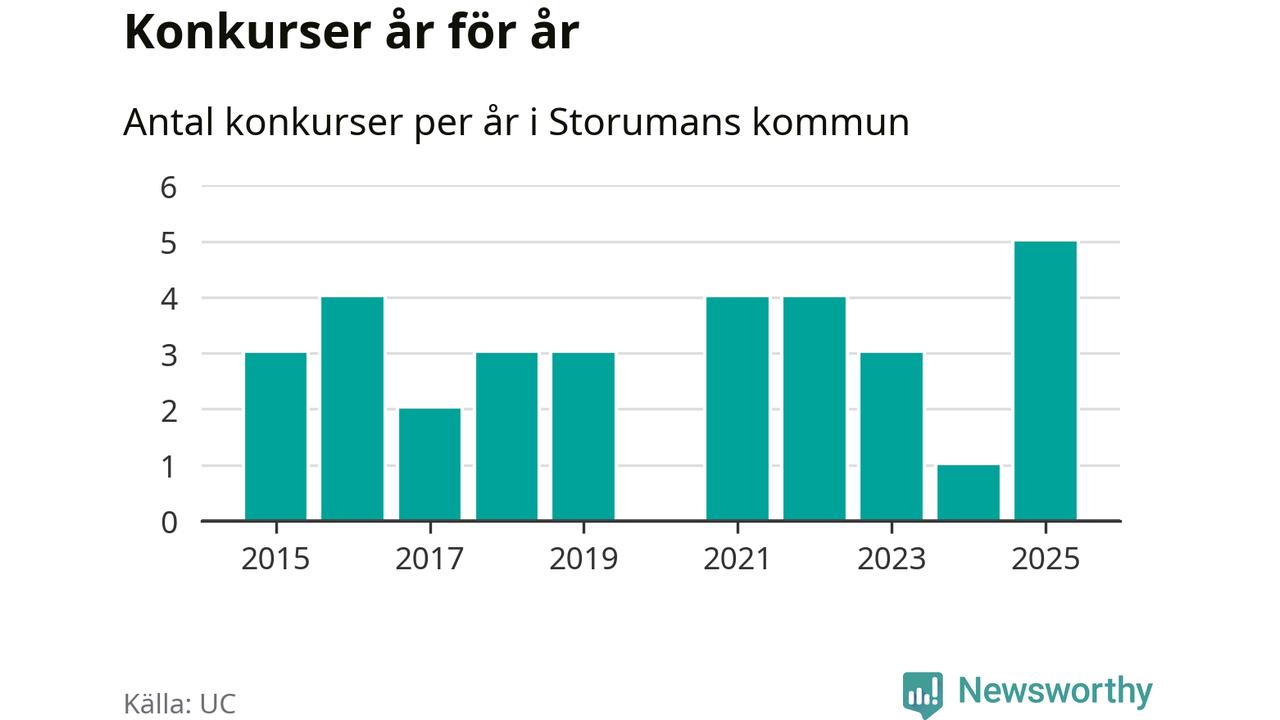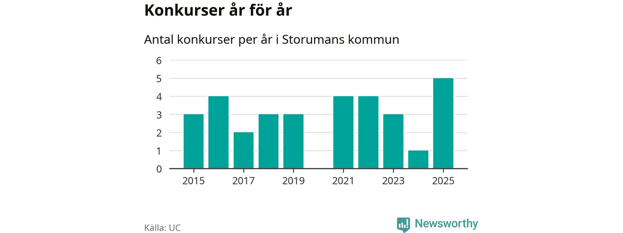 Under år 2025 gick sammanlagt fem bolag med säte i Storumans kommun i konkurs. Det är det högsta antalet sedan åtminstone år 2015. Det visar ny statistik från UC.
