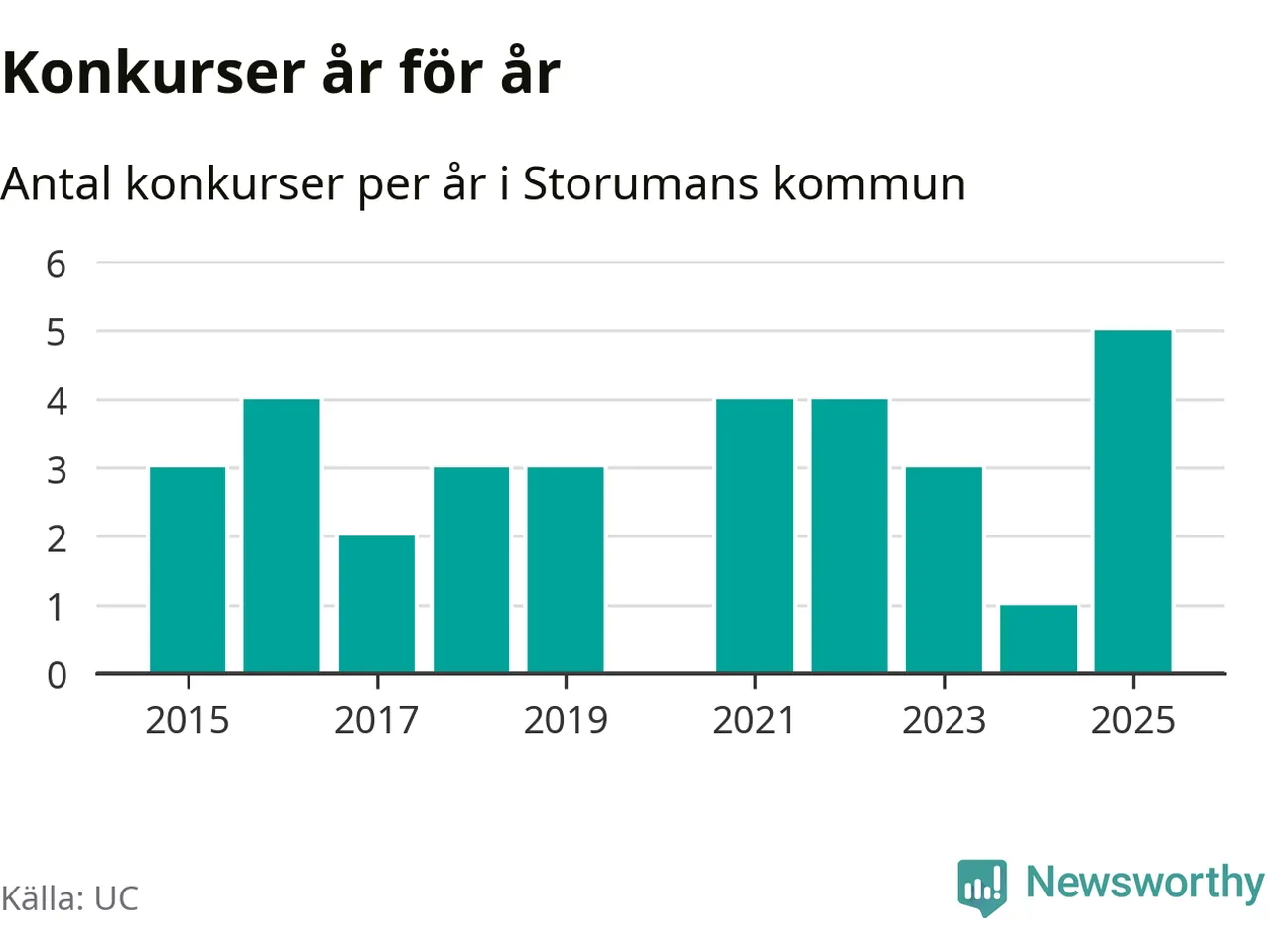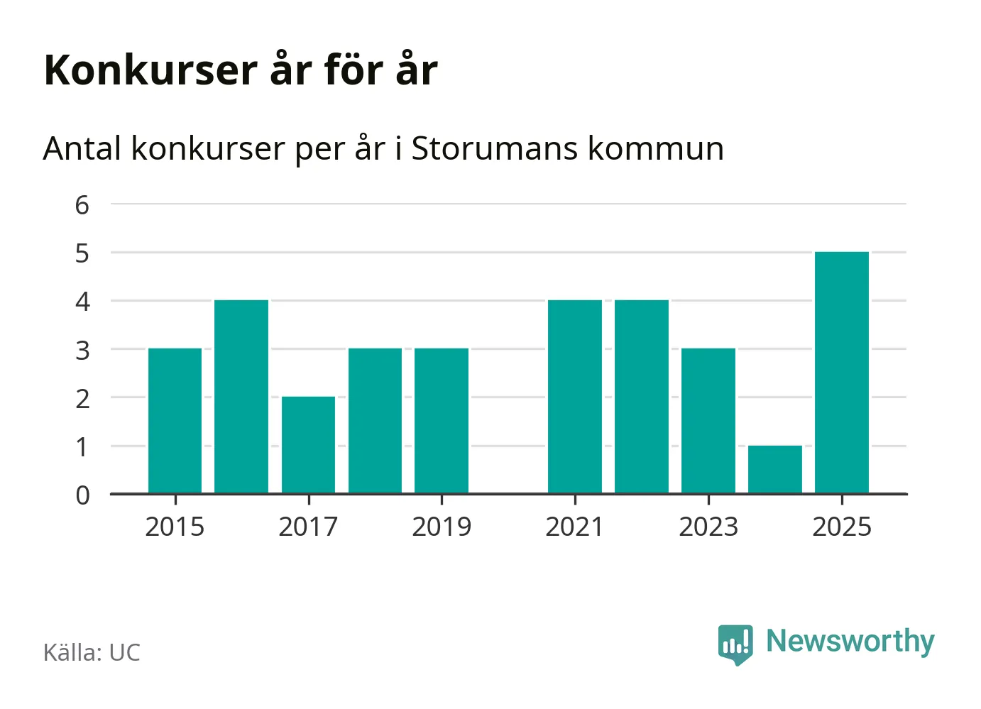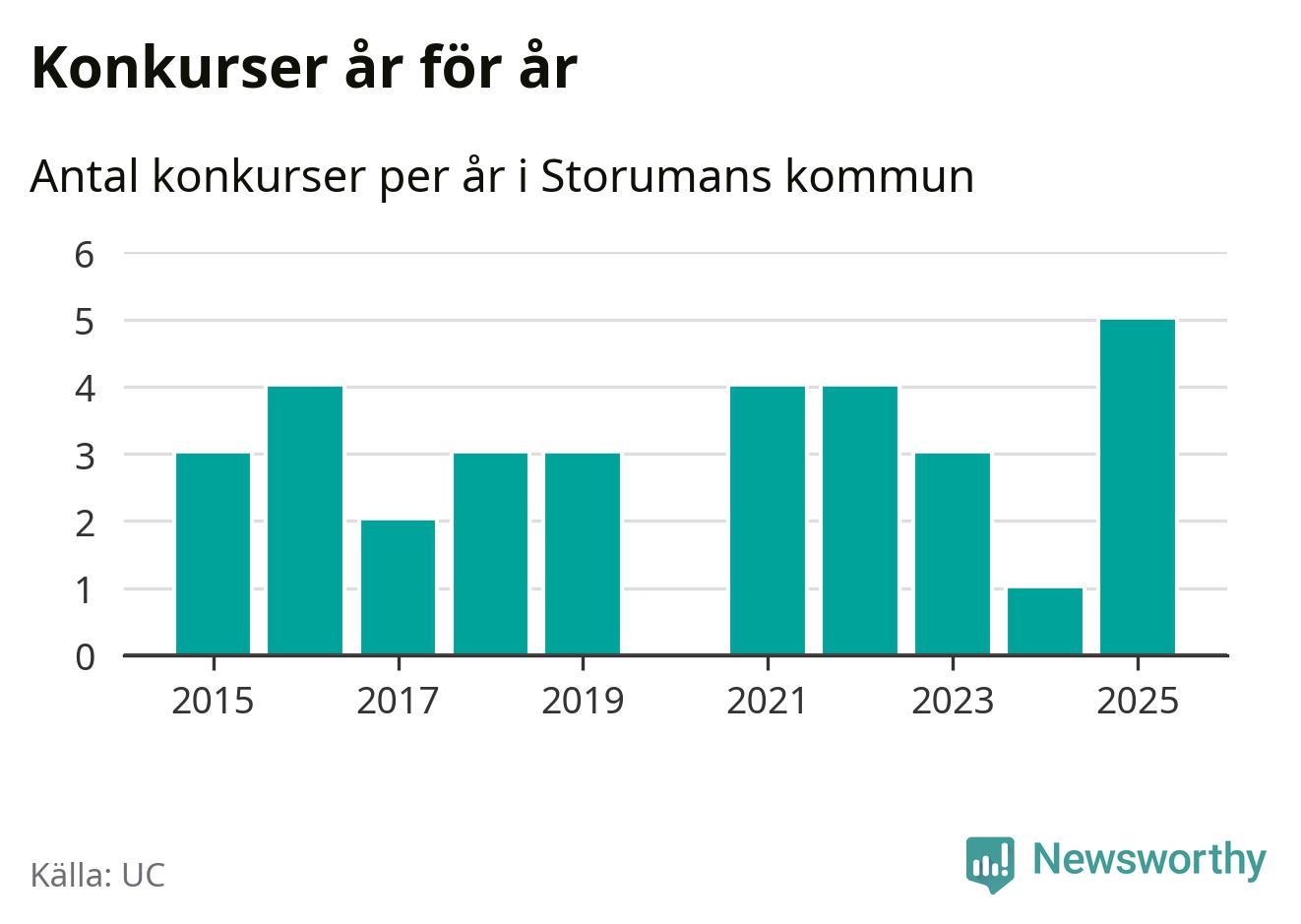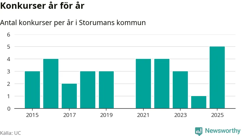 Under år 2025 gick sammanlagt fem bolag med säte i Storumans kommun i konkurs. Det är det högsta antalet sedan åtminstone år 2015. Det visar ny statistik från UC.