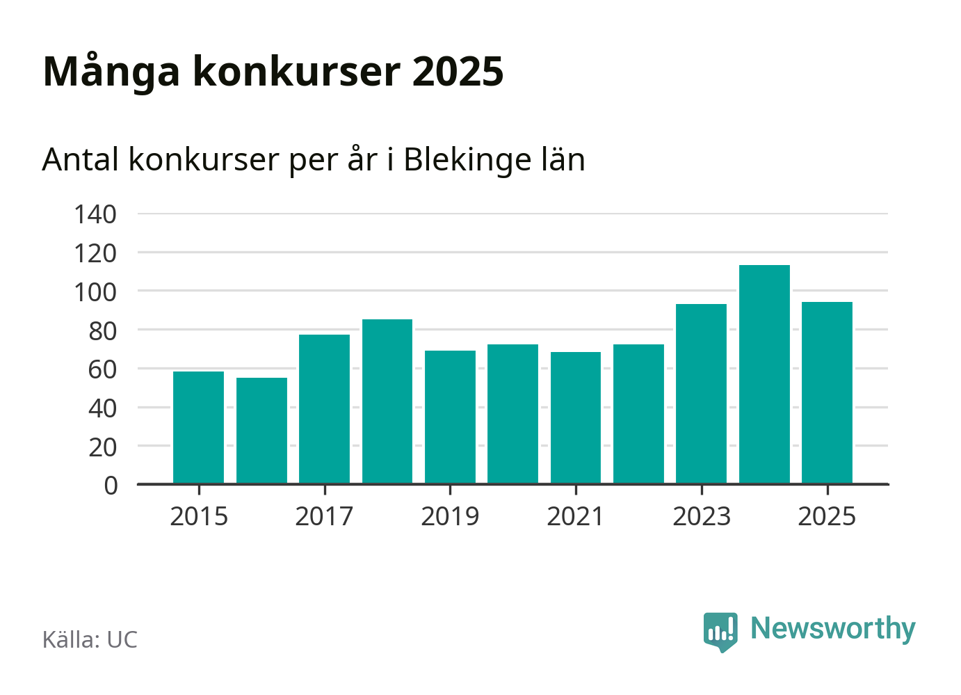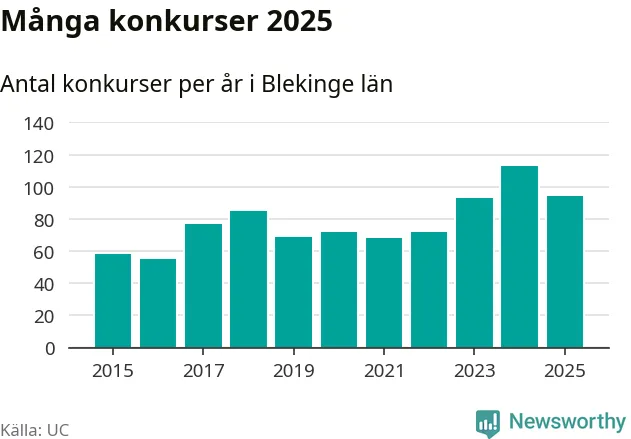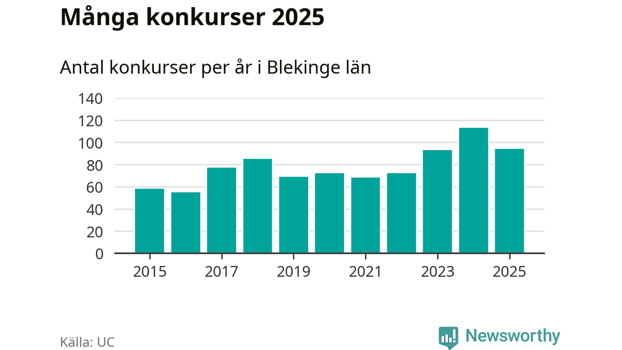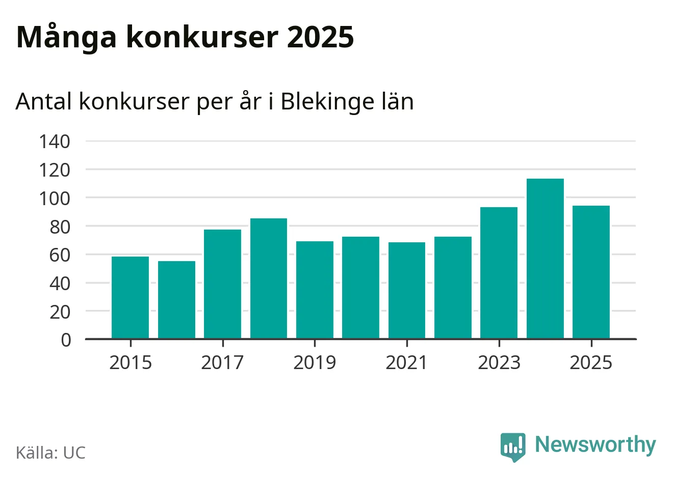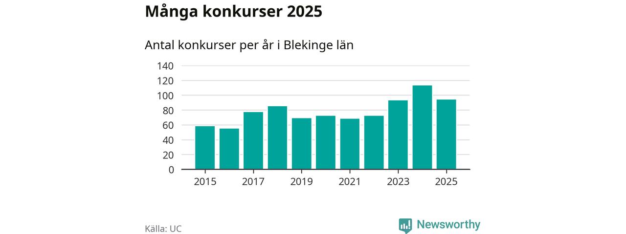 Under år 2025 gick sammanlagt 94 bolag med säte i Blekinge län i konkurs. Det är 19 färre än året innan då 113 bolag gick i konkurs. Toppåret, sedan 2015, var just 2024 sett till antalet konkursföretag. Det visar ny statistik från UC.