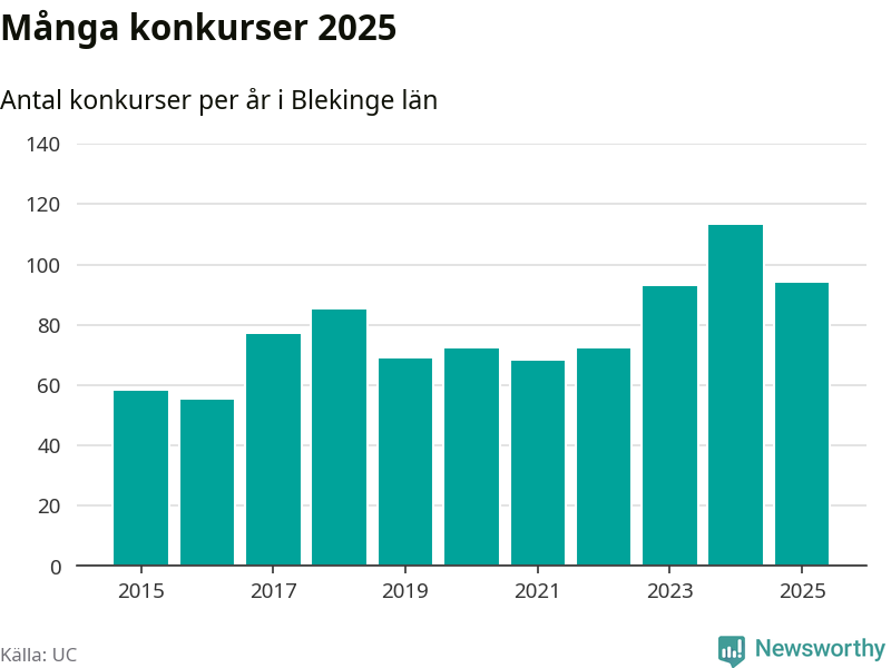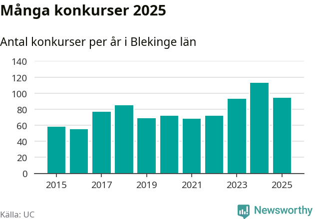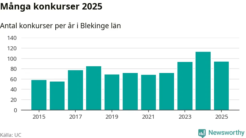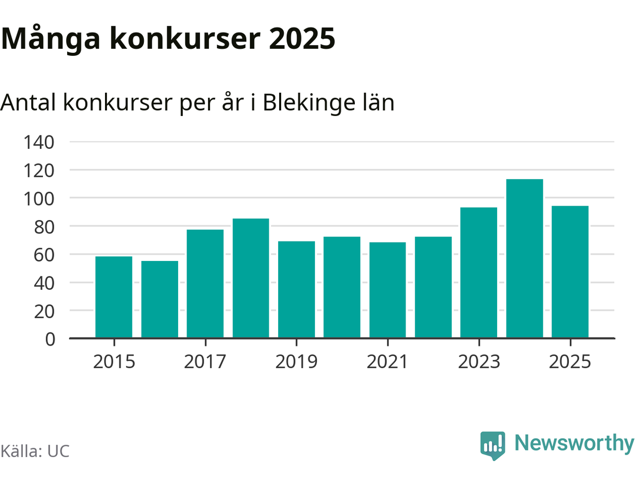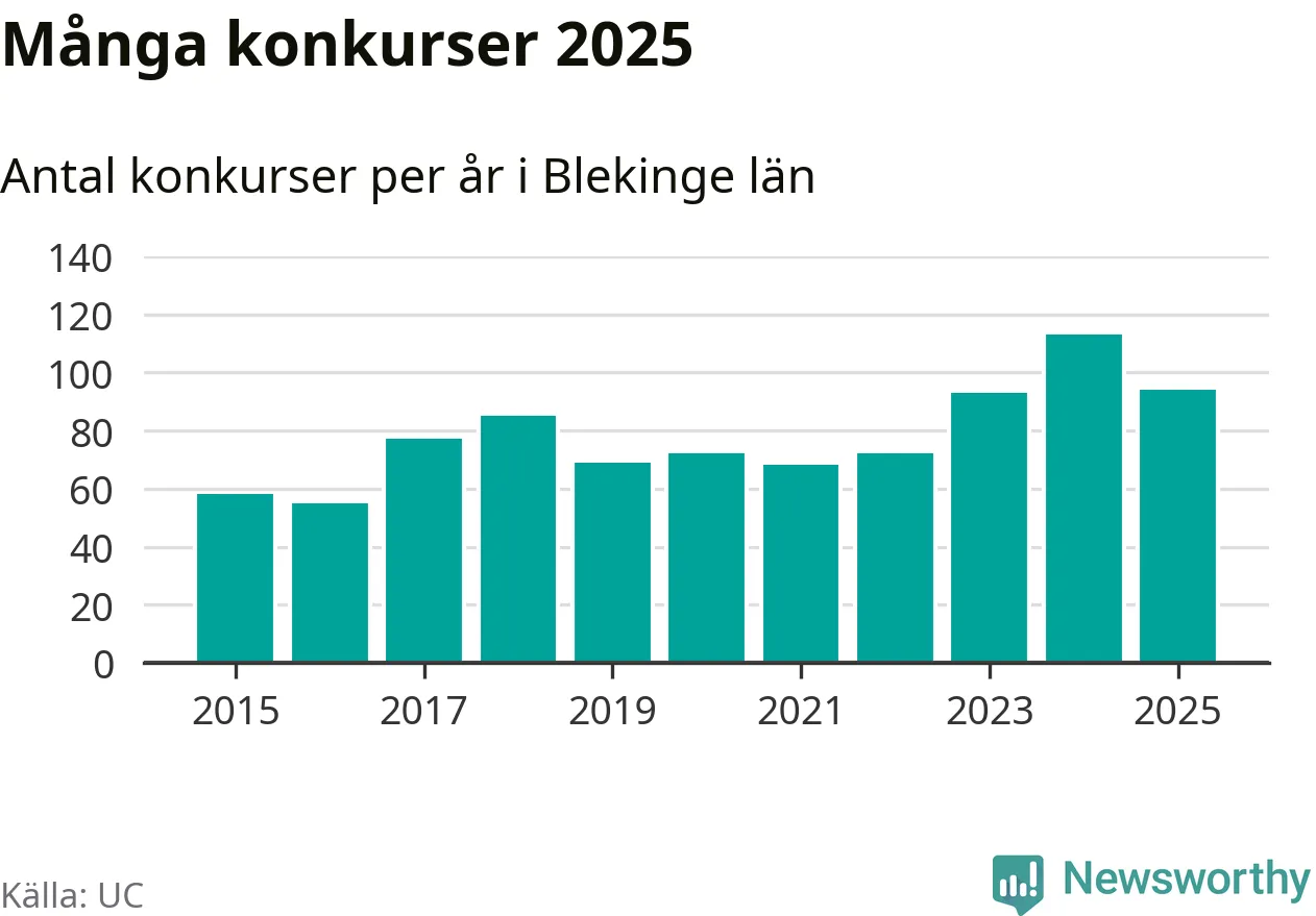 Under år 2025 gick sammanlagt 94 bolag med säte i Blekinge län i konkurs. Det är 19 färre än året innan då 113 bolag gick i konkurs. Toppåret, sedan 2015, var just 2024 sett till antalet konkursföretag. Det visar ny statistik från UC.