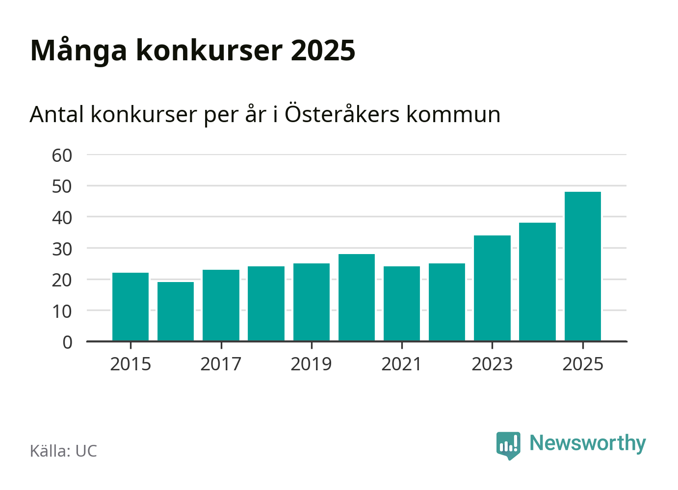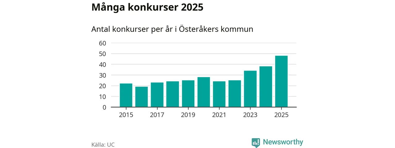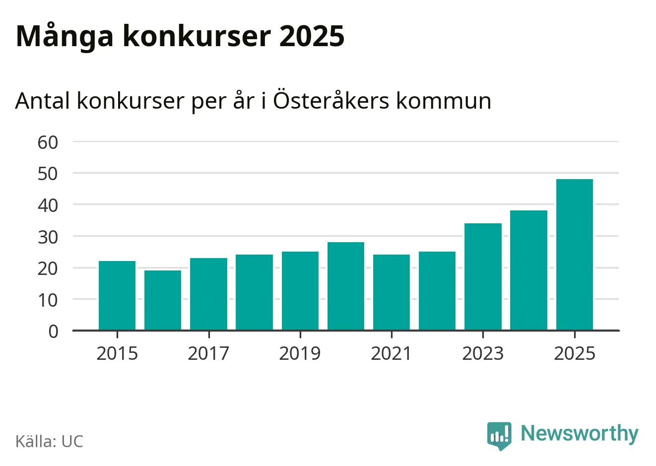 Under år 2025 gick sammanlagt 48 bolag med säte i Österåkers kommun i konkurs. Det är det högsta antalet sedan åtminstone år 2015. Det visar ny statistik från UC.