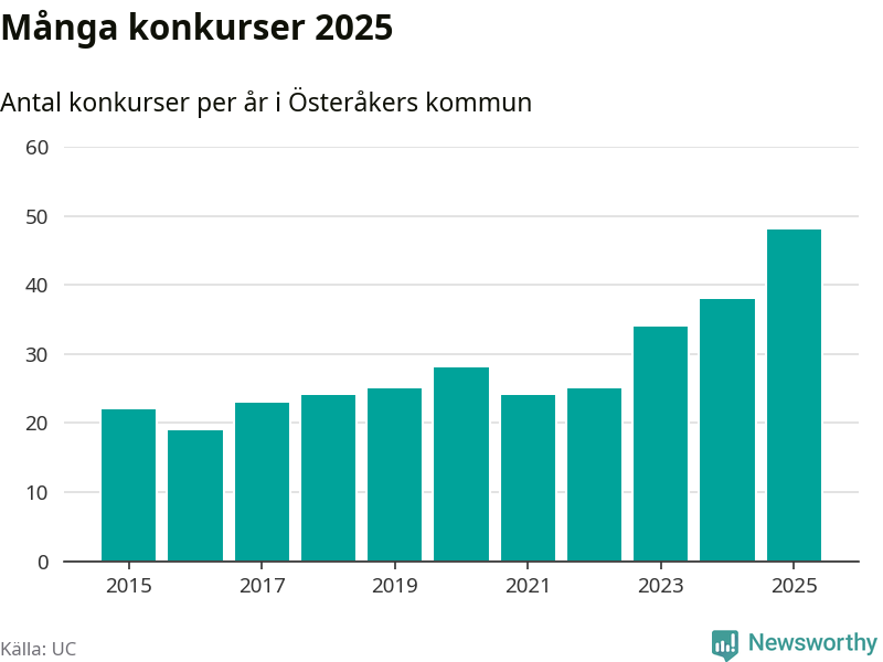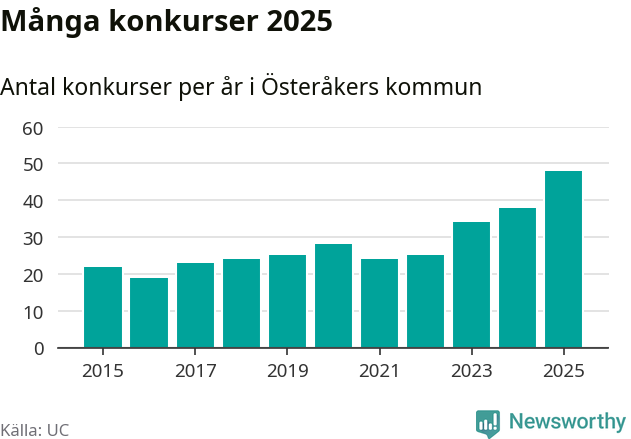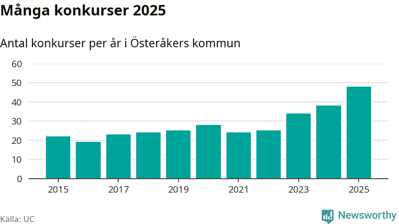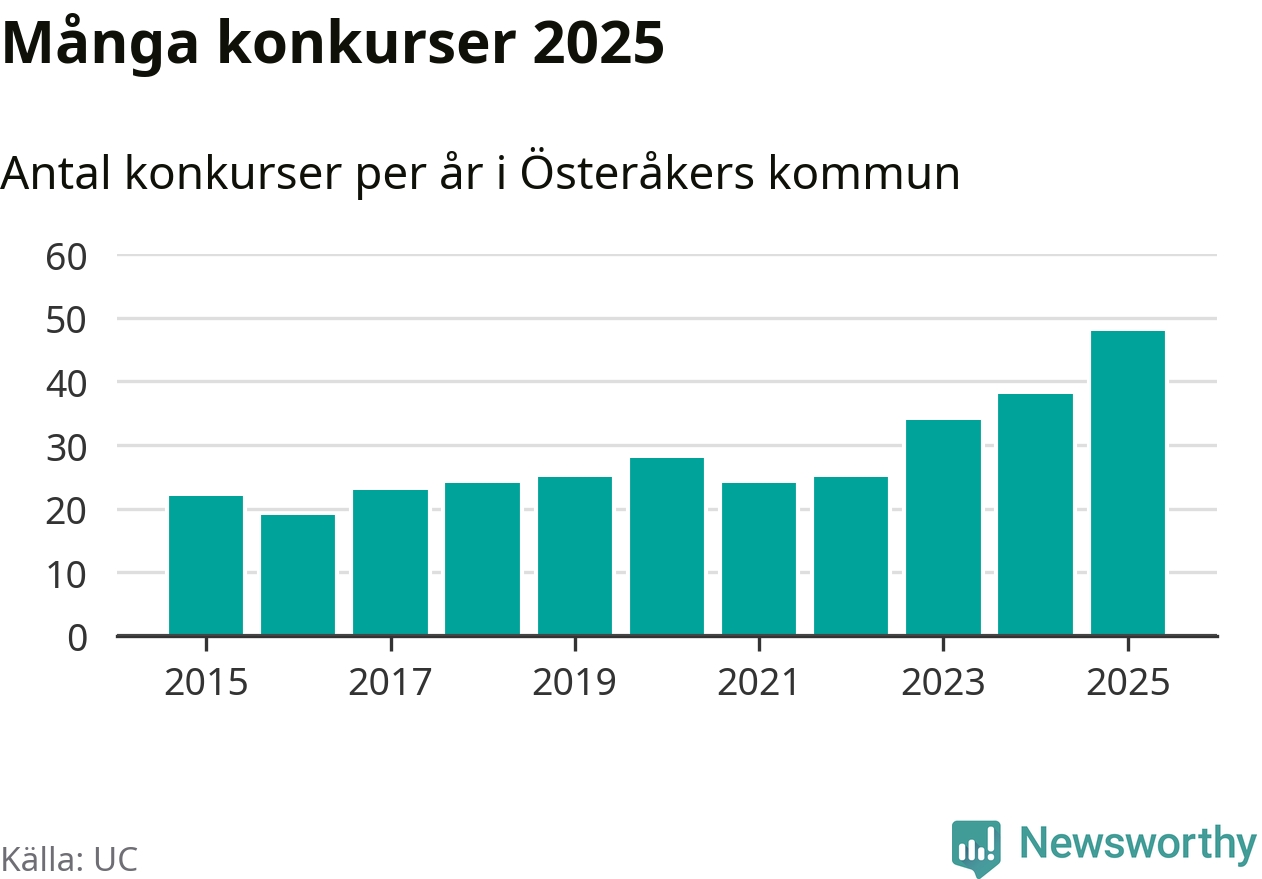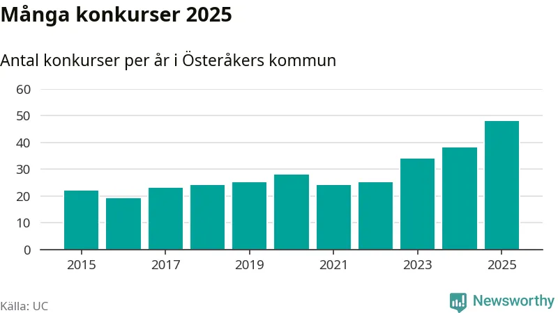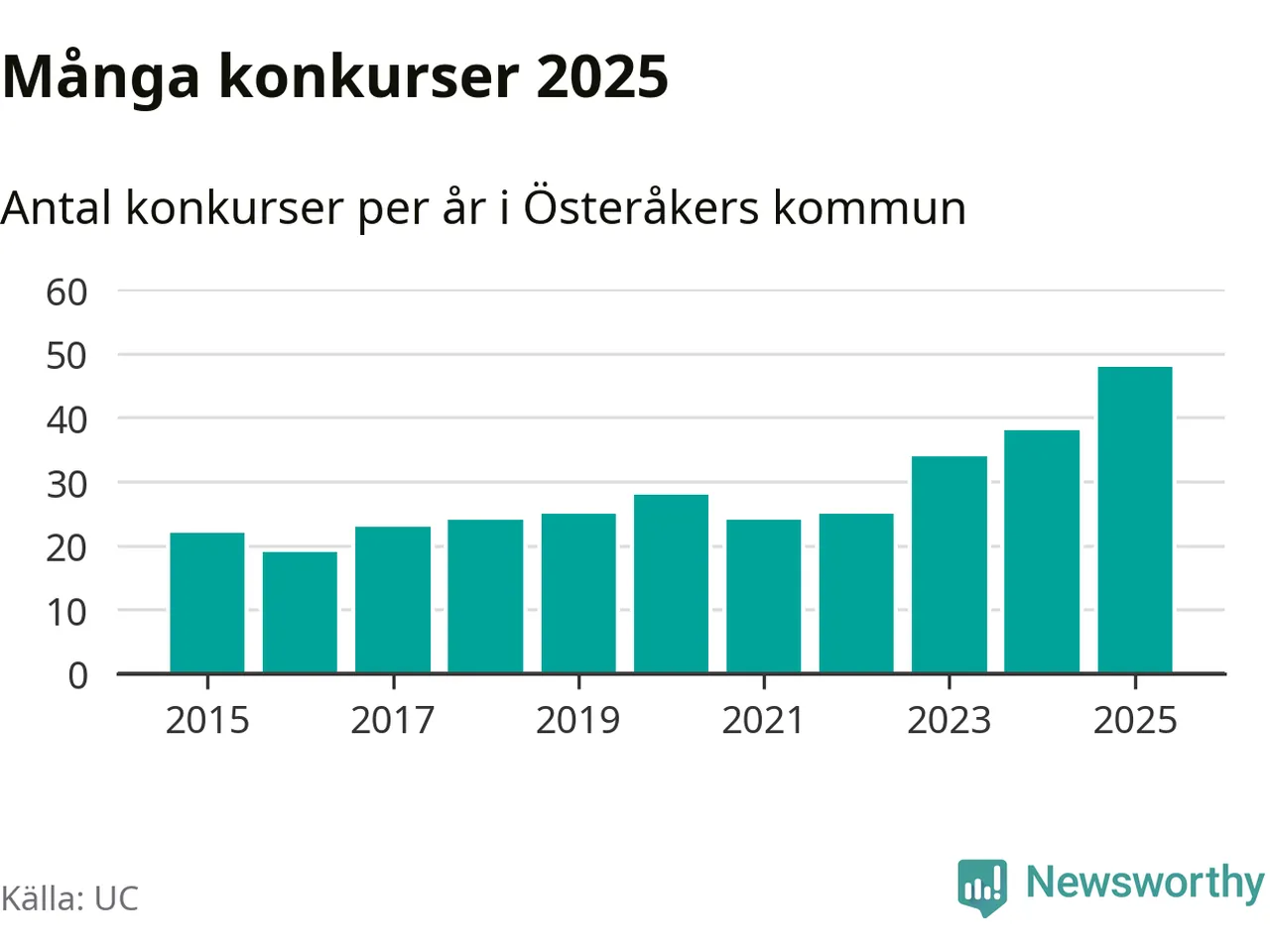 Under år 2025 gick sammanlagt 48 bolag med säte i Österåkers kommun i konkurs. Det är det högsta antalet sedan åtminstone år 2015. Det visar ny statistik från UC.