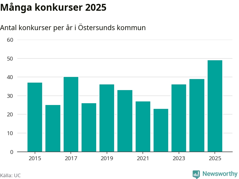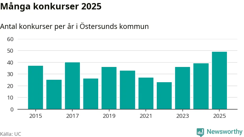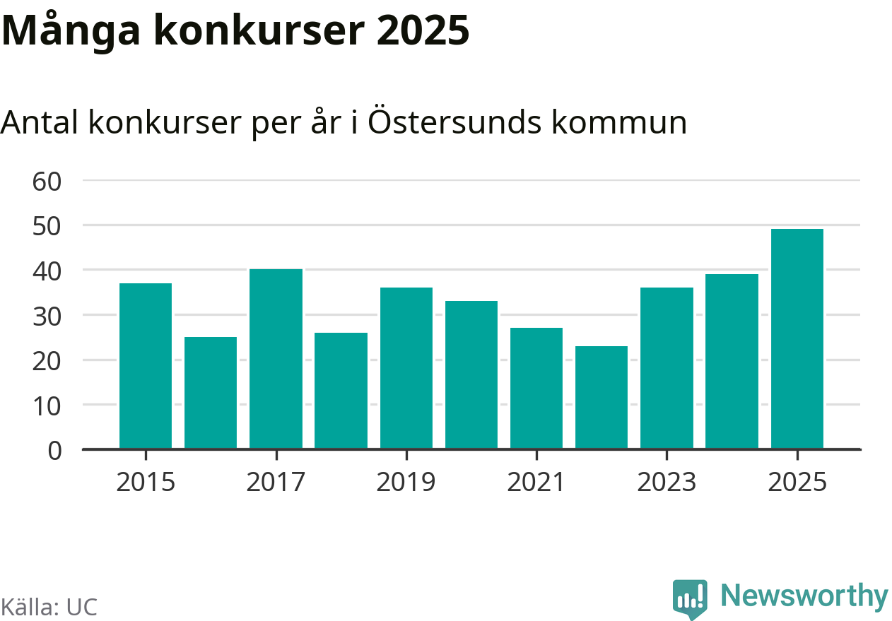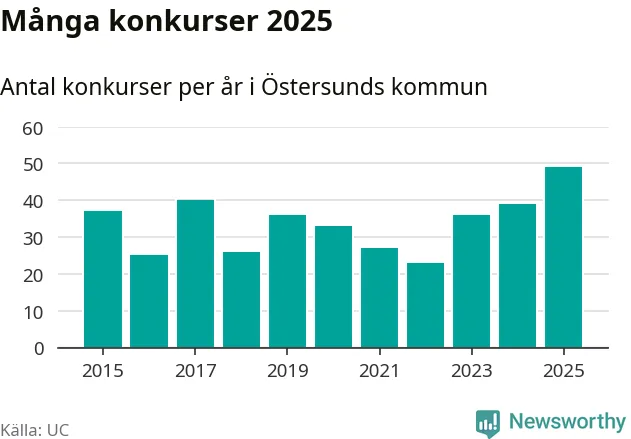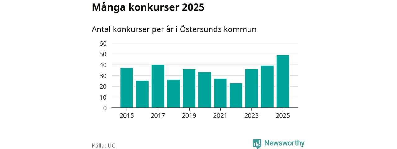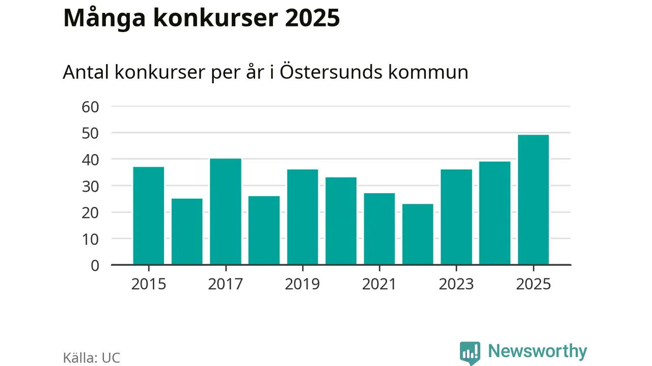 Under år 2025 gick sammanlagt 49 bolag med säte i Östersunds kommun i konkurs. Det är det högsta antalet sedan åtminstone år 2015. Det visar ny statistik från UC.