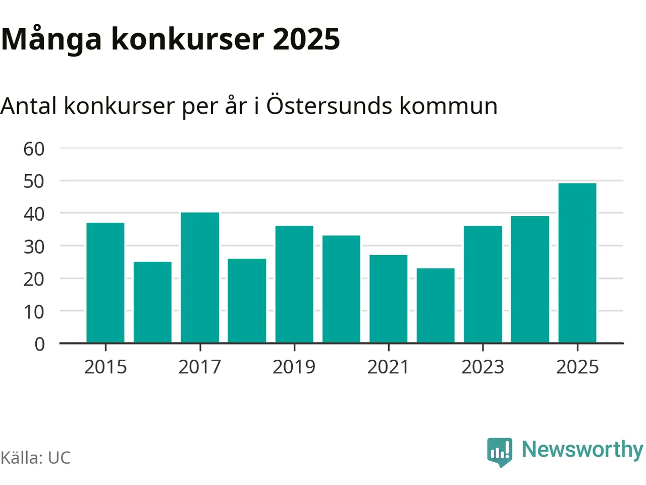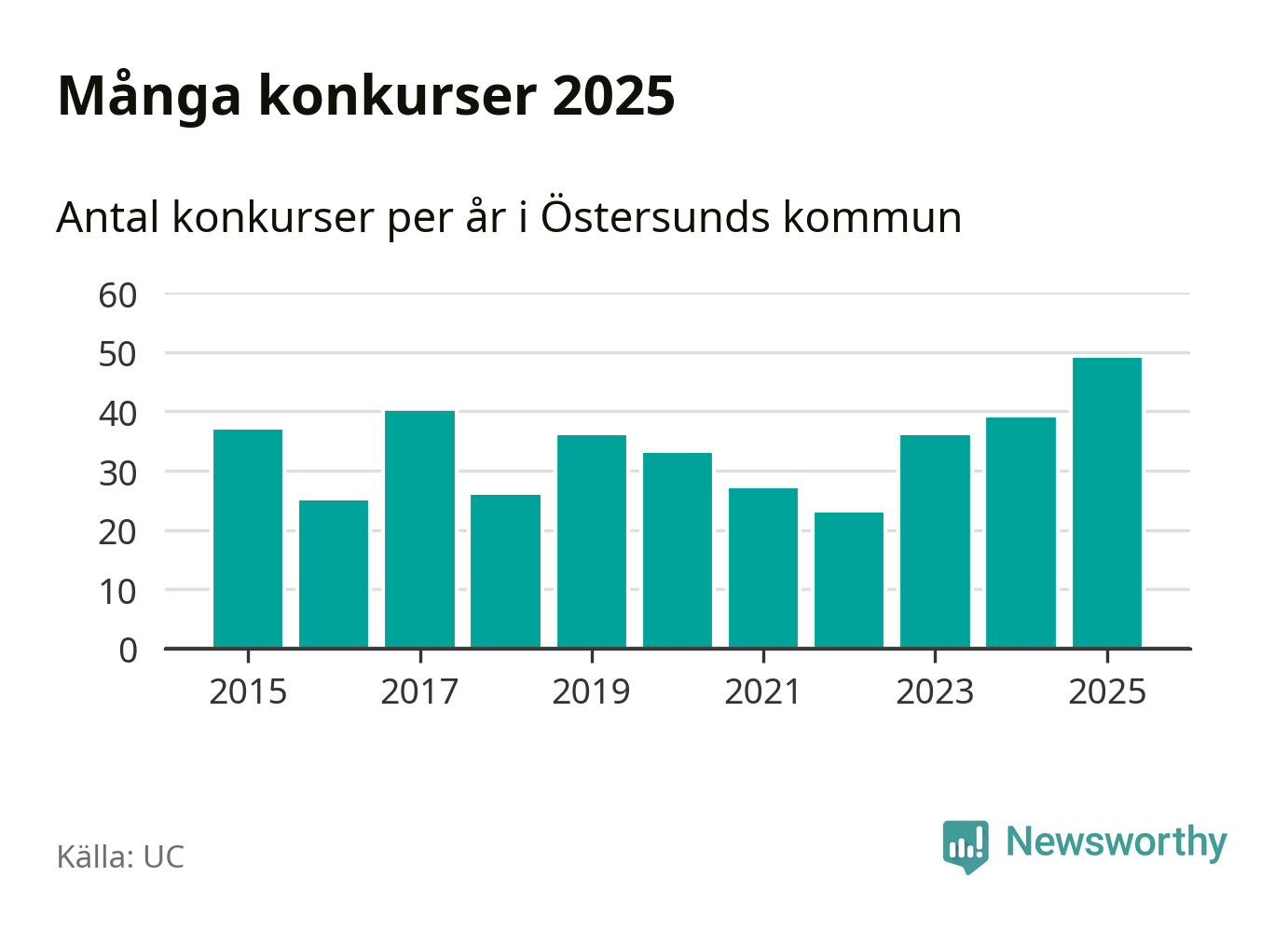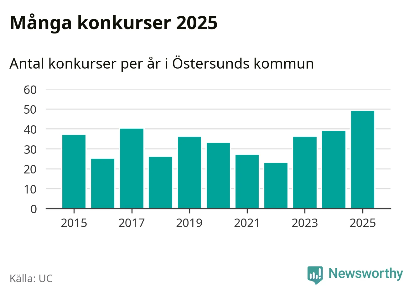 Under år 2025 gick sammanlagt 49 bolag med säte i Östersunds kommun i konkurs. Det är det högsta antalet sedan åtminstone år 2015. Det visar ny statistik från UC.