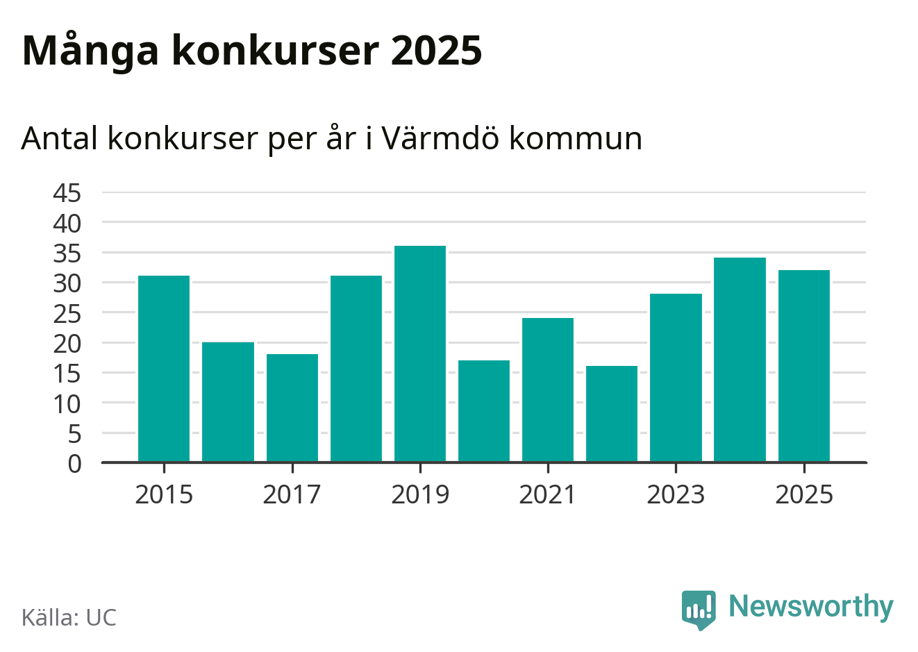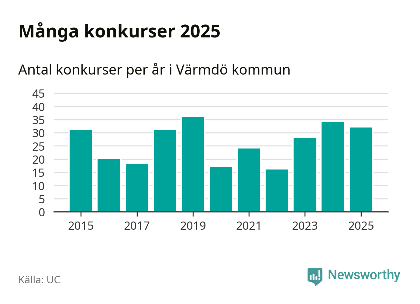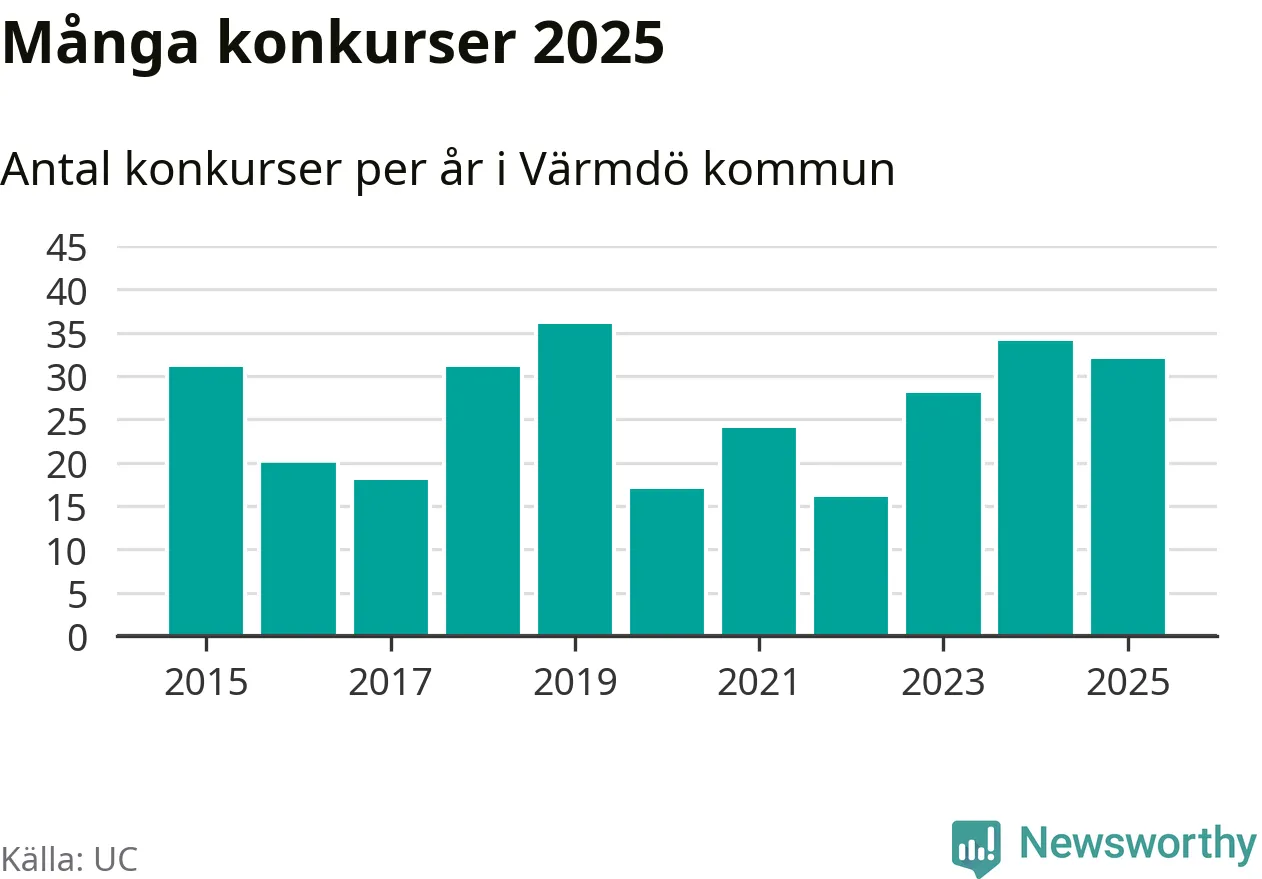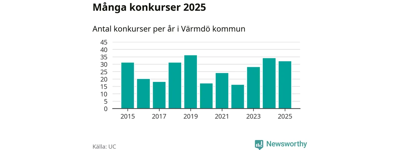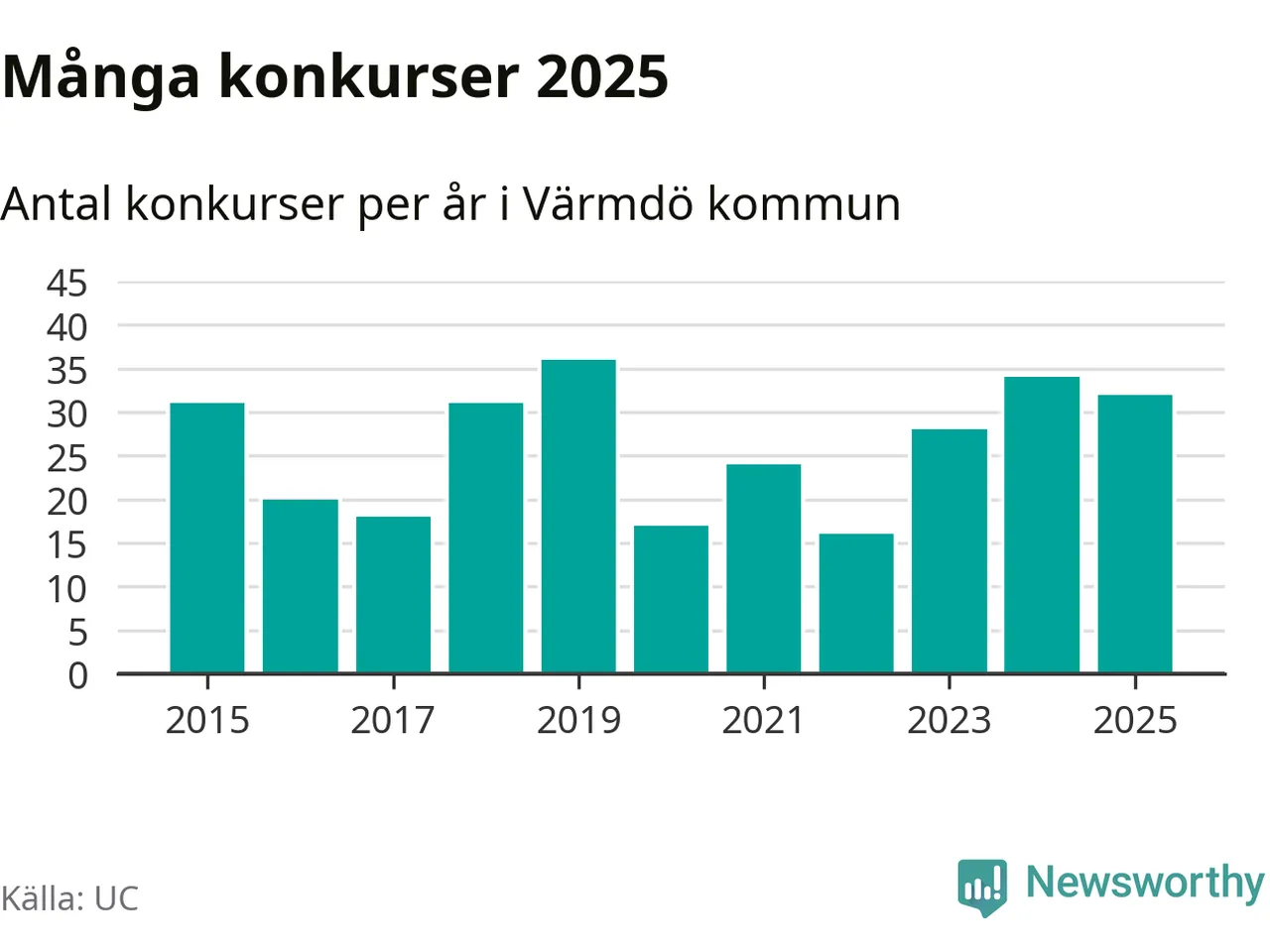 Under år 2025 gick sammanlagt 32 bolag med säte i Värmdö kommun i konkurs. Det är två färre än året innan. Toppåret, sedan 2015, var 2019 då 36 bolag gick i konkurs. Det visar ny statistik från UC.