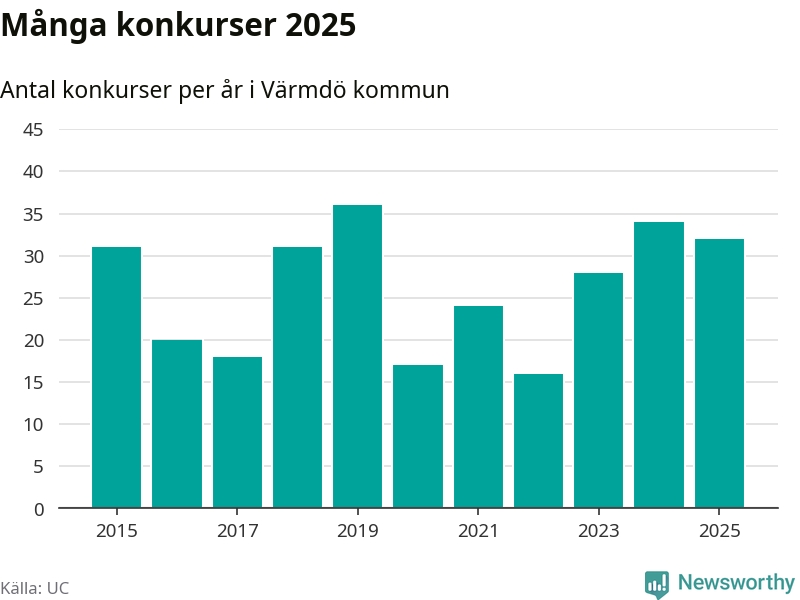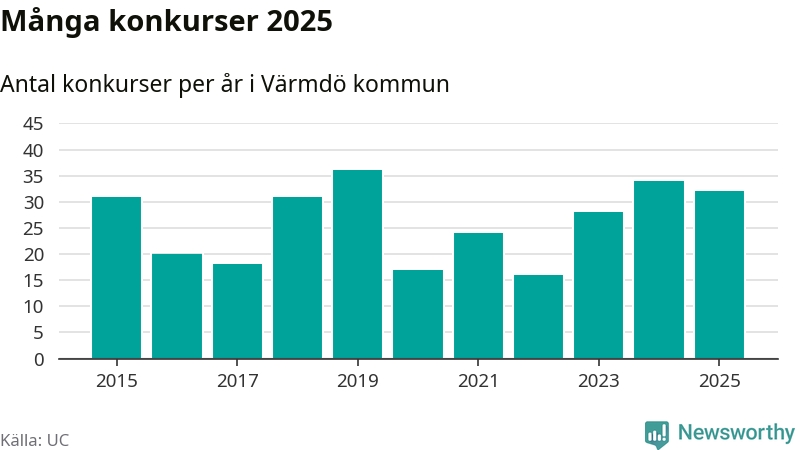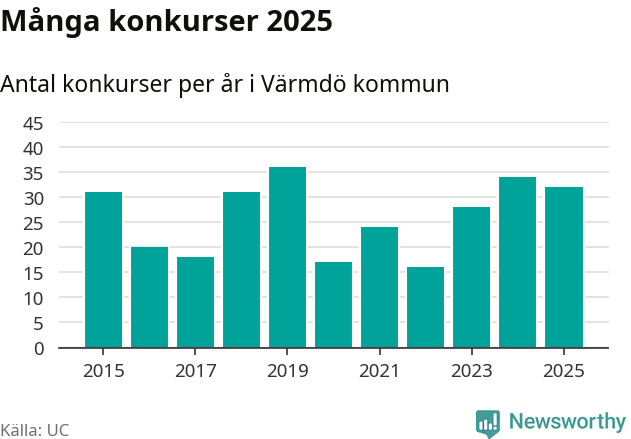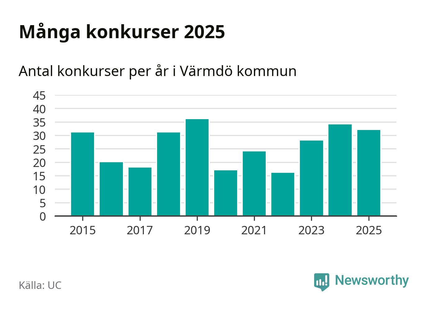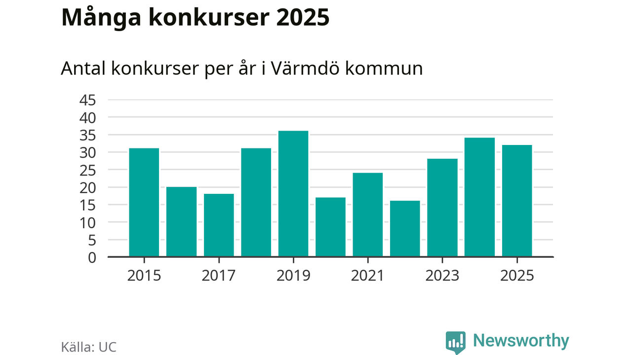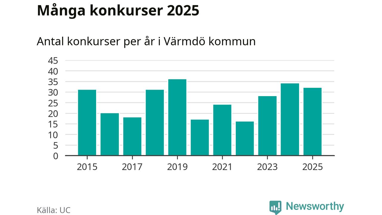 Under år 2025 gick sammanlagt 32 bolag med säte i Värmdö kommun i konkurs. Det är två färre än året innan. Toppåret, sedan 2015, var 2019 då 36 bolag gick i konkurs. Det visar ny statistik från UC.