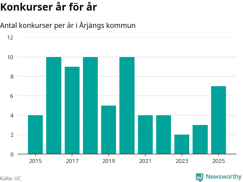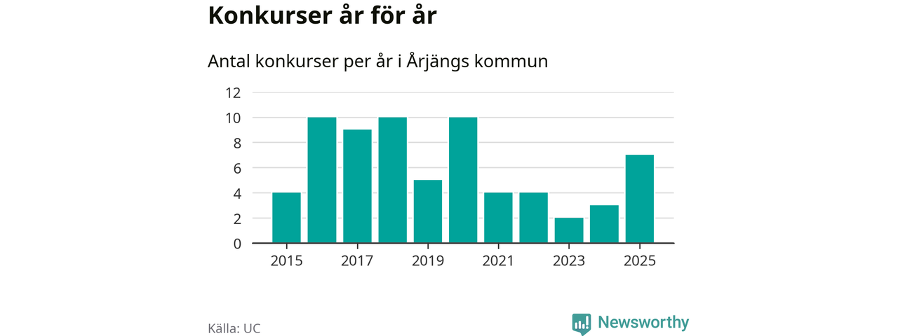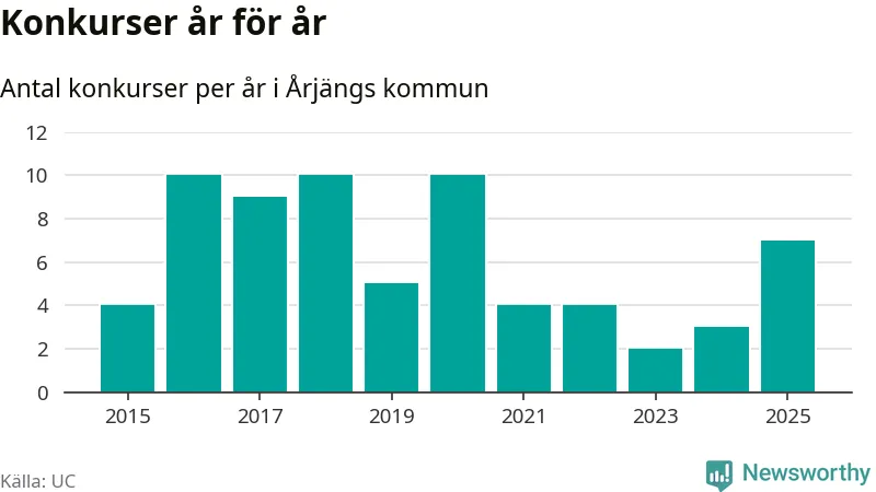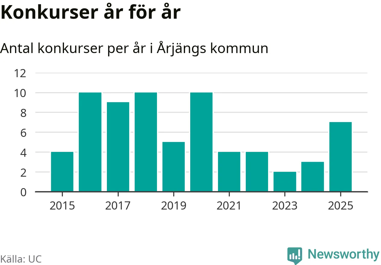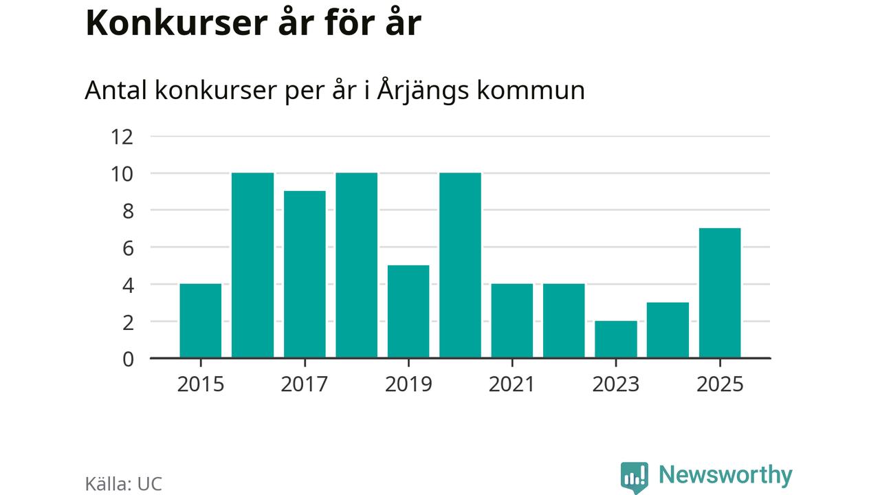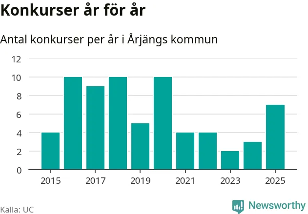 Under år 2025 gick sammanlagt sju bolag med säte i Årjängs kommun i konkurs. Det är det högsta antalet sedan år 2020. Det visar ny statistik från UC.