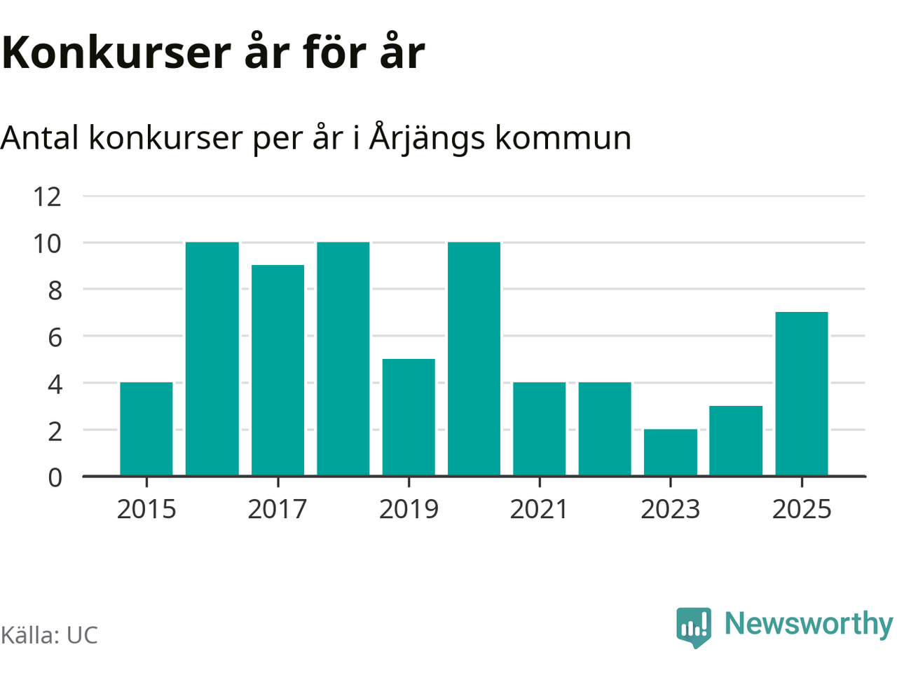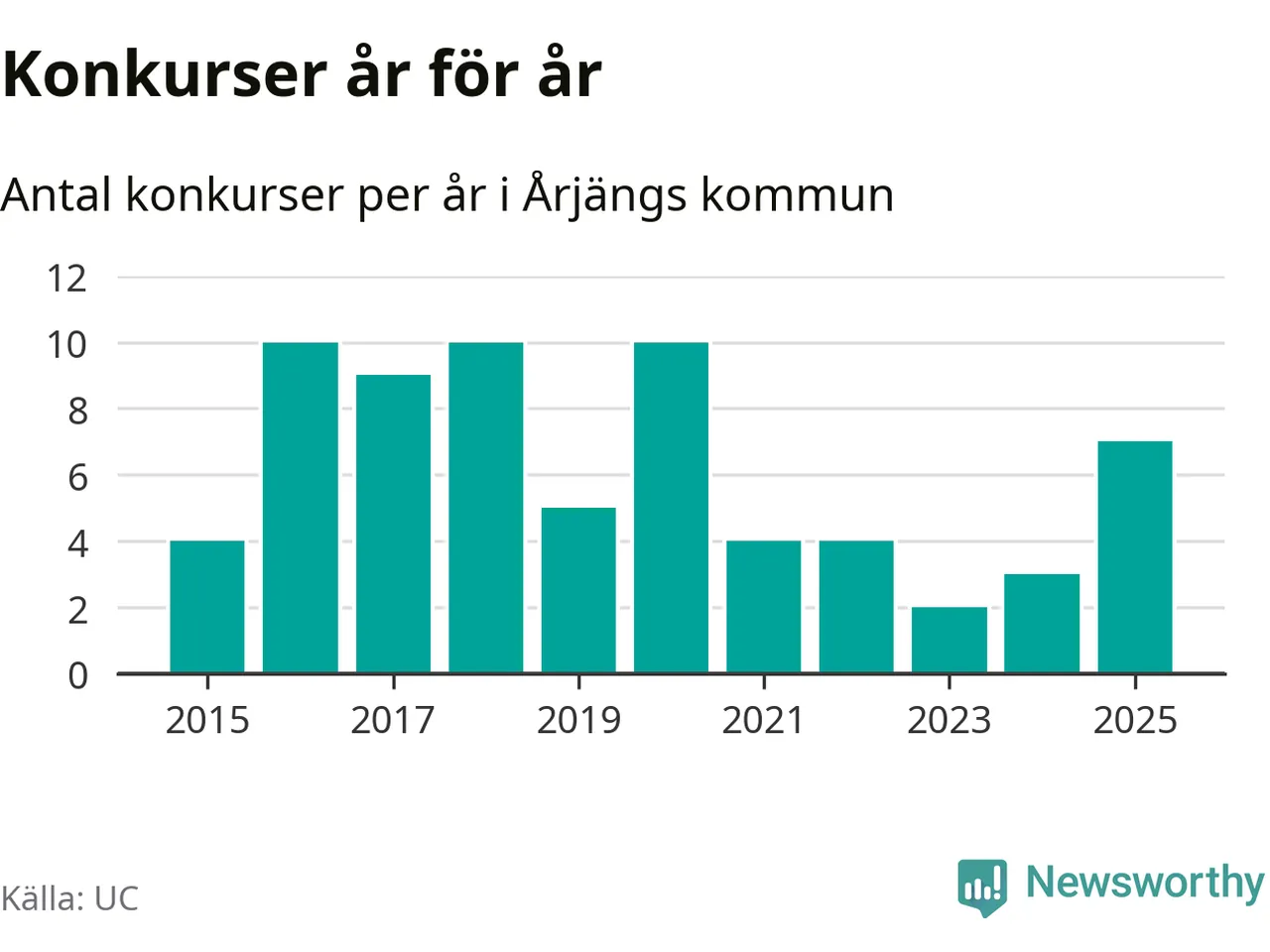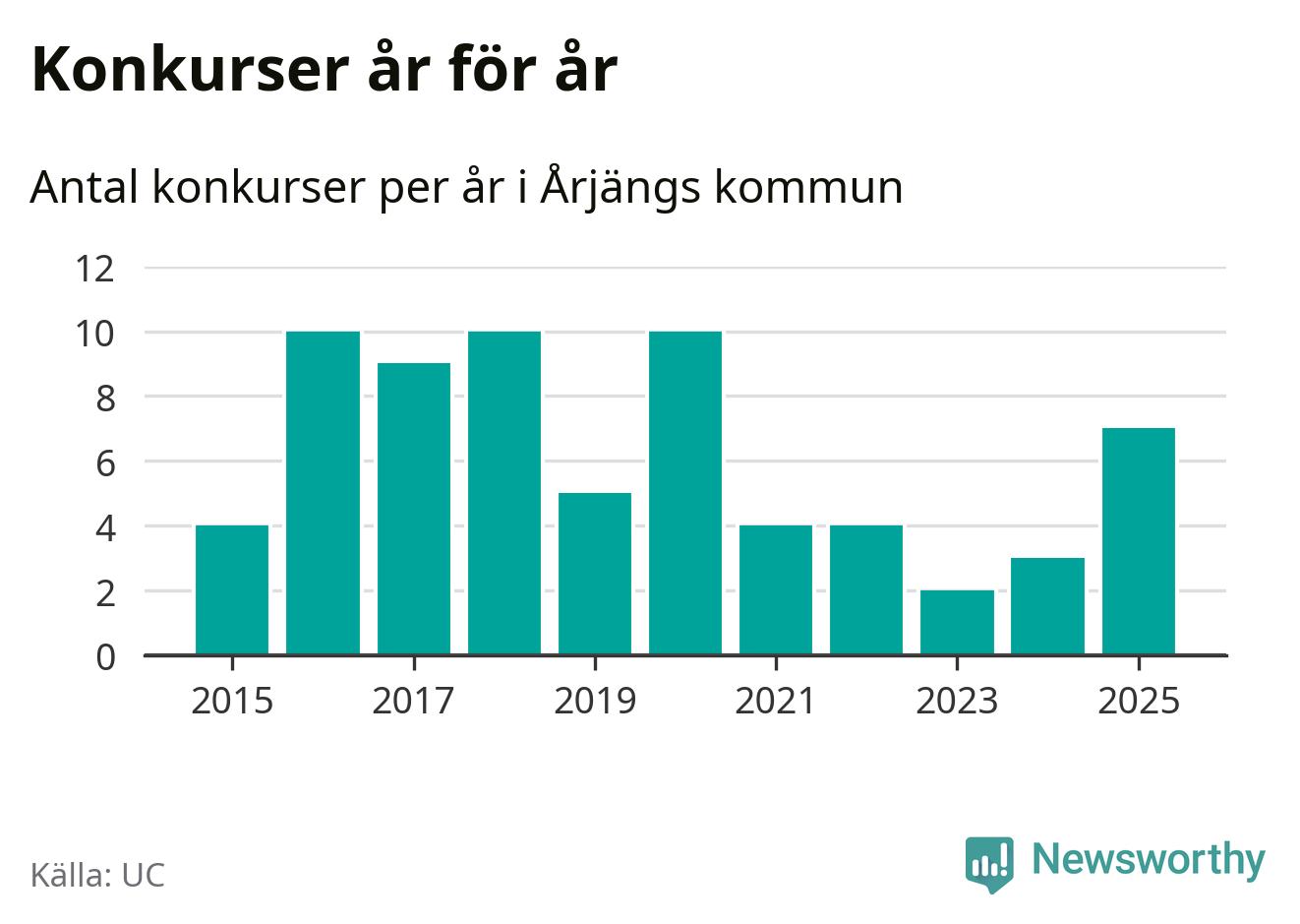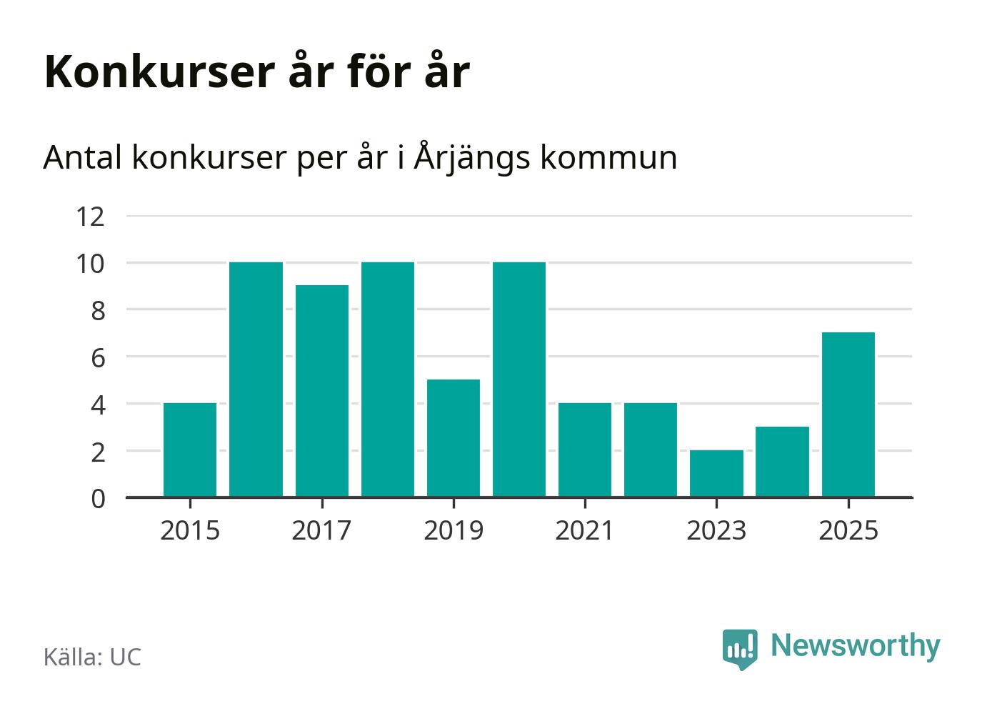 Under år 2025 gick sammanlagt sju bolag med säte i Årjängs kommun i konkurs. Det är det högsta antalet sedan år 2020. Det visar ny statistik från UC.