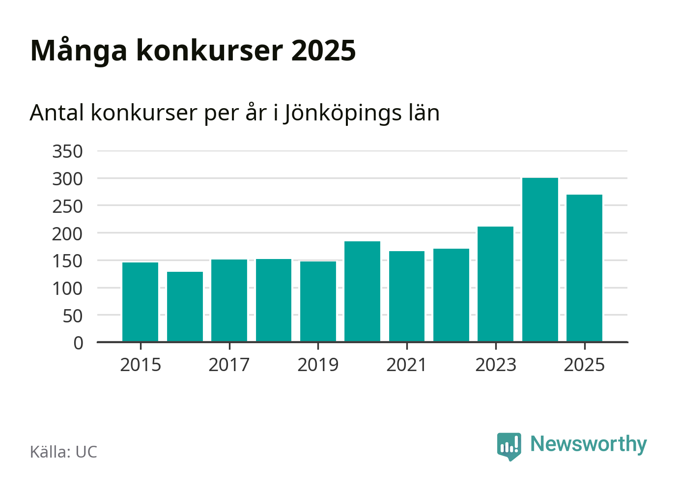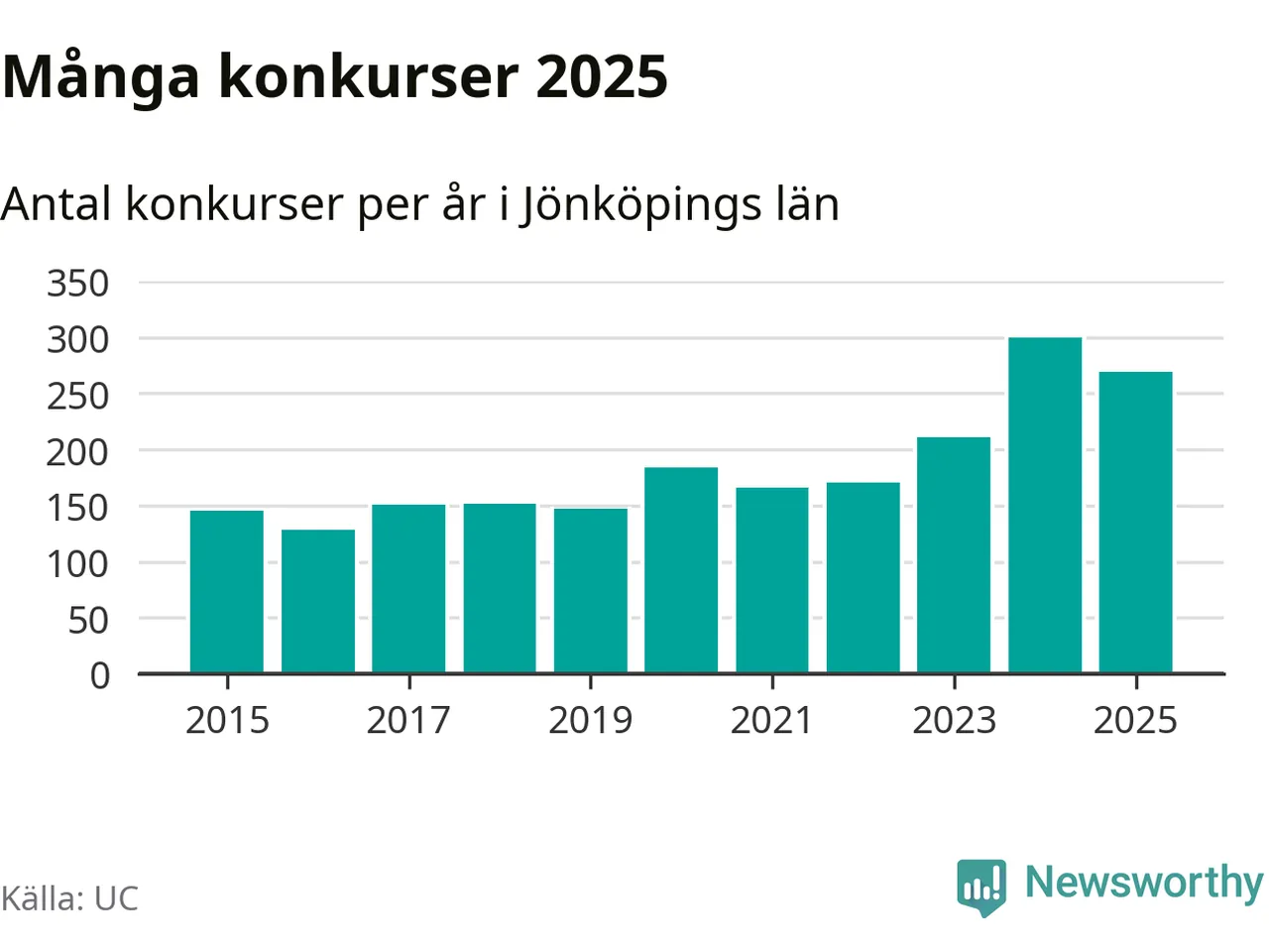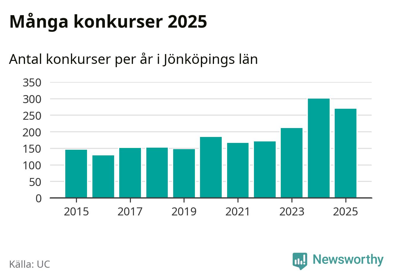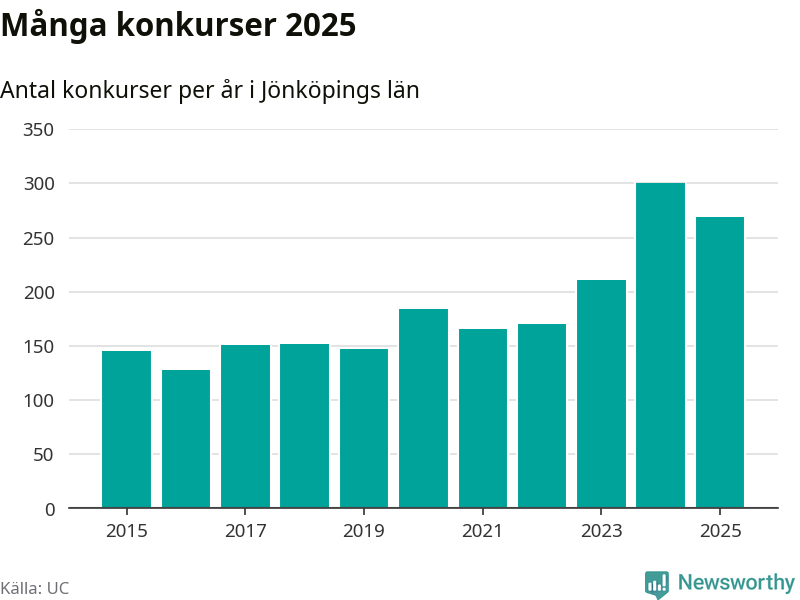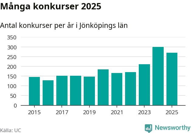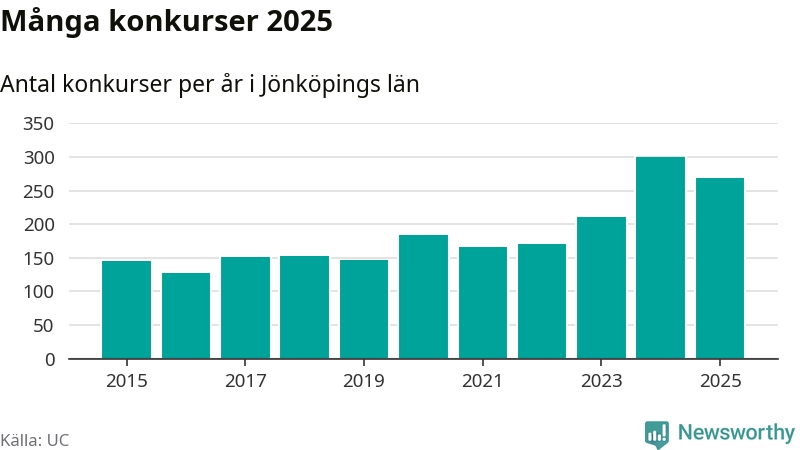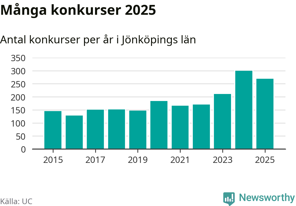 Under år 2025 gick sammanlagt 269 bolag med säte i Jönköpings län i konkurs. Det är 31 färre än året innan då 300 bolag gick i konkurs. Toppåret, sedan 2015, var just 2024 sett till antalet konkursföretag. Det visar ny statistik från UC.