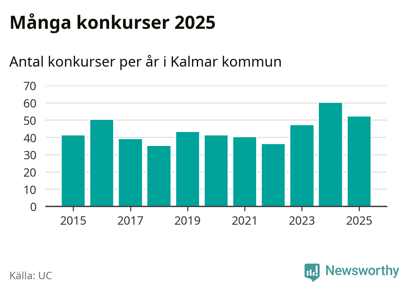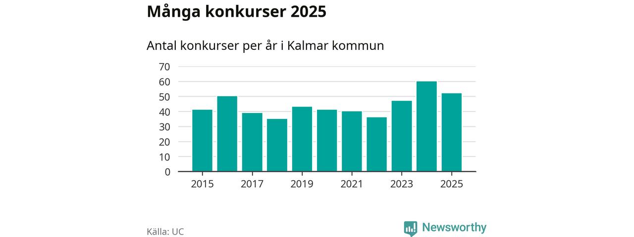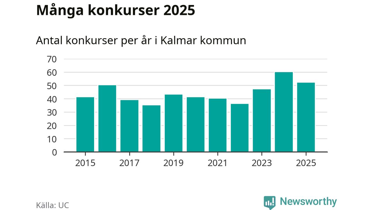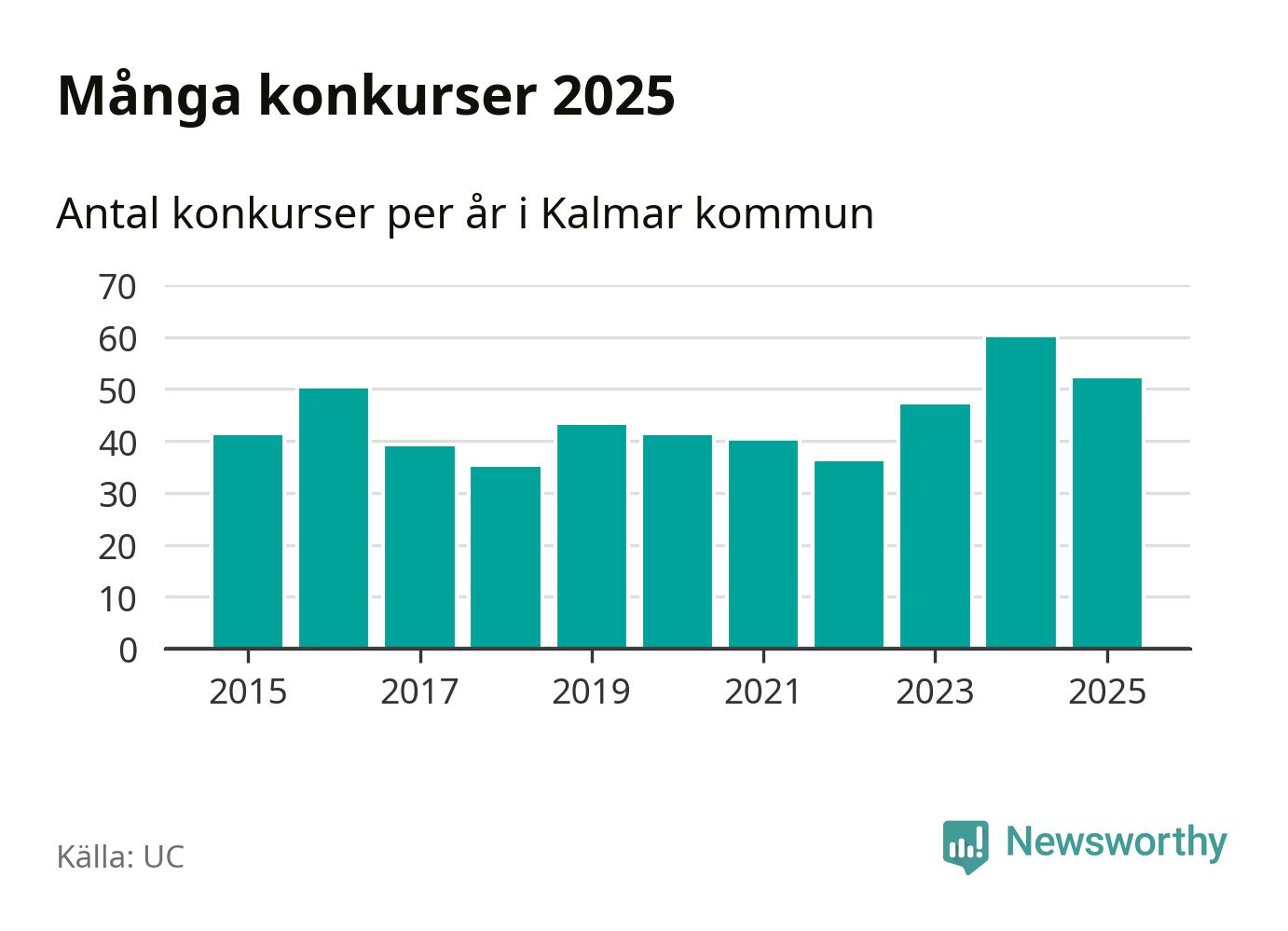 Under år 2025 gick sammanlagt 52 bolag med säte i Kalmar kommun i konkurs. Det är åtta färre än året innan då 60 bolag gick i konkurs. Toppåret, sedan 2015, var just 2024 sett till antalet konkursföretag. Det visar ny statistik från UC.