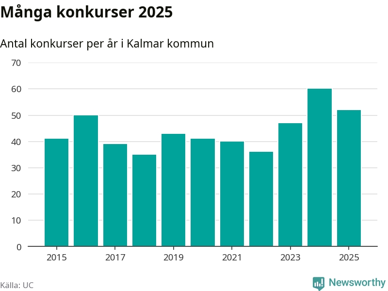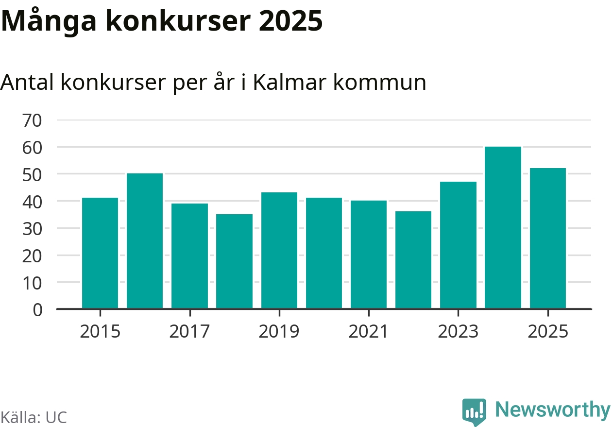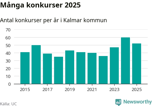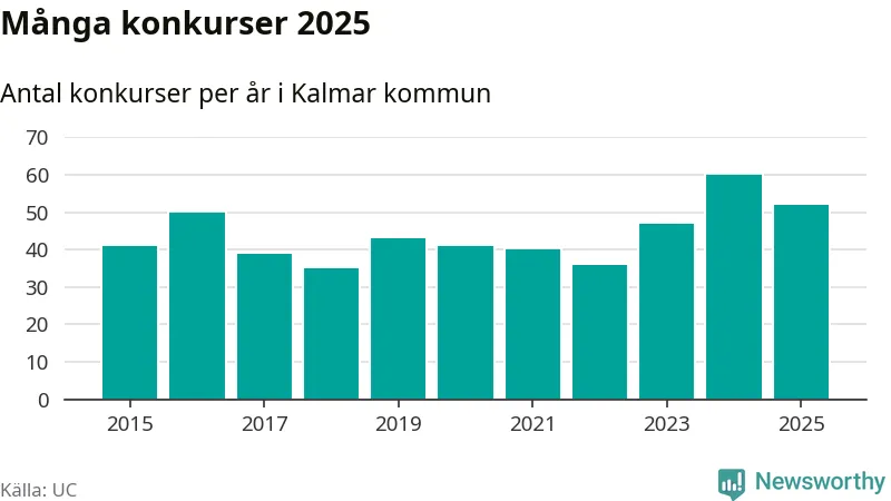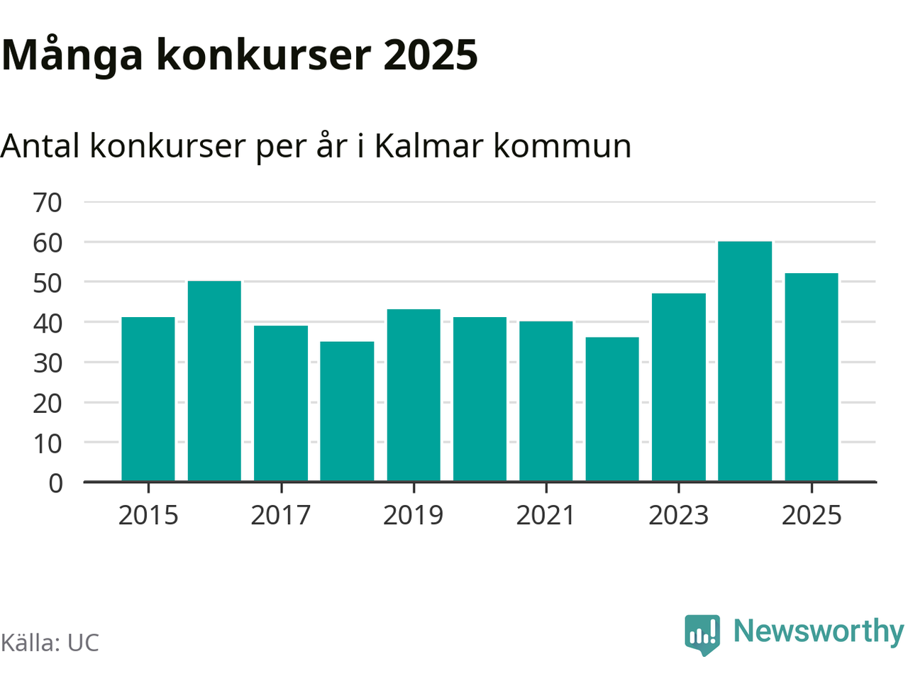 Under år 2025 gick sammanlagt 52 bolag med säte i Kalmar kommun i konkurs. Det är åtta färre än året innan då 60 bolag gick i konkurs. Toppåret, sedan 2015, var just 2024 sett till antalet konkursföretag. Det visar ny statistik från UC.