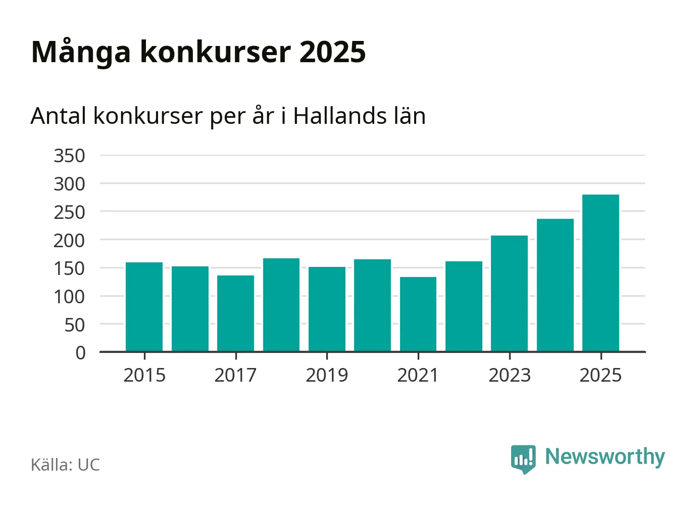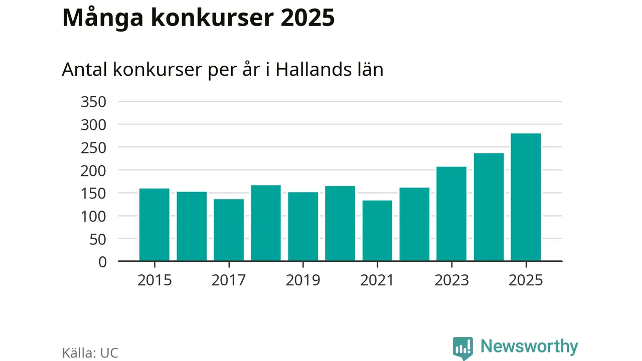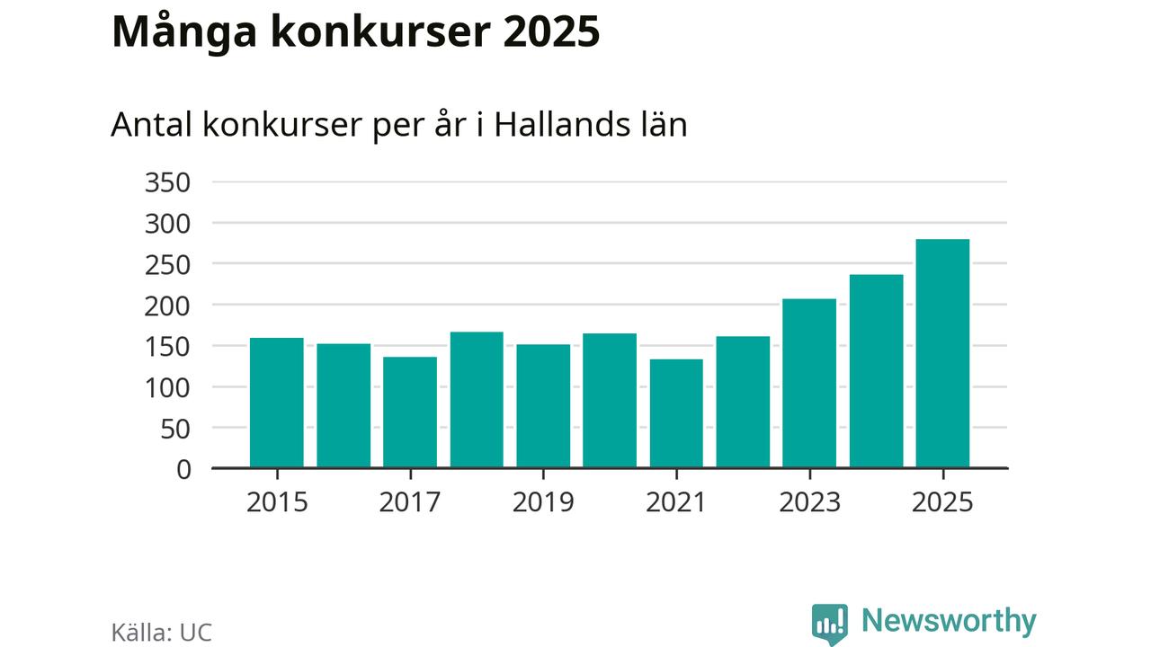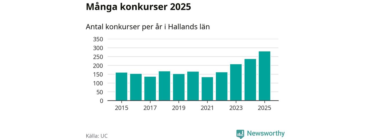 Under år 2025 gick sammanlagt 279 bolag med säte i Hallands län i konkurs. Det är det högsta antalet sedan åtminstone år 2015. Det visar ny statistik från UC.