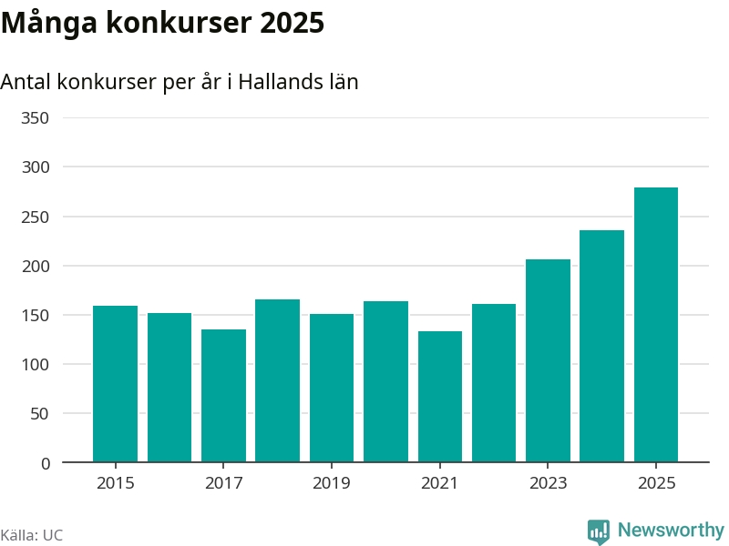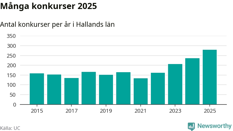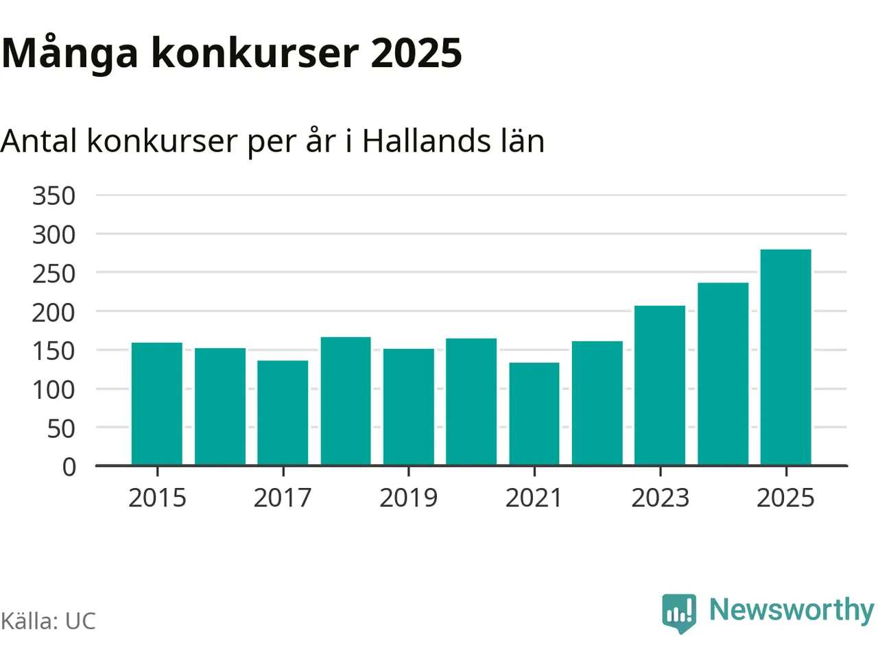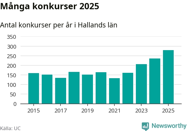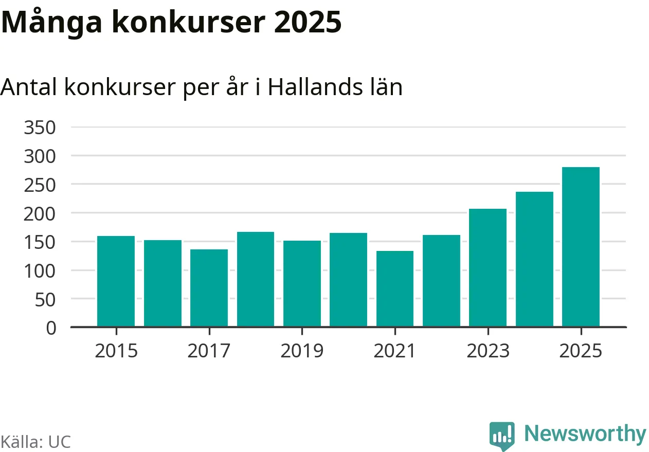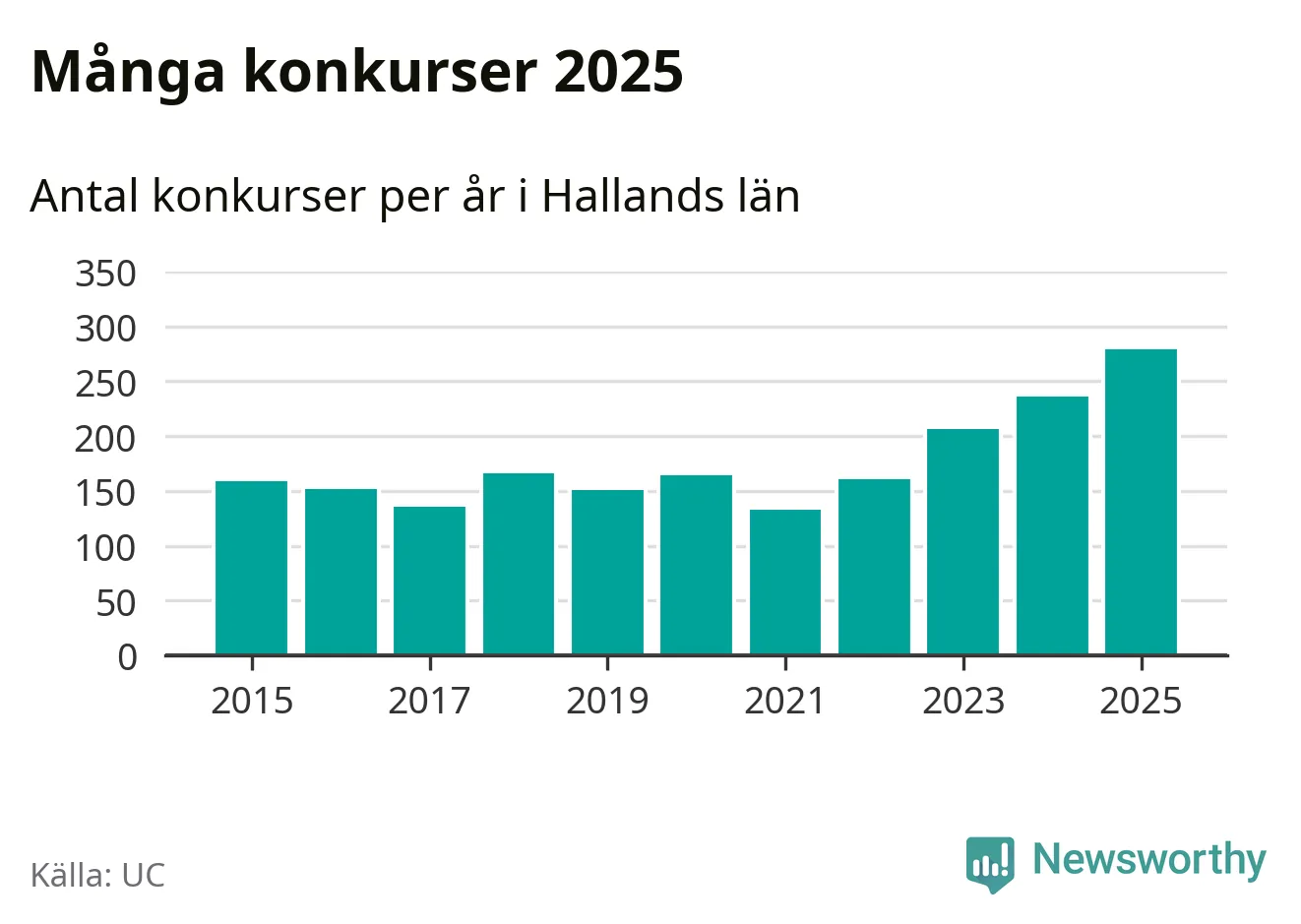 Under år 2025 gick sammanlagt 279 bolag med säte i Hallands län i konkurs. Det är det högsta antalet sedan åtminstone år 2015. Det visar ny statistik från UC.