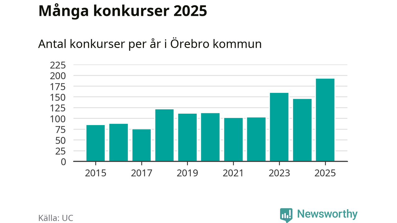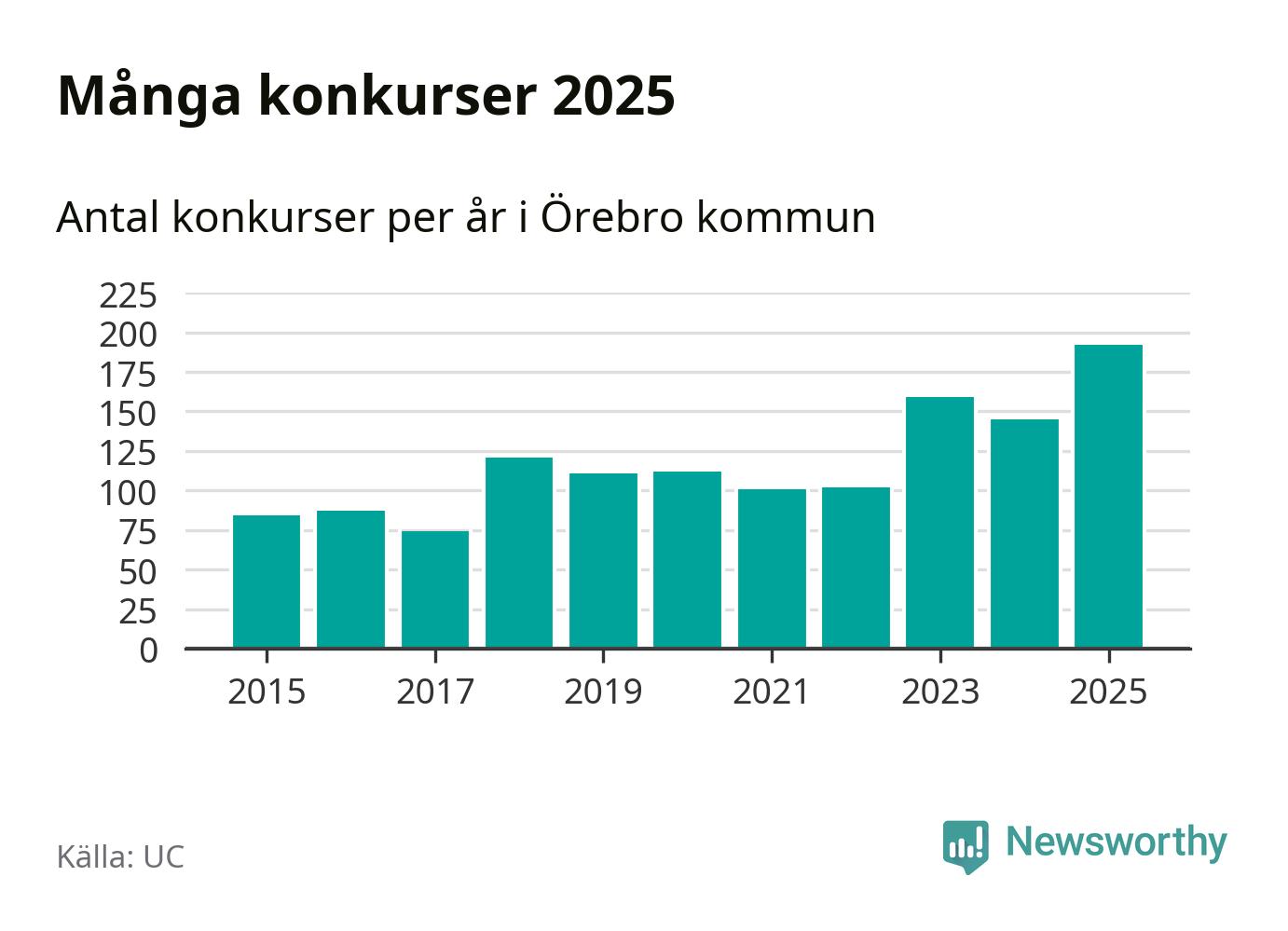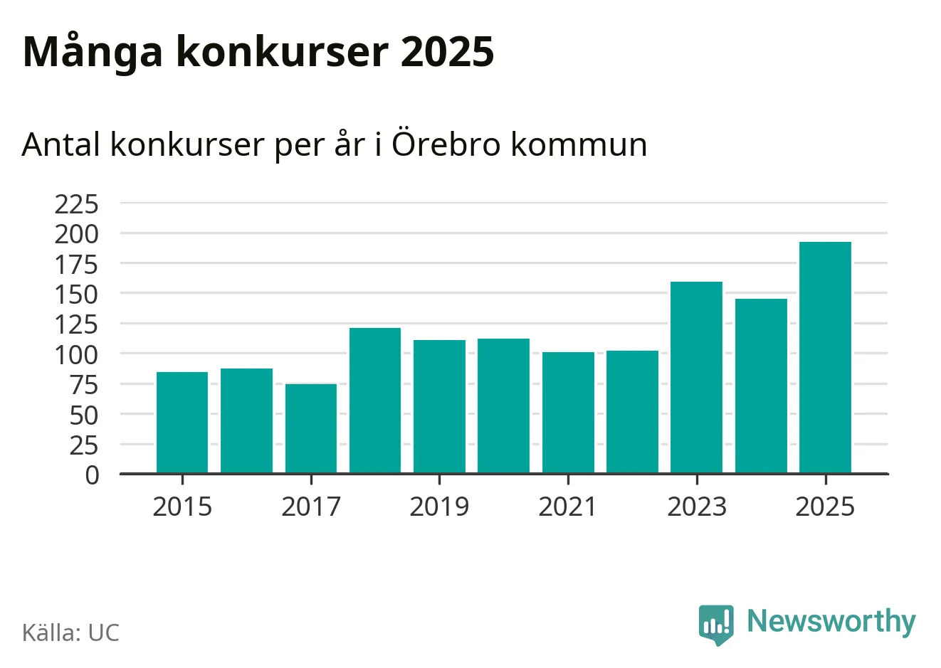 Under år 2025 gick sammanlagt 192 bolag med säte i Örebro kommun i konkurs. Det är det högsta antalet sedan åtminstone år 2015. Det visar ny statistik från UC.