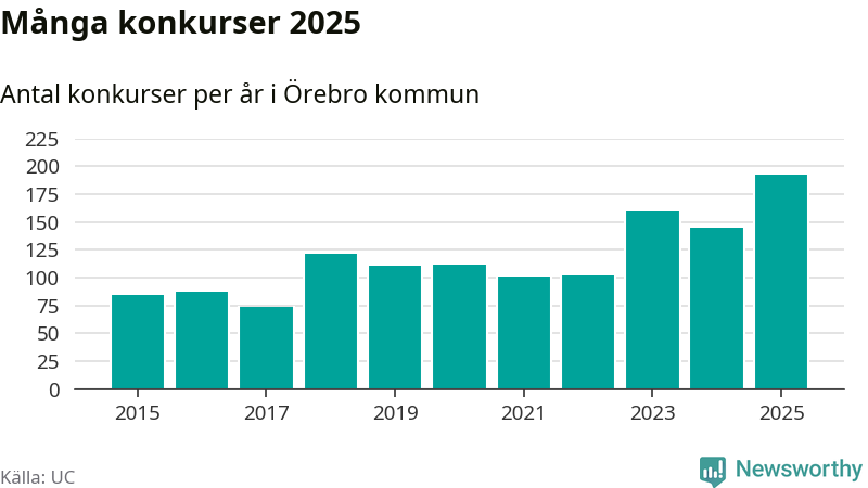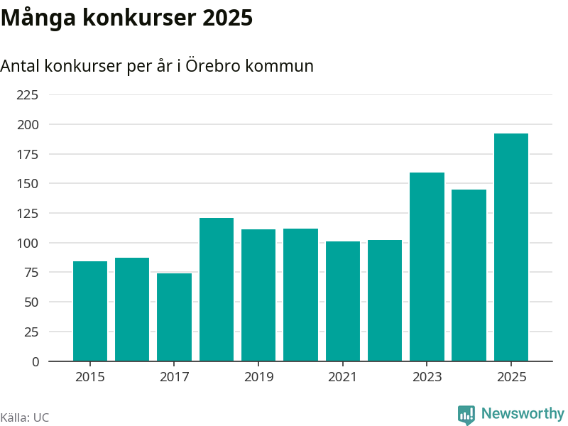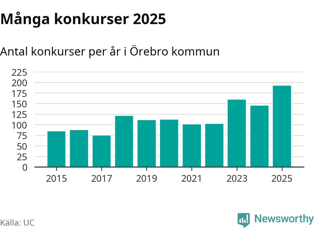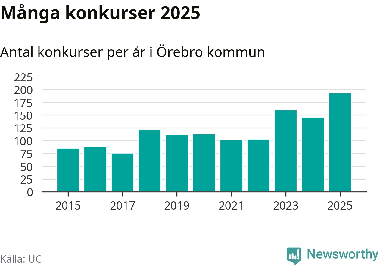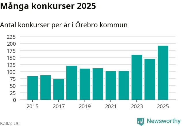 Under år 2025 gick sammanlagt 192 bolag med säte i Örebro kommun i konkurs. Det är det högsta antalet sedan åtminstone år 2015. Det visar ny statistik från UC.