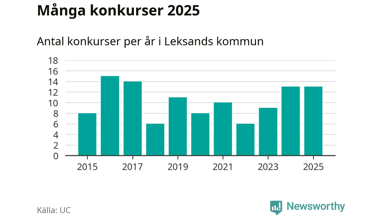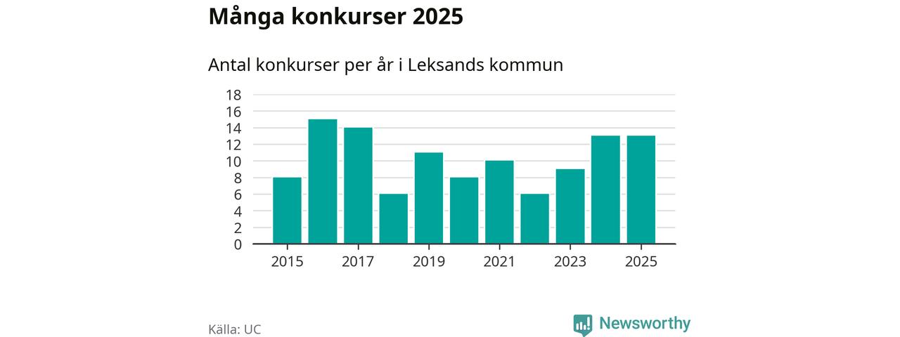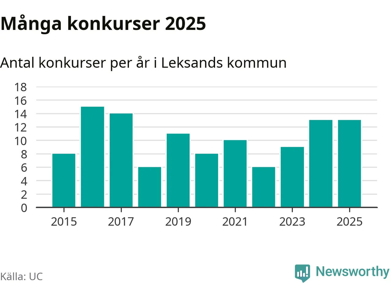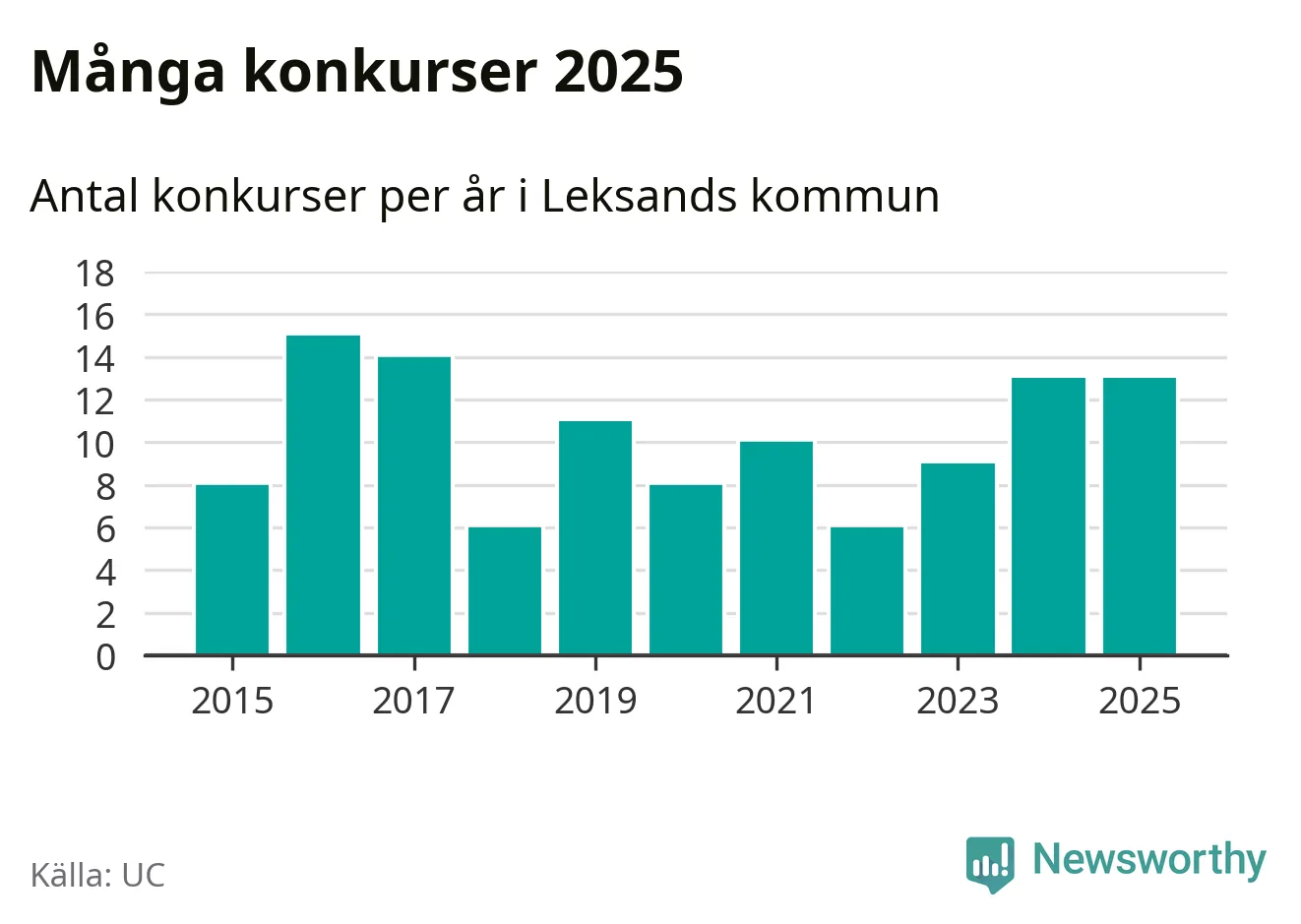 Under år 2025 gick sammanlagt 13 bolag med säte i Leksands kommun i konkurs. Det är lika många som året innan. Toppåret, sedan 2015, var 2016 då 15 bolag gick i konkurs. Det visar ny statistik från UC.