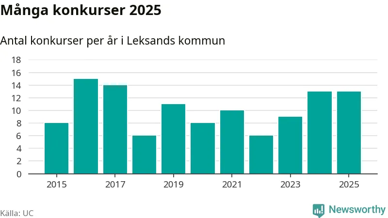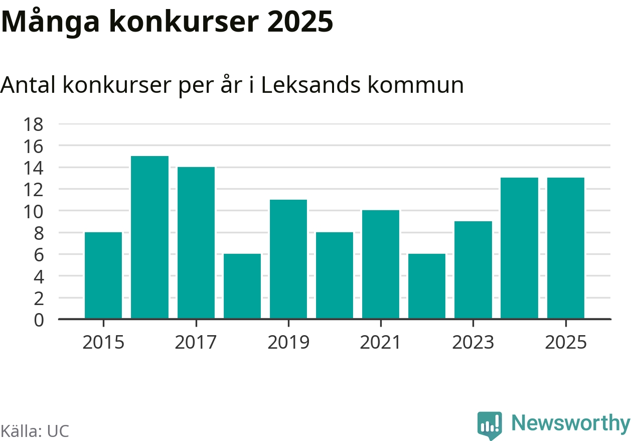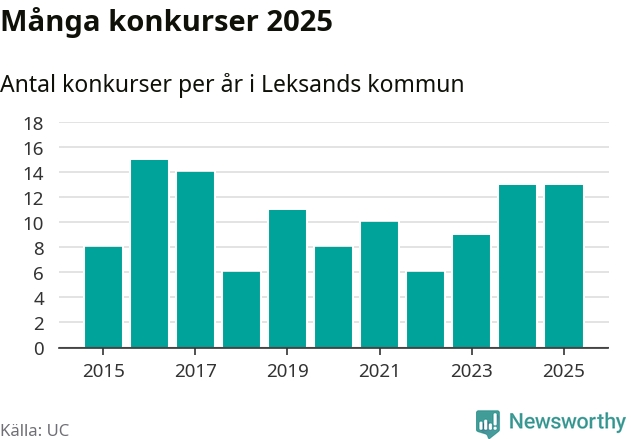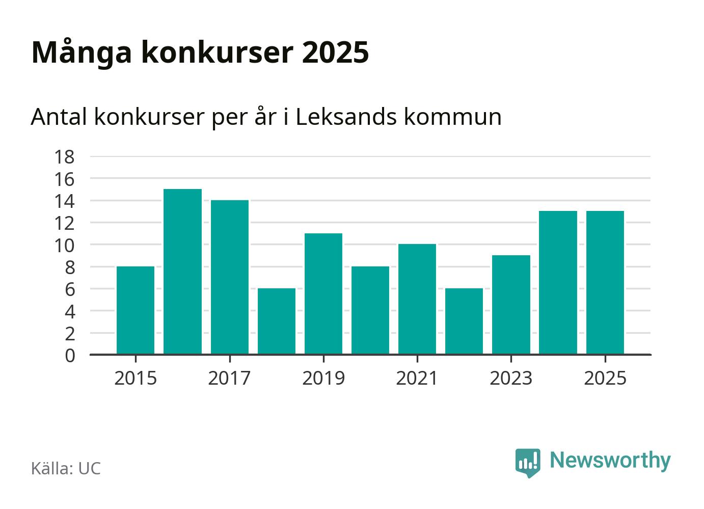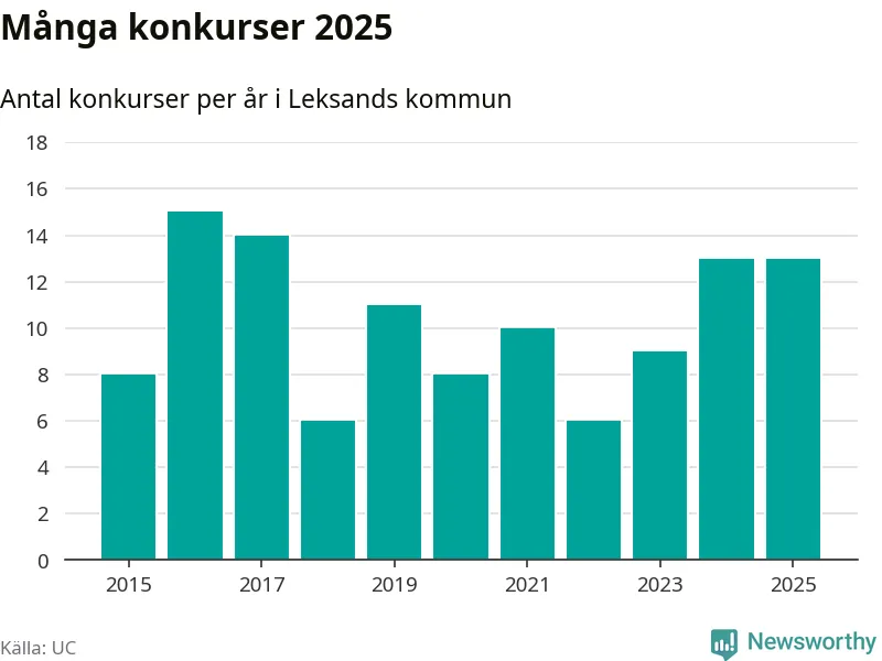 Under år 2025 gick sammanlagt 13 bolag med säte i Leksands kommun i konkurs. Det är lika många som året innan. Toppåret, sedan 2015, var 2016 då 15 bolag gick i konkurs. Det visar ny statistik från UC.