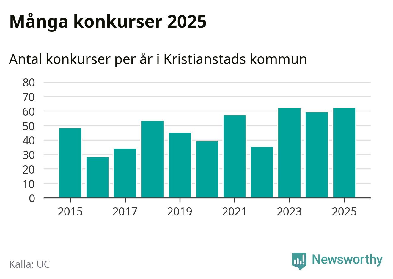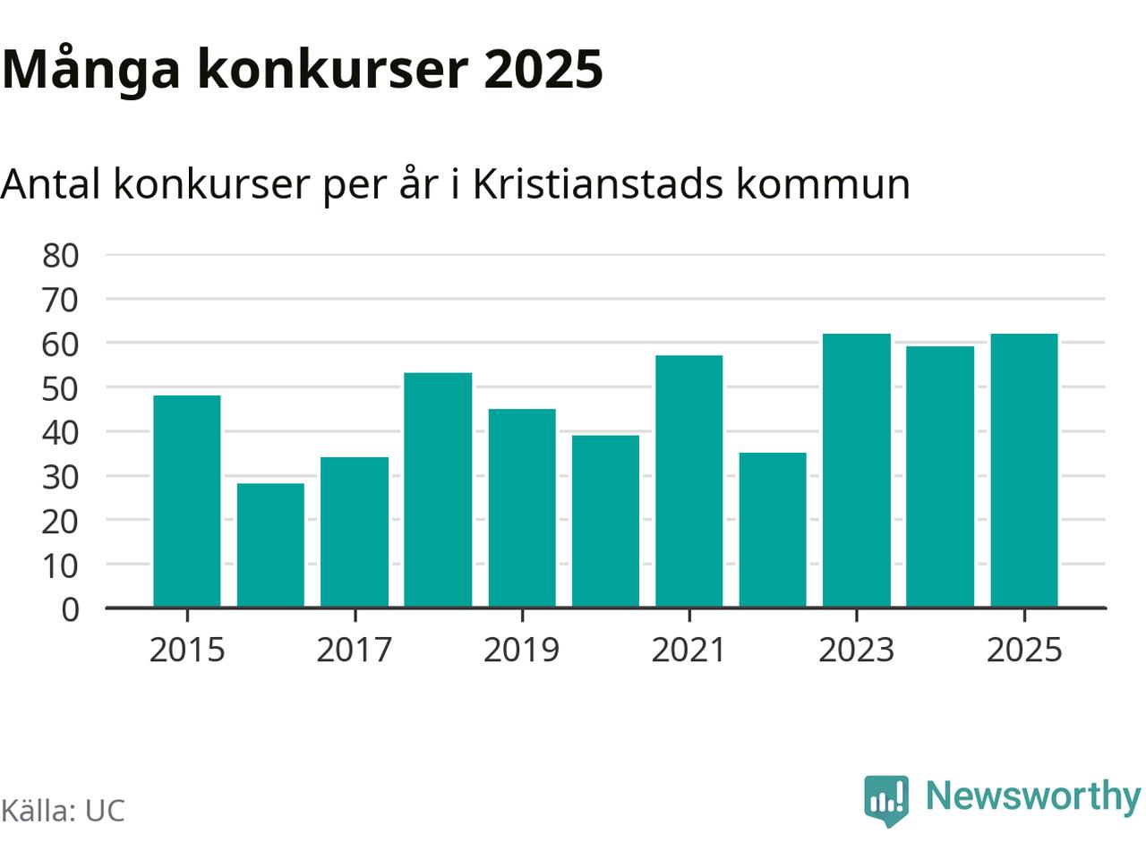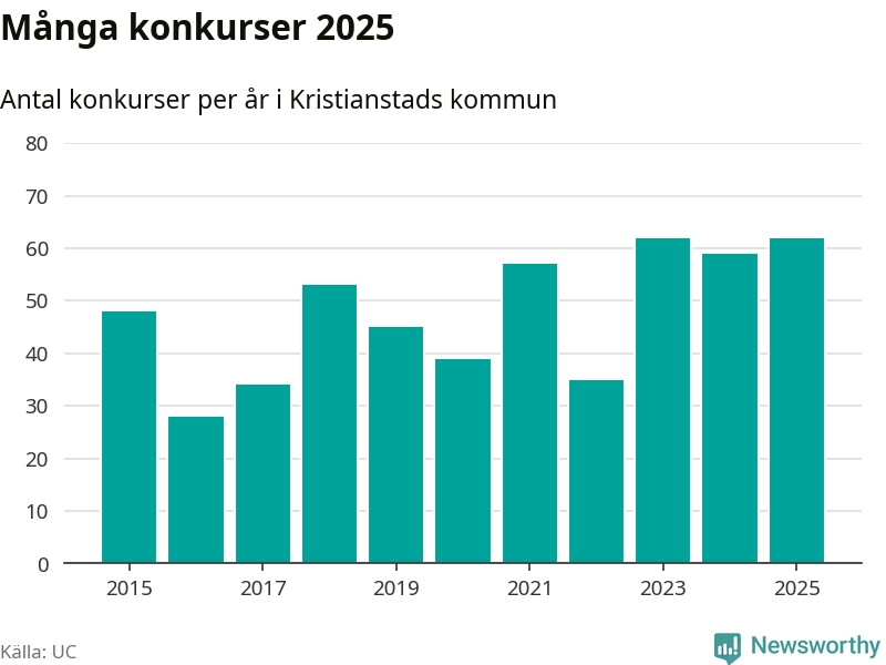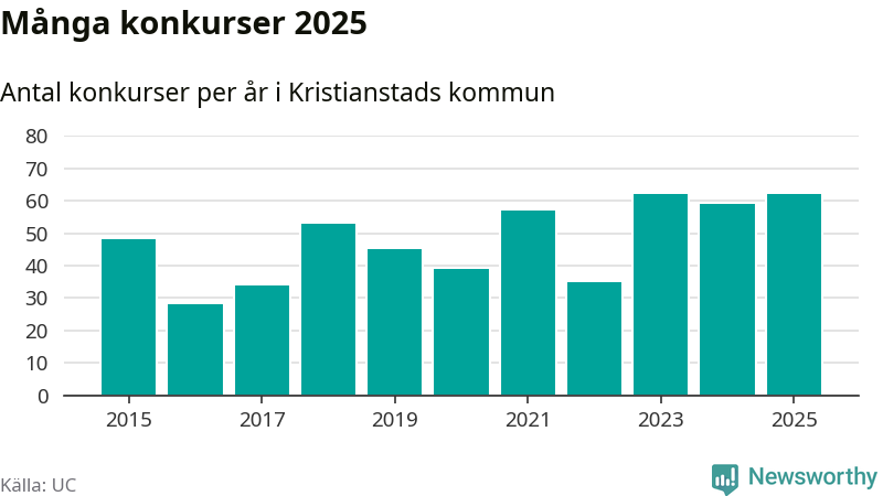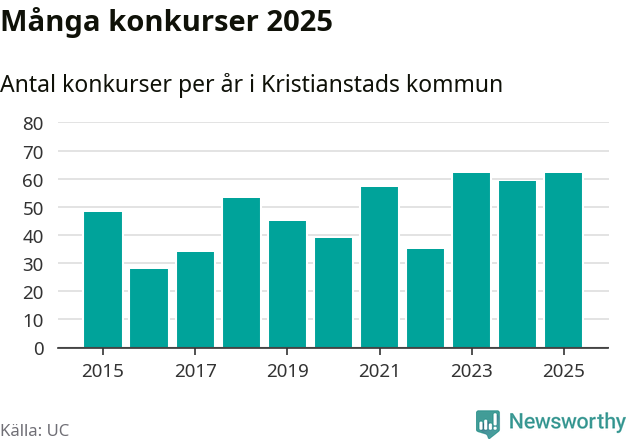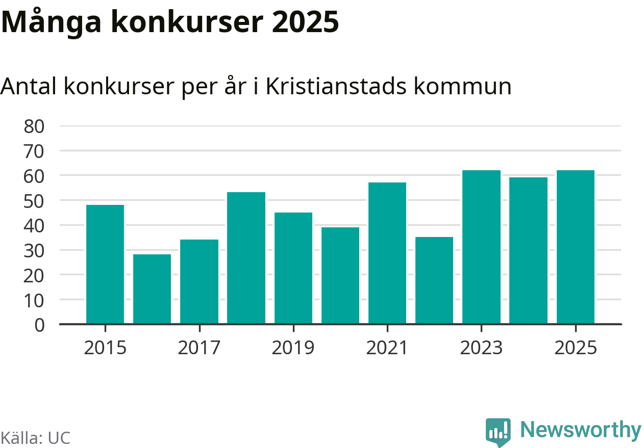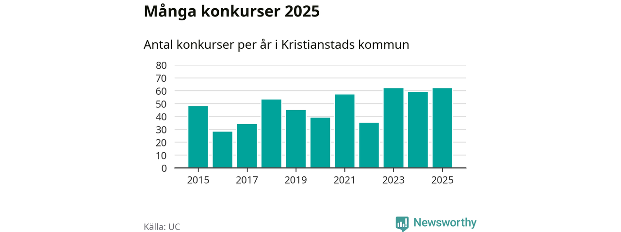 Under år 2025 gick sammanlagt 62 bolag med säte i Kristianstads kommun i konkurs. Det är, tillsammans med 2023, det högsta antalet sedan åtminstone år 2015. Det visar ny statistik från UC.