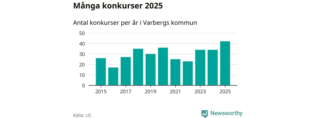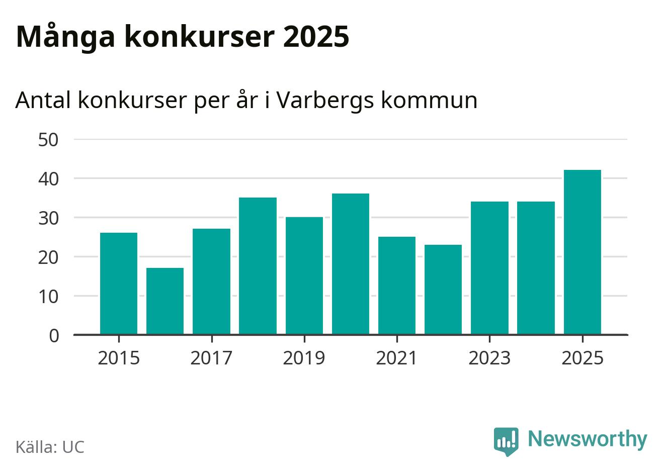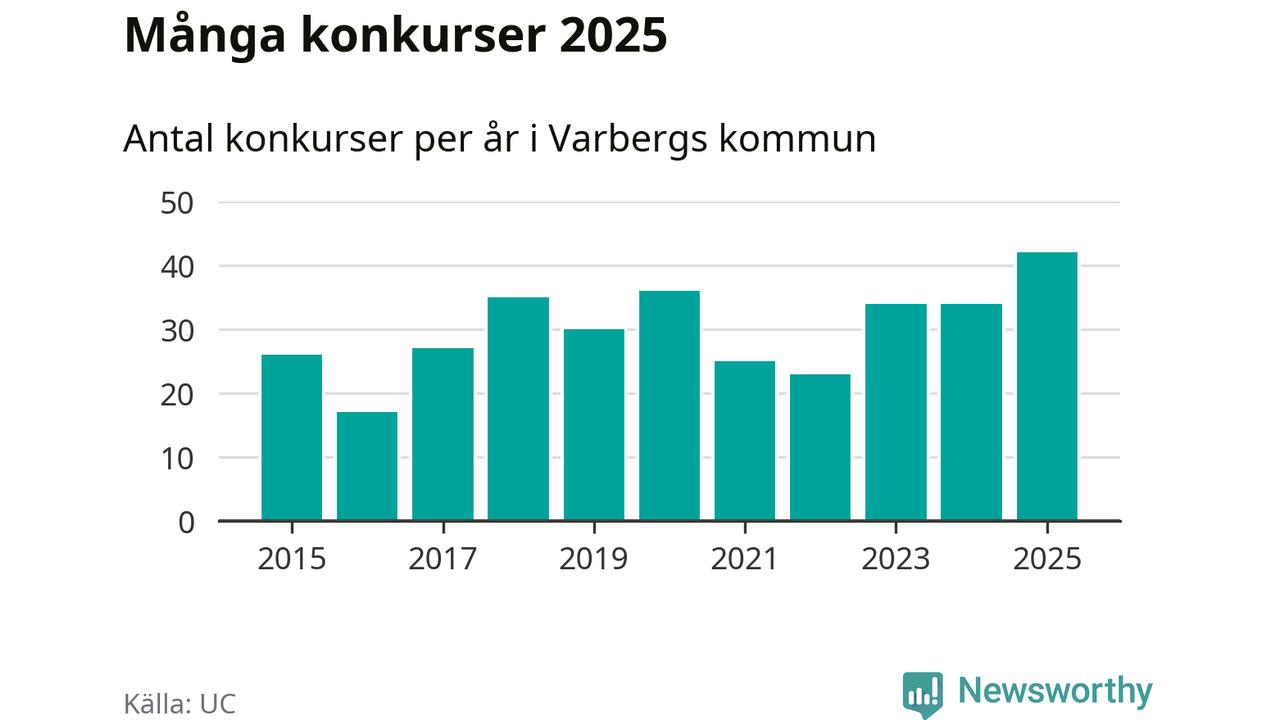 Under år 2025 gick sammanlagt 42 bolag med säte i Varbergs kommun i konkurs. Det är det högsta antalet sedan åtminstone år 2015. Det visar ny statistik från UC.