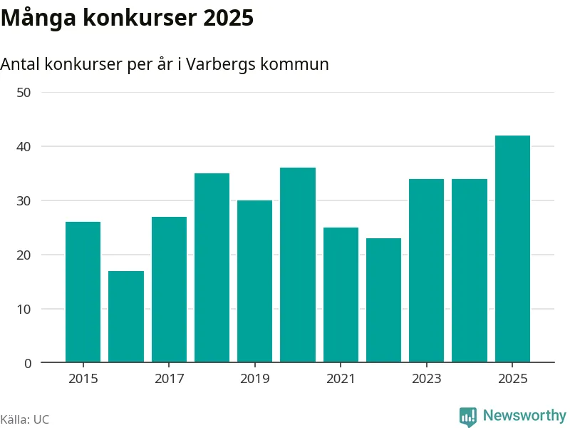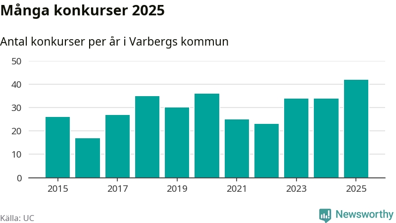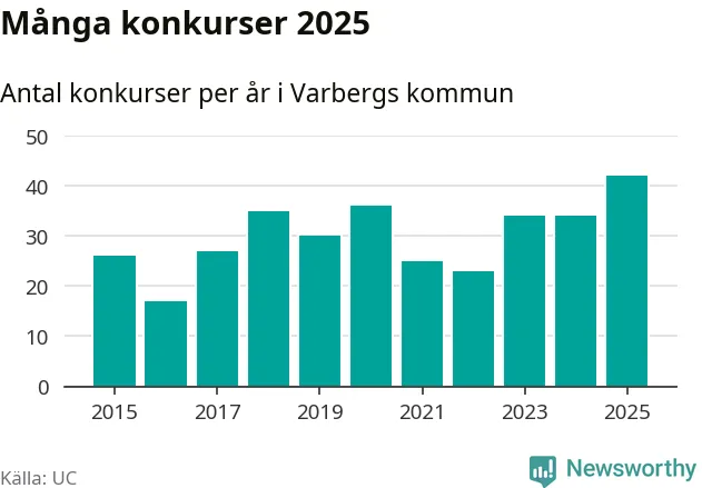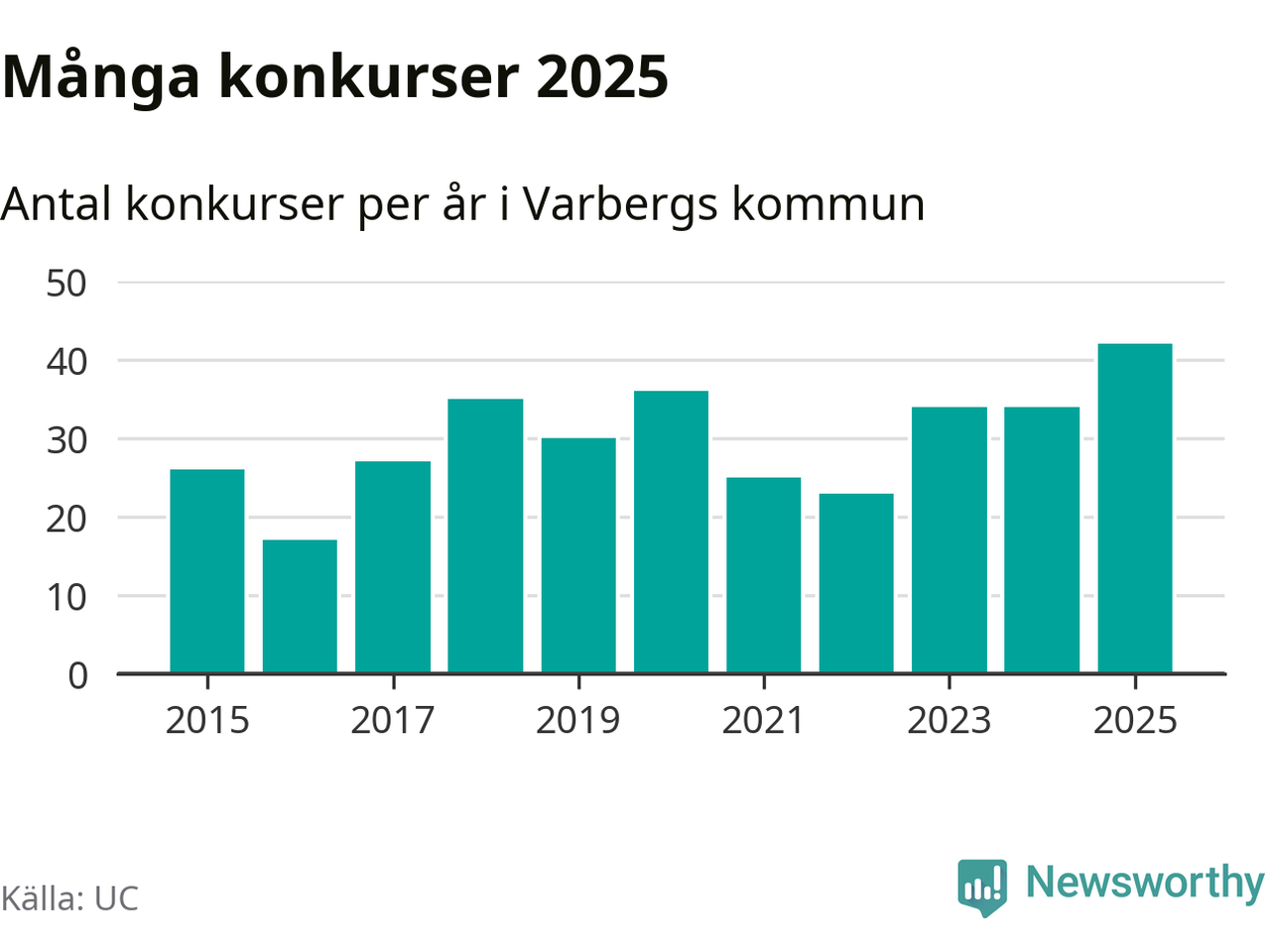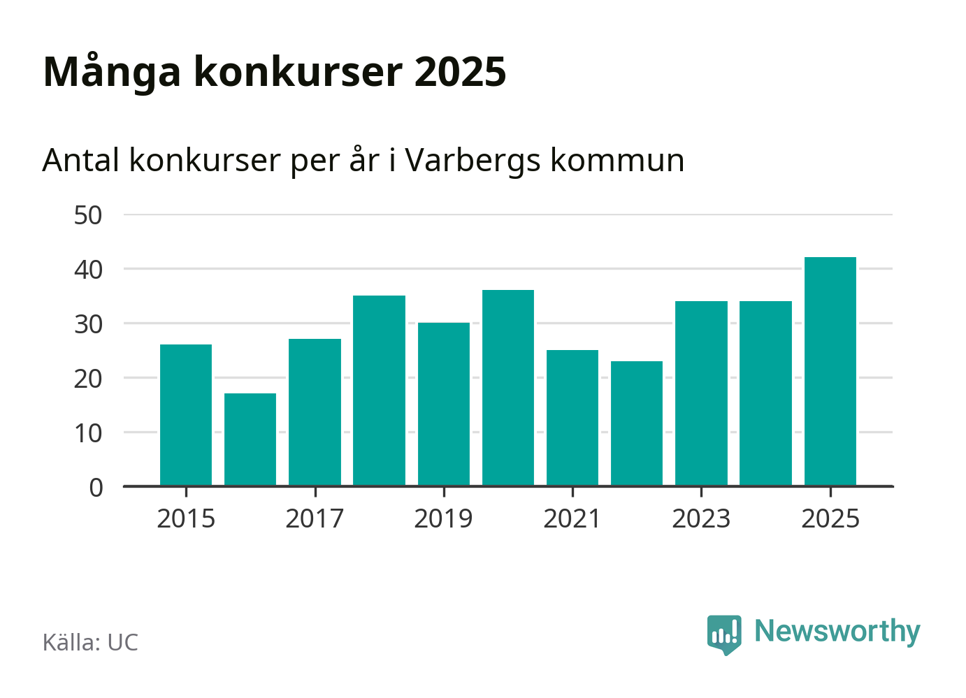 Under år 2025 gick sammanlagt 42 bolag med säte i Varbergs kommun i konkurs. Det är det högsta antalet sedan åtminstone år 2015. Det visar ny statistik från UC.