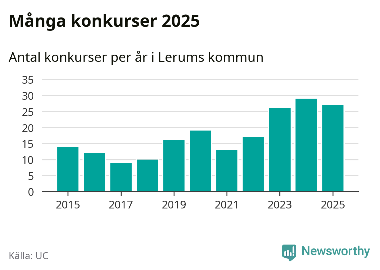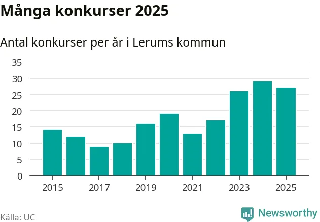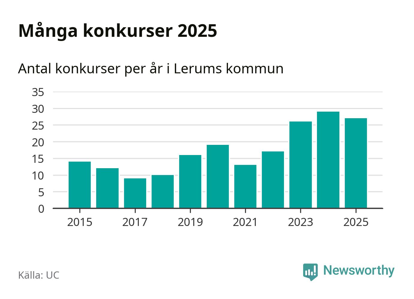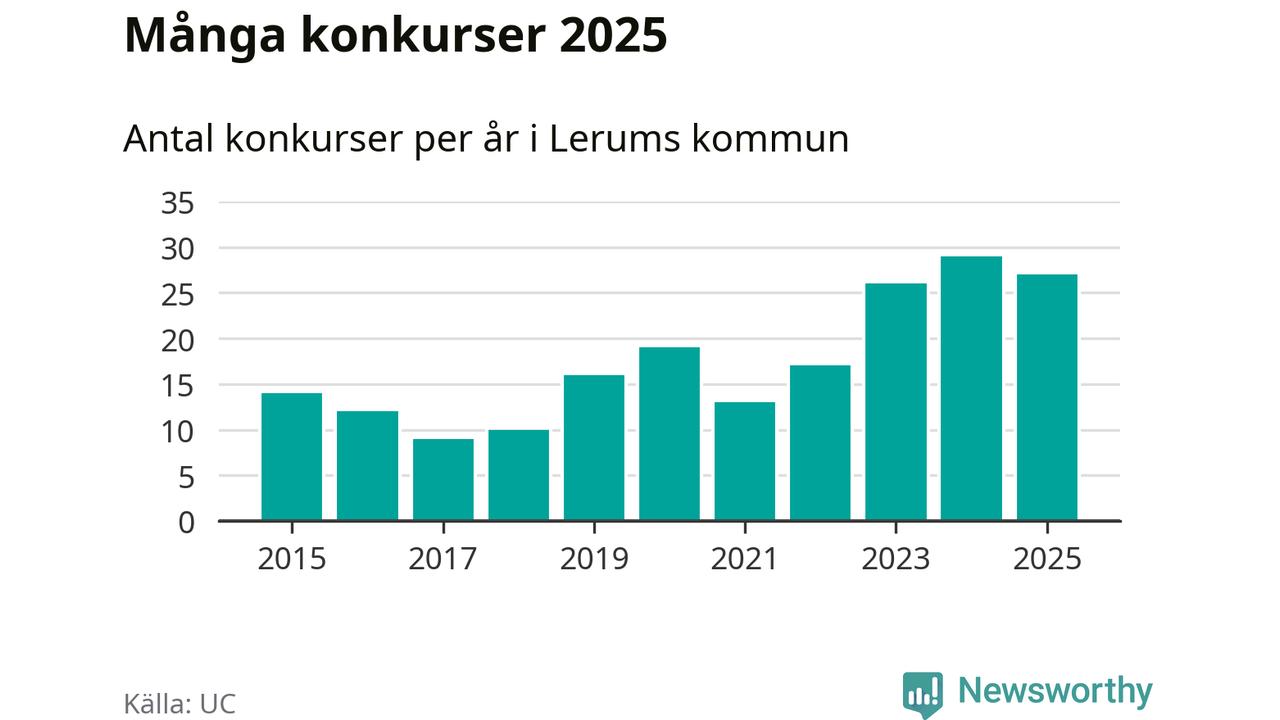 Under år 2025 gick sammanlagt 27 bolag med säte i Lerums kommun i konkurs. Det är två färre än året innan. Toppåret, sedan 2015, var just 2024 sett till antalet konkursföretag. Det visar ny statistik från UC.