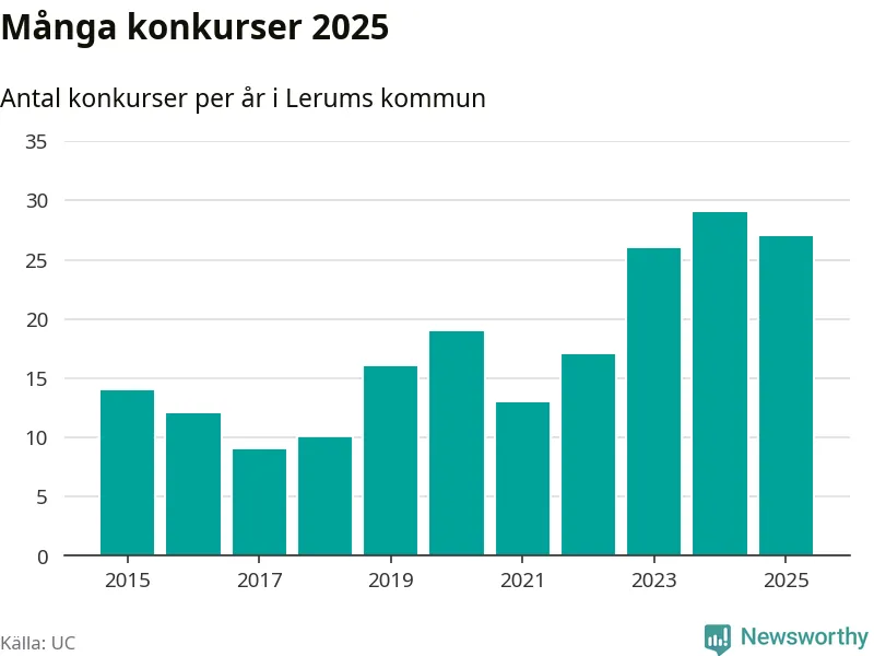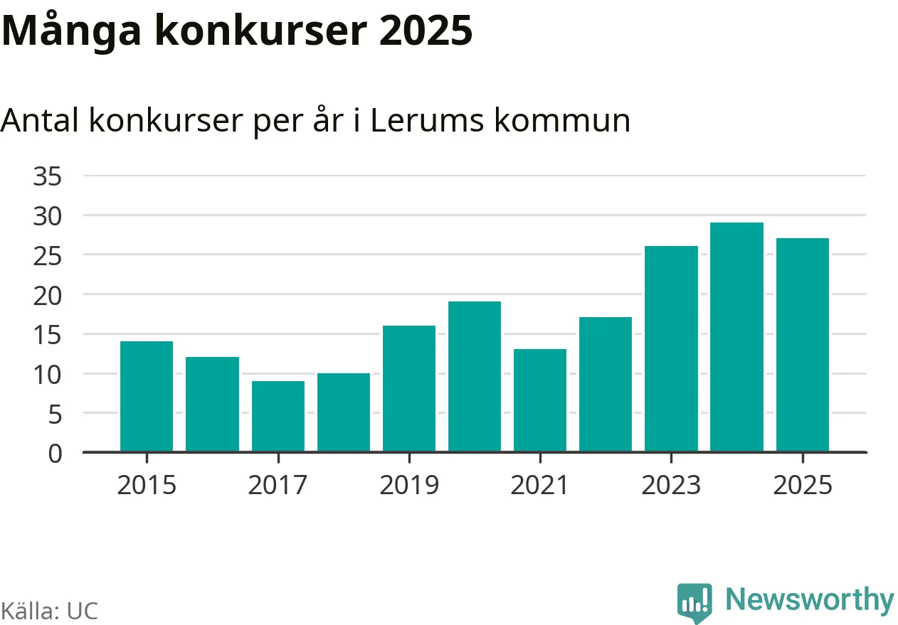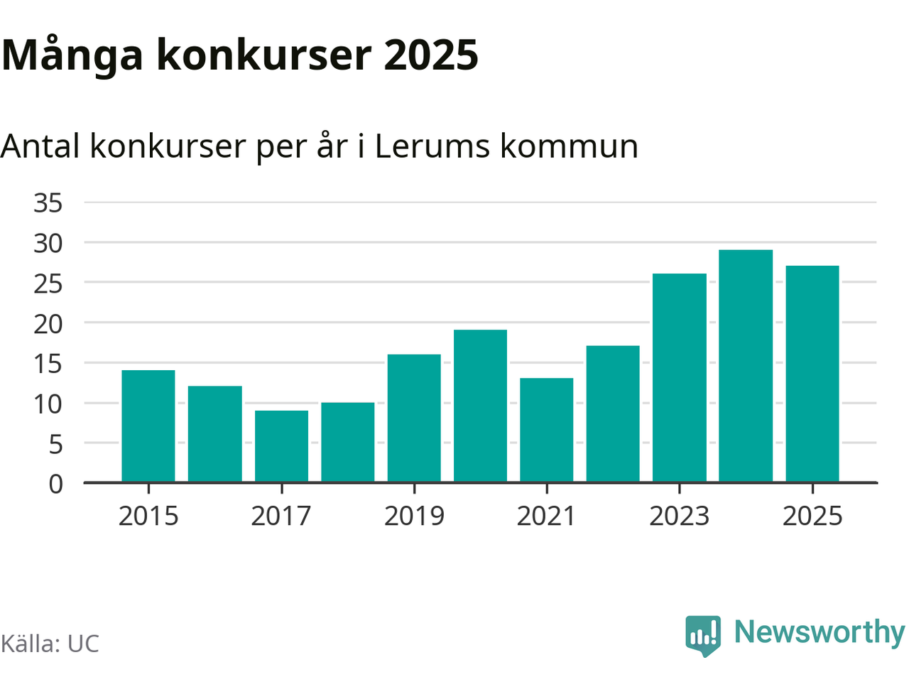Under år 2025 gick sammanlagt 27 bolag med säte i Lerums kommun i konkurs. Det är två färre än året innan. Toppåret, sedan 2015, var just 2024 sett till antalet konkursföretag. Det visar ny statistik från UC.