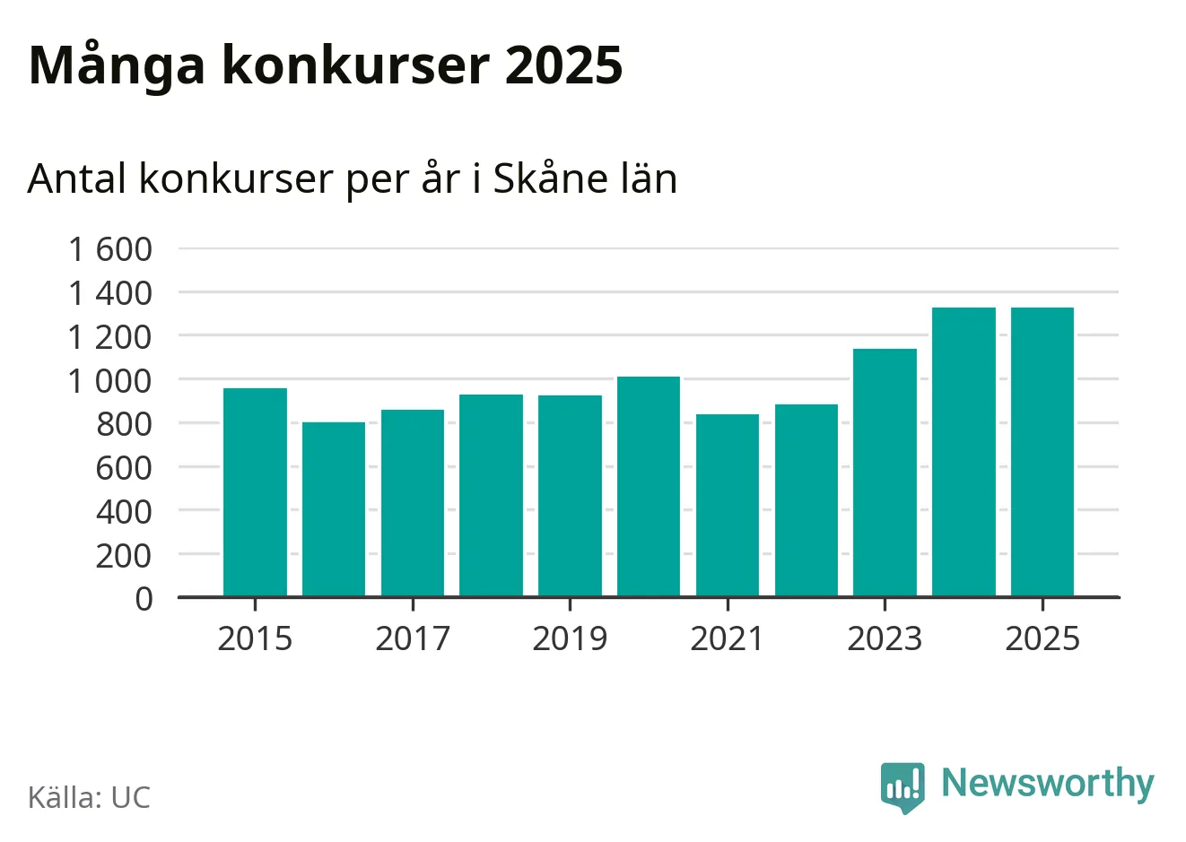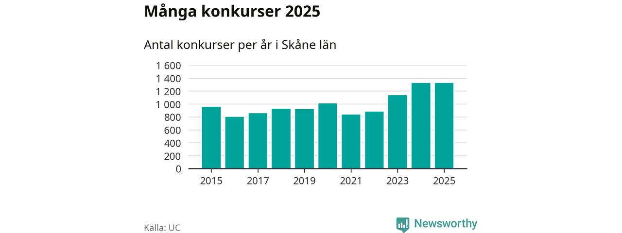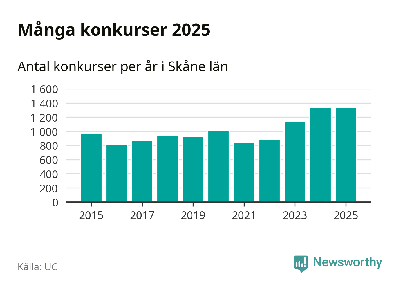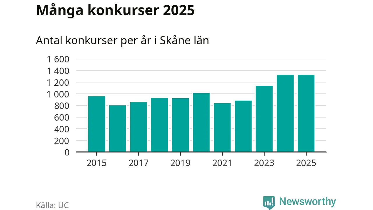 Under år 2025 gick sammanlagt 1 326 bolag med säte i Skåne län i konkurs. Det är, tillsammans med 2024, det högsta antalet sedan åtminstone år 2015. Det visar ny statistik från UC.