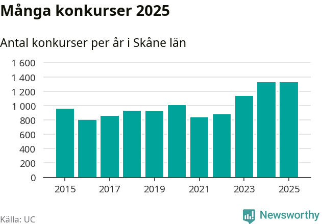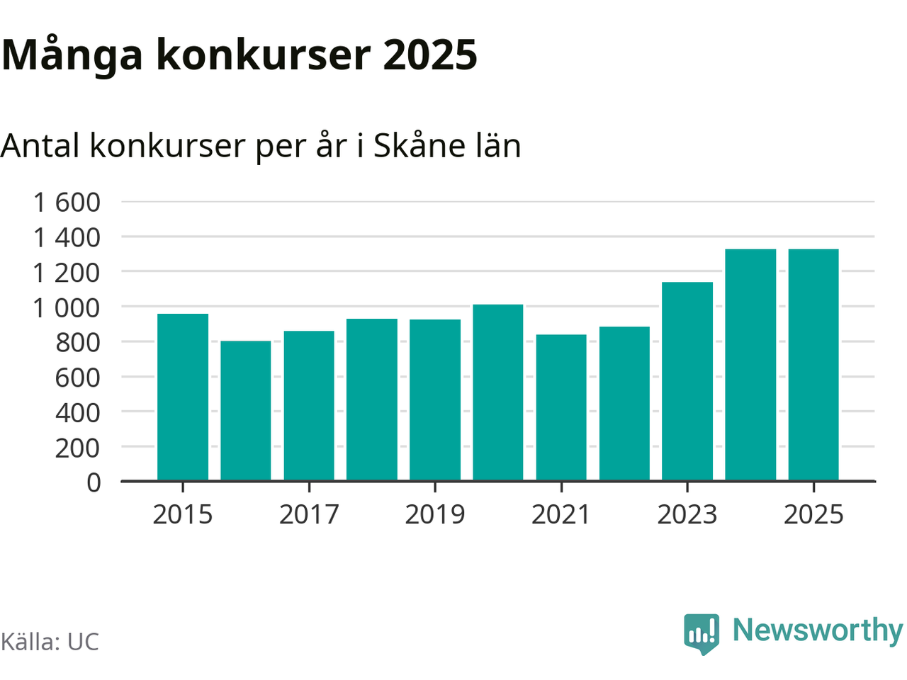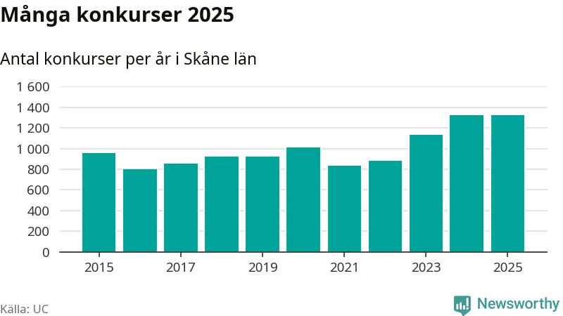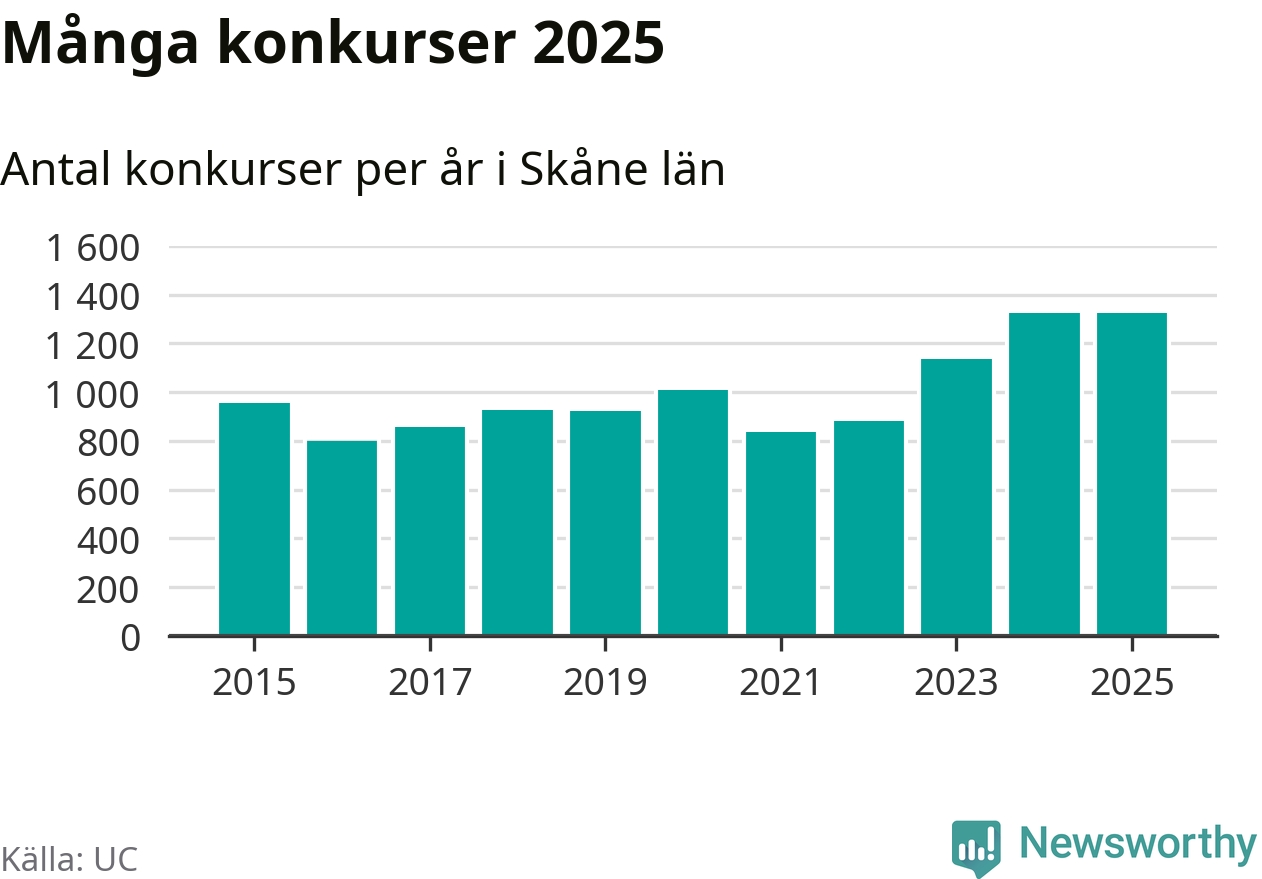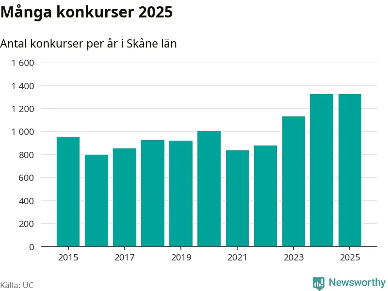 Under år 2025 gick sammanlagt 1 326 bolag med säte i Skåne län i konkurs. Det är, tillsammans med 2024, det högsta antalet sedan åtminstone år 2015. Det visar ny statistik från UC.