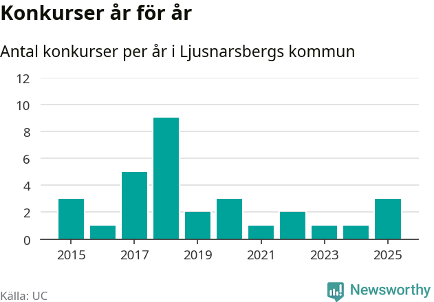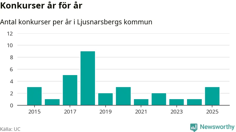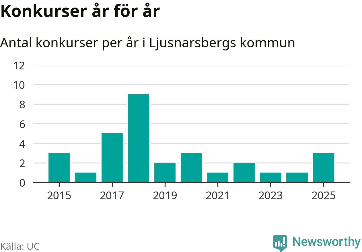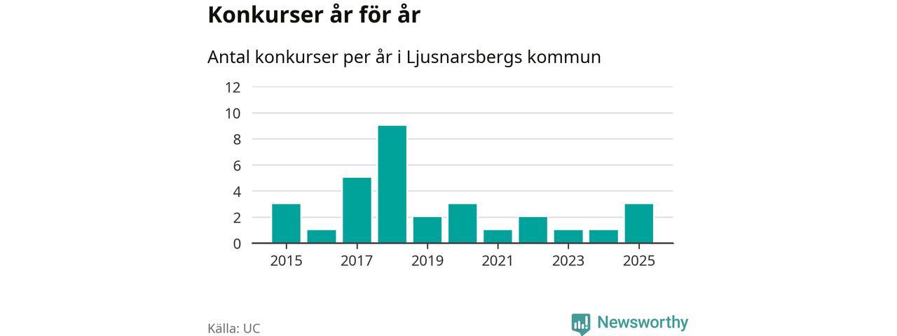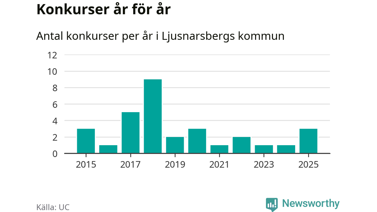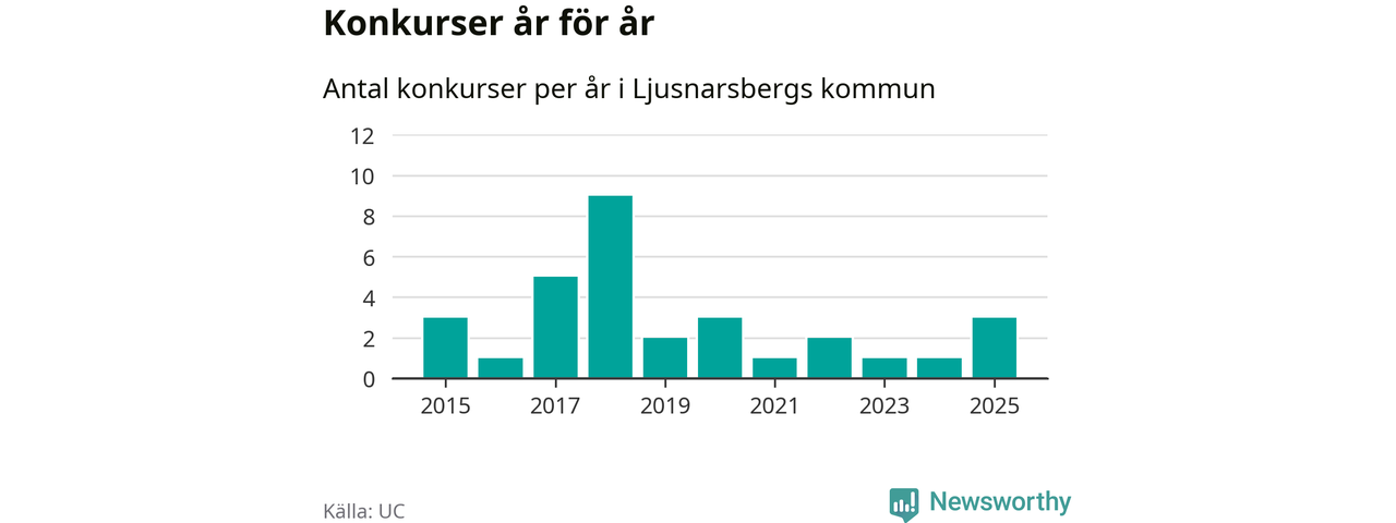 Under år 2025 gick sammanlagt tre bolag med säte i Ljusnarsbergs kommun i konkurs. Det är det högsta antalet sedan år 2020. Det visar ny statistik från UC.