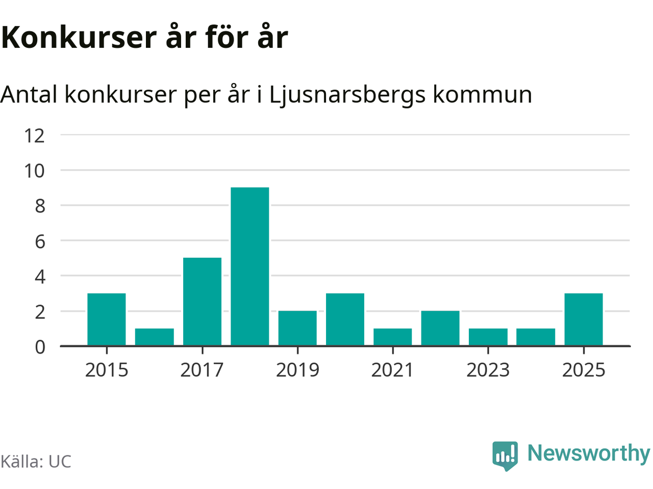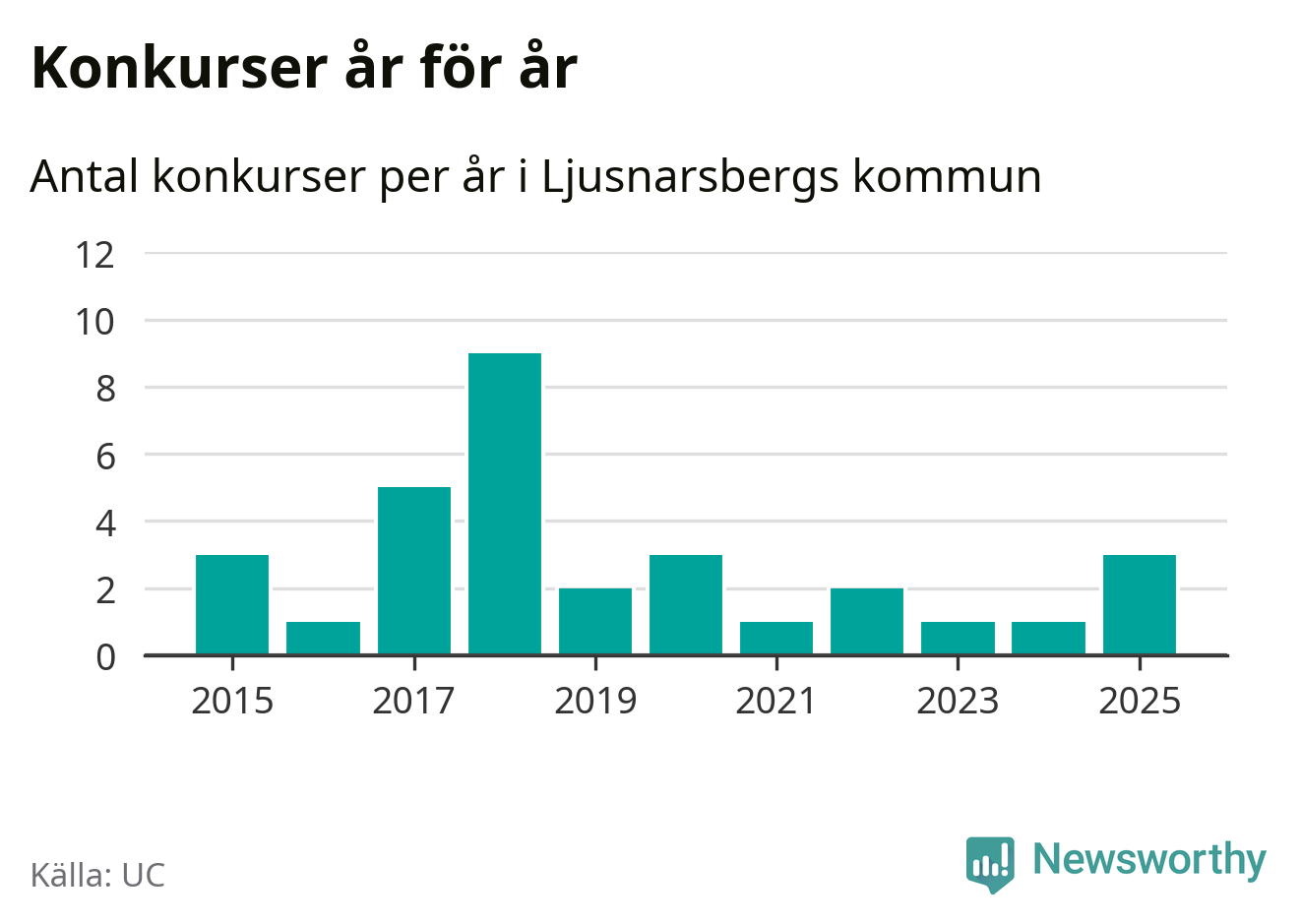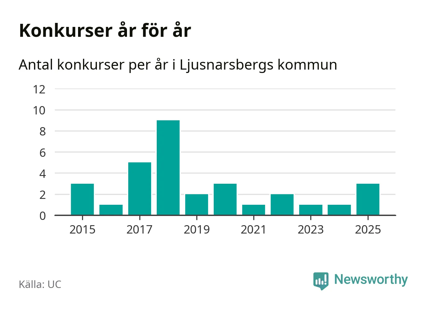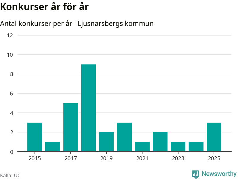 Under år 2025 gick sammanlagt tre bolag med säte i Ljusnarsbergs kommun i konkurs. Det är det högsta antalet sedan år 2020. Det visar ny statistik från UC.