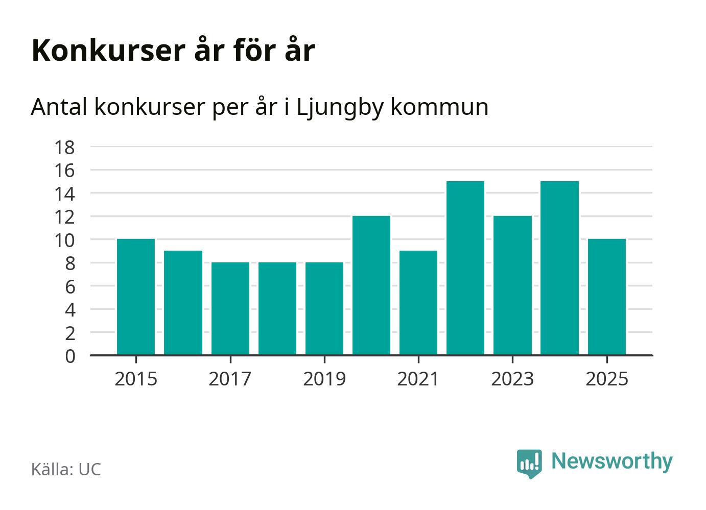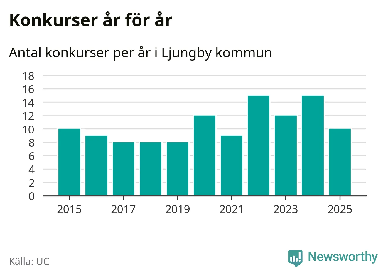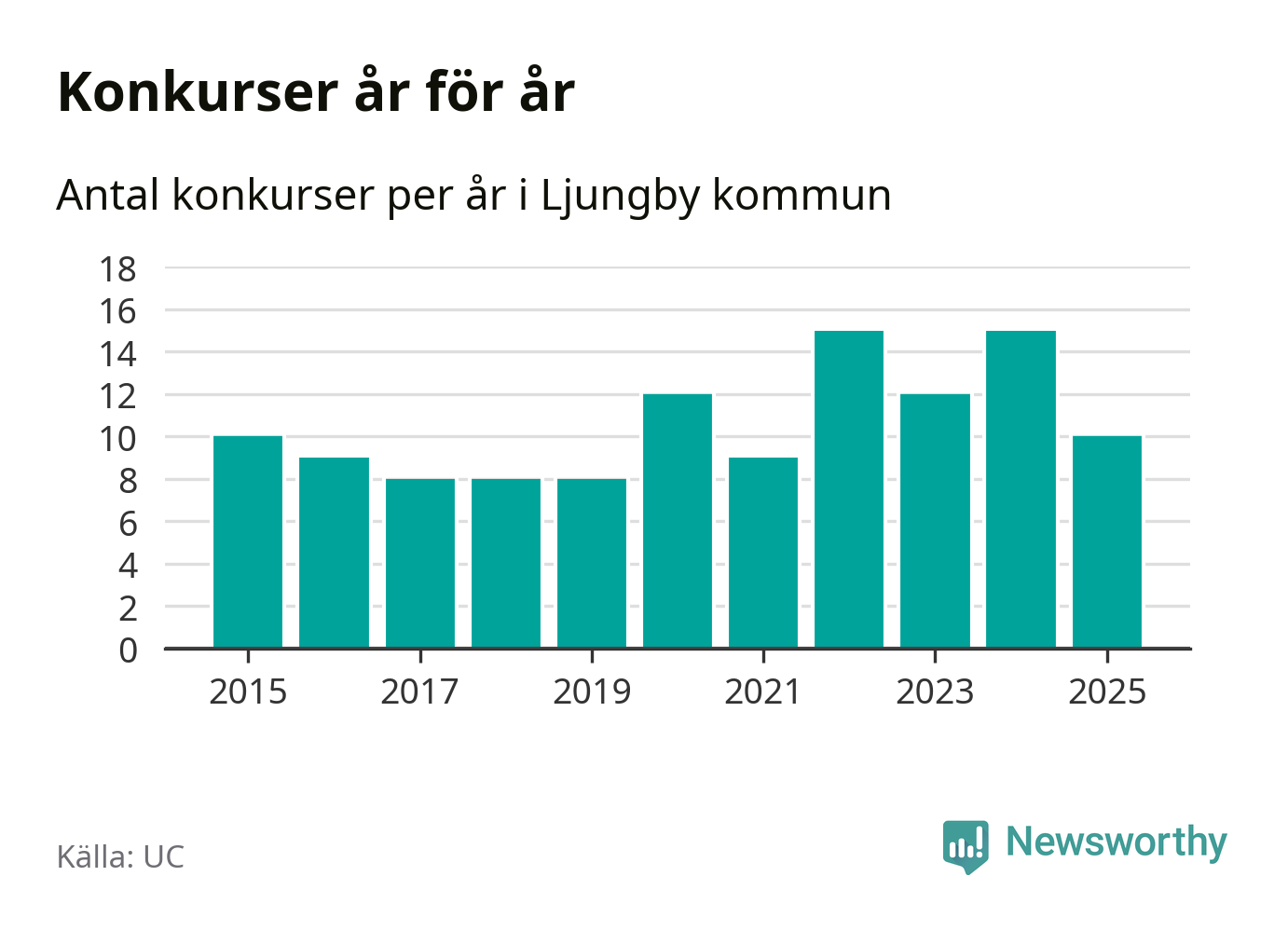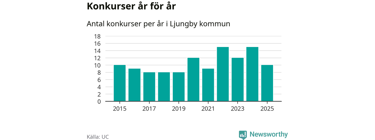 Under år 2025 gick sammanlagt tio bolag med säte i Ljungby kommun i konkurs. Det är fem färre än året innan då 15 bolag gick i konkurs. Toppåren, sedan 2015, var just 2022 och 2024 sett till antalet konkursföretag. Det visar ny statistik från UC.