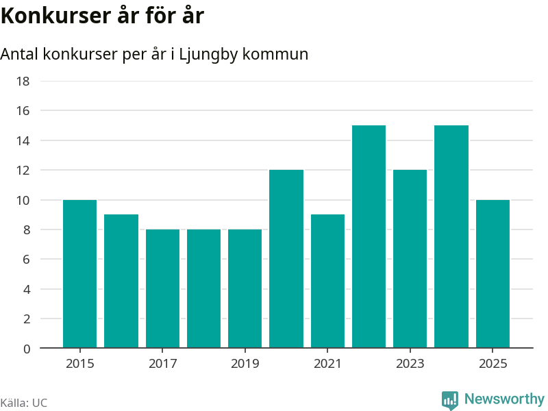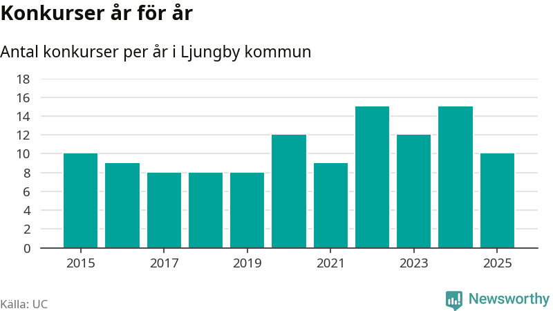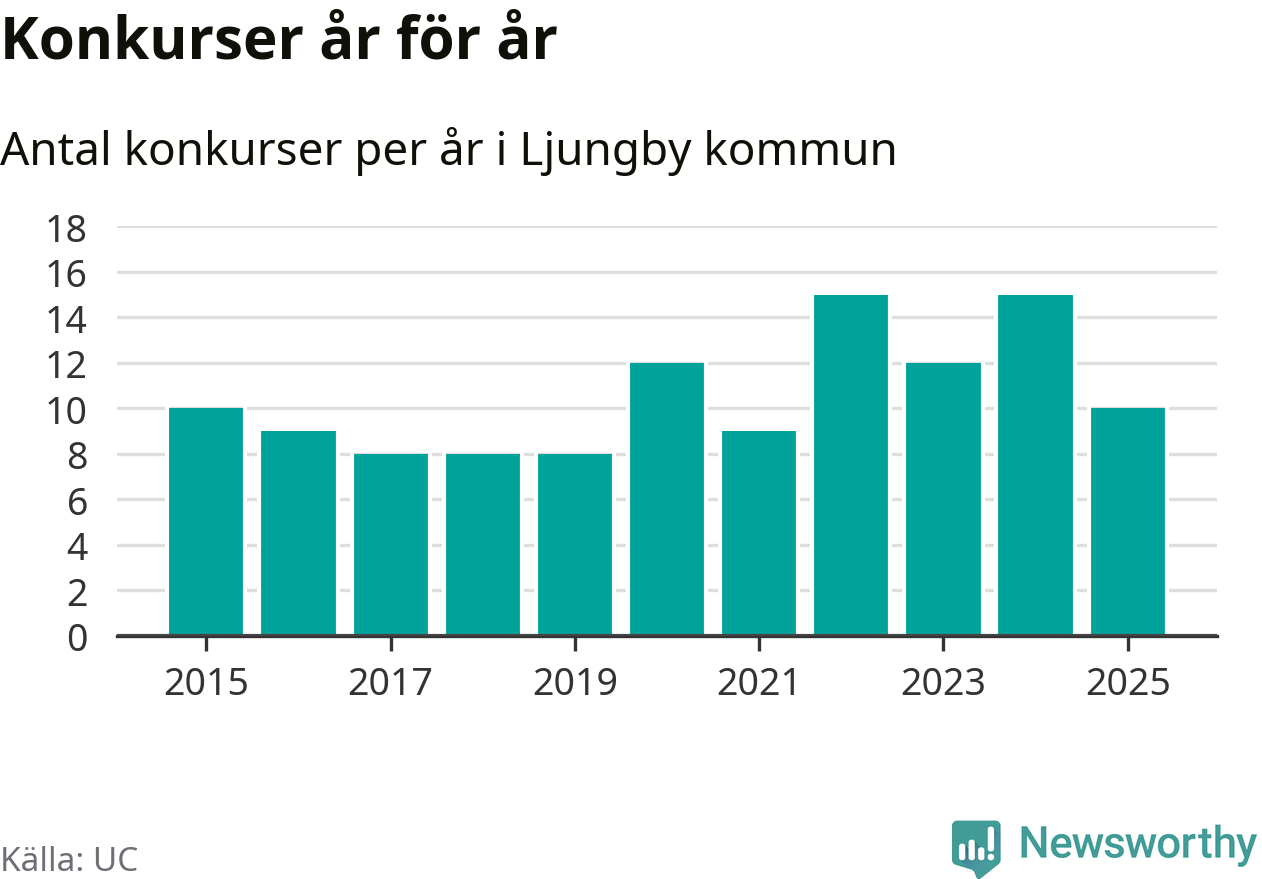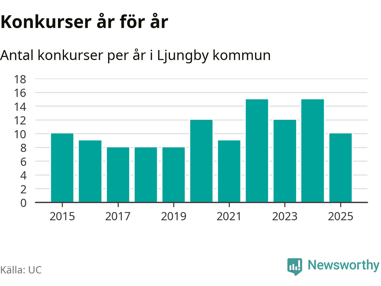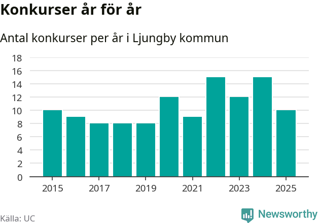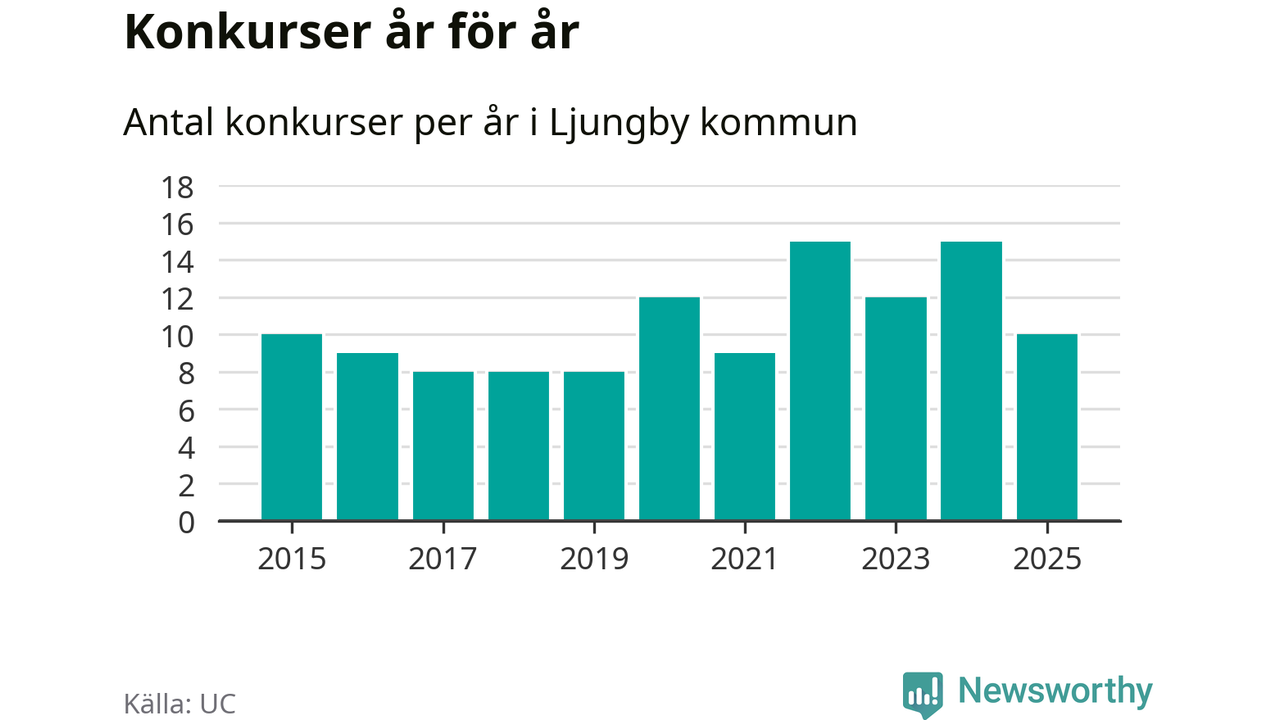 Under år 2025 gick sammanlagt tio bolag med säte i Ljungby kommun i konkurs. Det är fem färre än året innan då 15 bolag gick i konkurs. Toppåren, sedan 2015, var just 2022 och 2024 sett till antalet konkursföretag. Det visar ny statistik från UC.