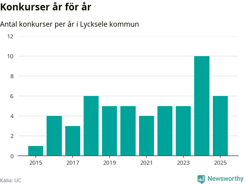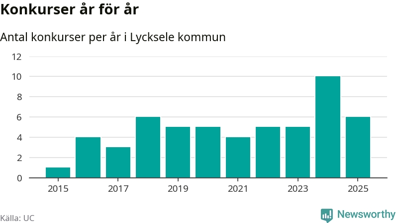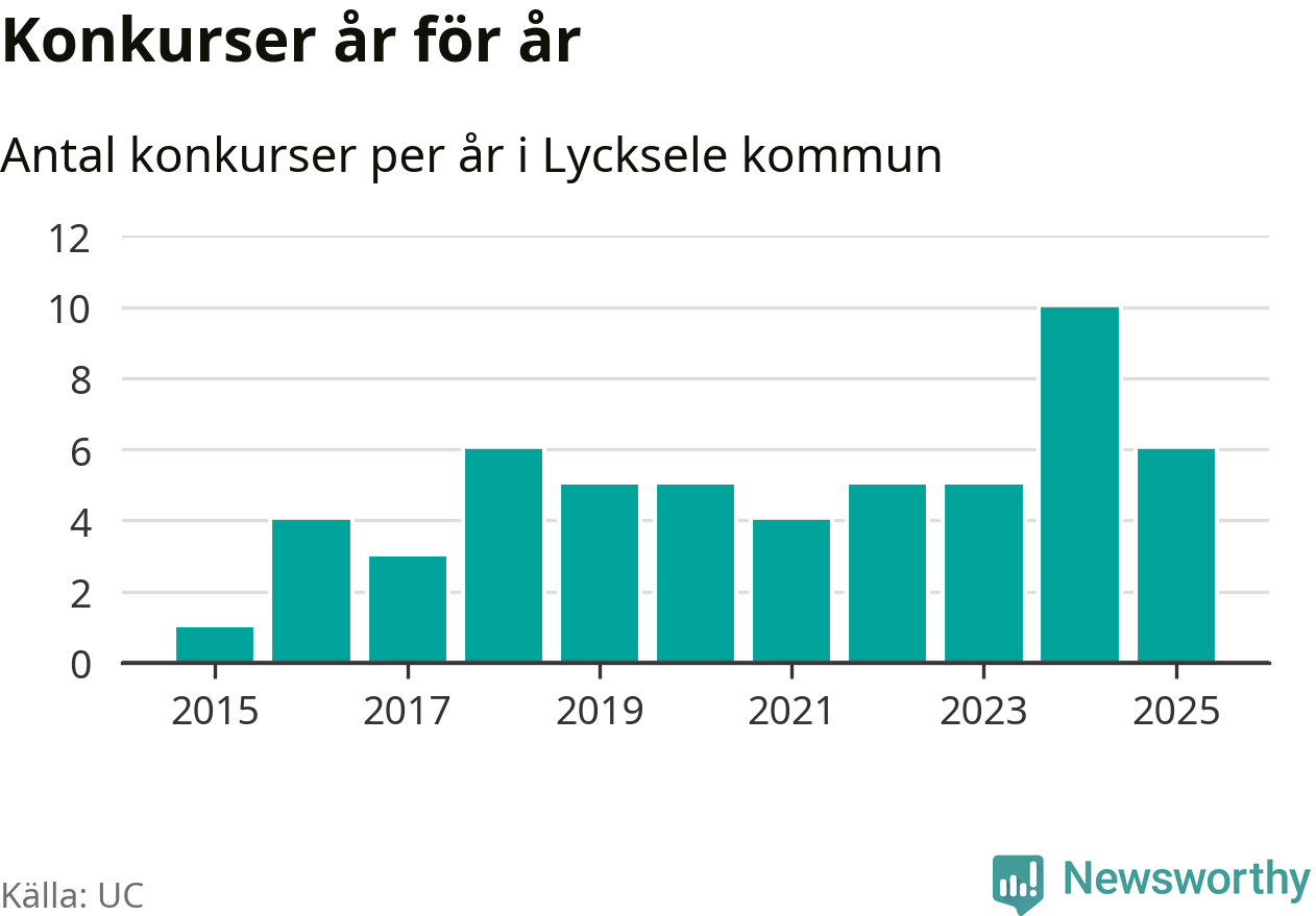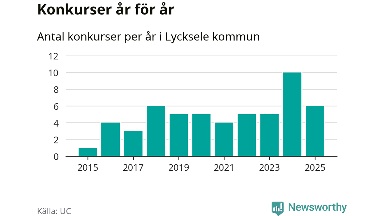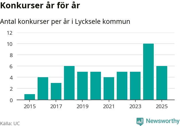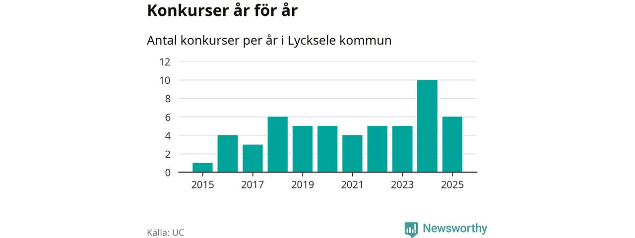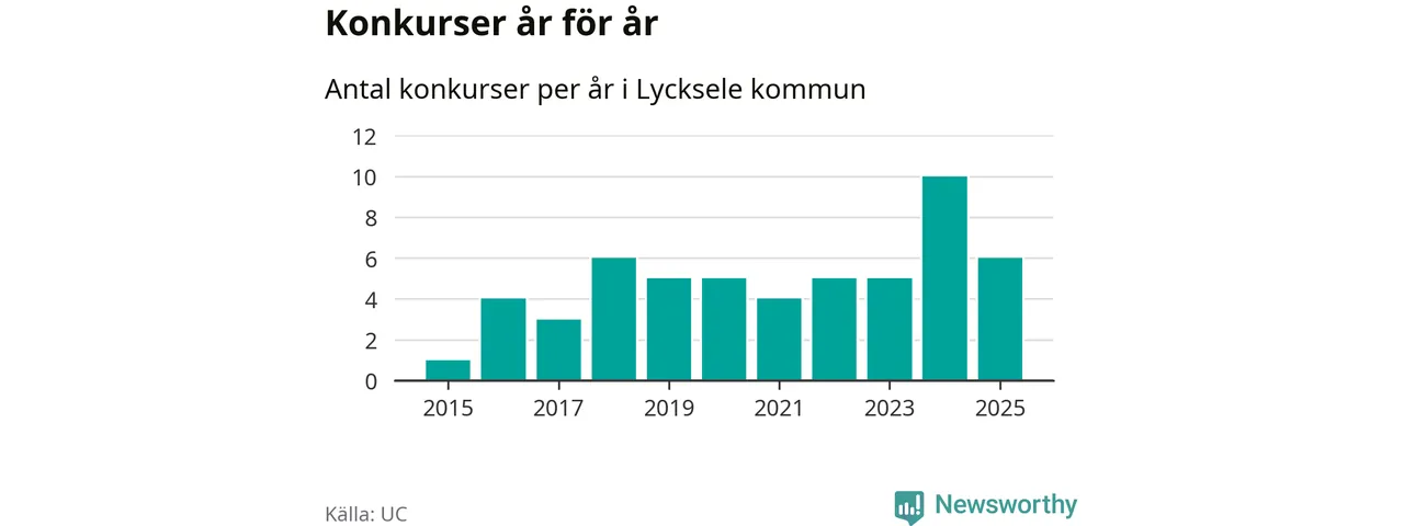 Under år 2025 gick sammanlagt sex bolag med säte i Lycksele kommun i konkurs. Det är fyra färre än året innan då tio bolag gick i konkurs. Toppåret, sedan 2015, var just 2024 sett till antalet konkursföretag. Det visar ny statistik från UC.