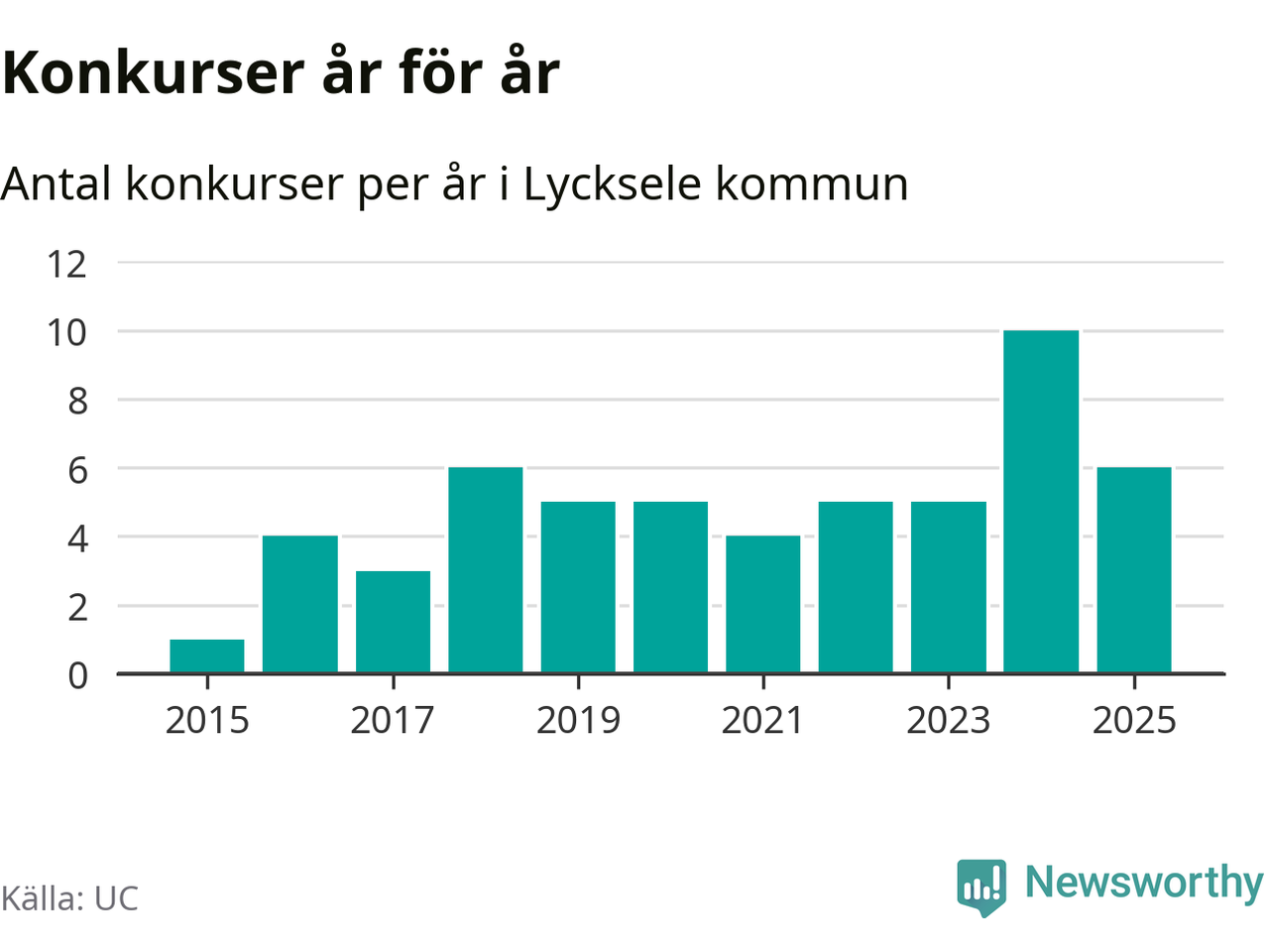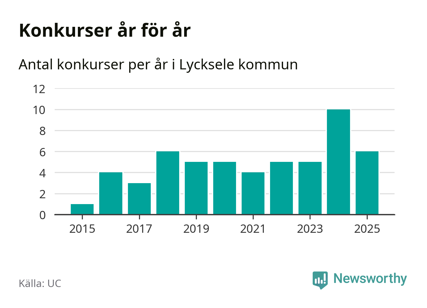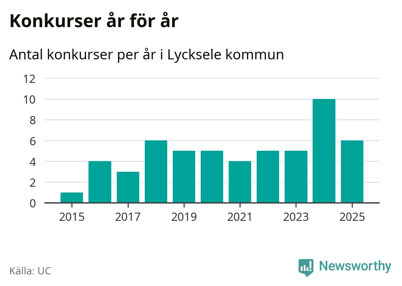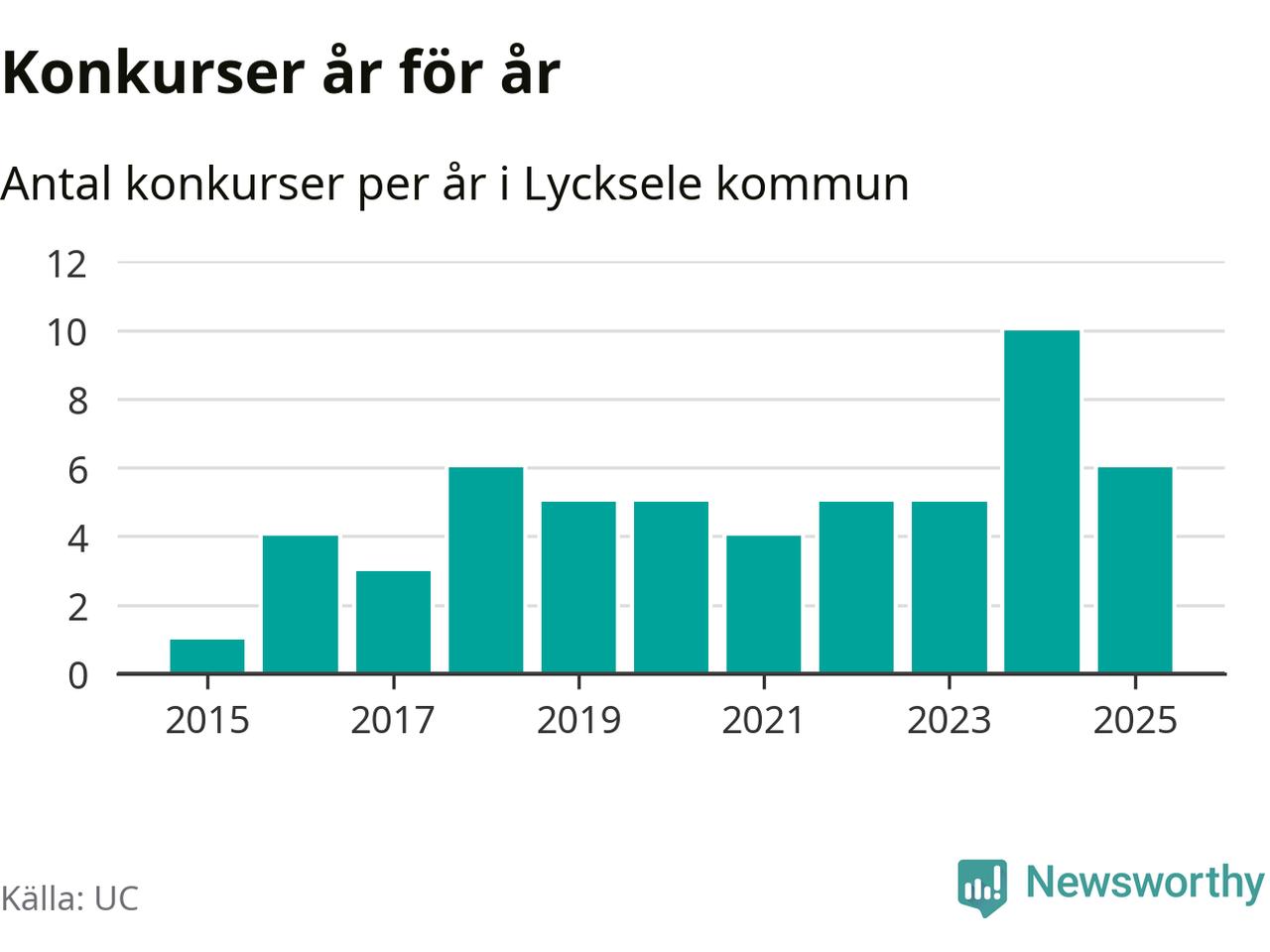 Under år 2025 gick sammanlagt sex bolag med säte i Lycksele kommun i konkurs. Det är fyra färre än året innan då tio bolag gick i konkurs. Toppåret, sedan 2015, var just 2024 sett till antalet konkursföretag. Det visar ny statistik från UC.