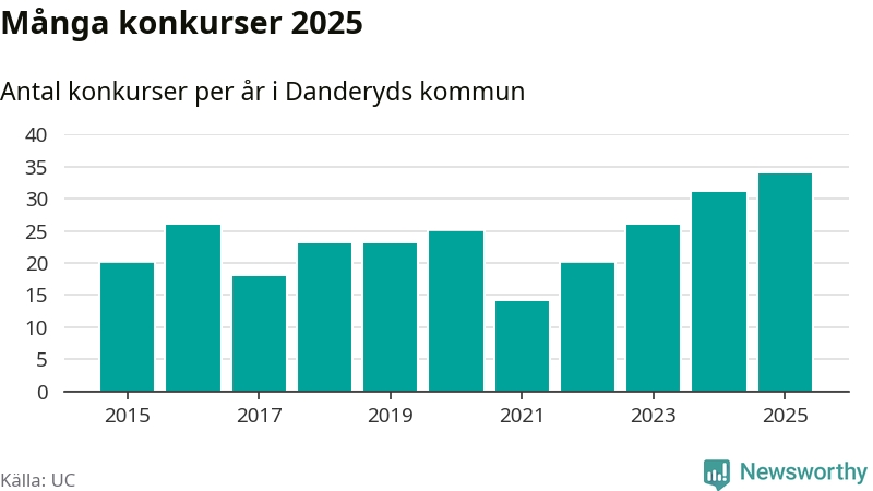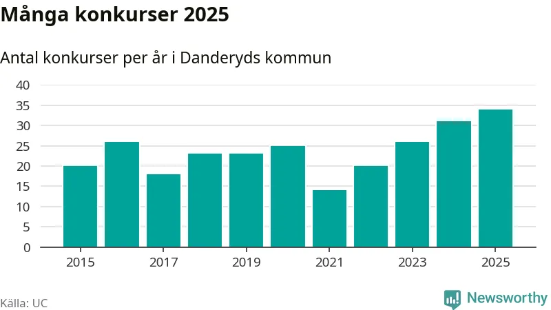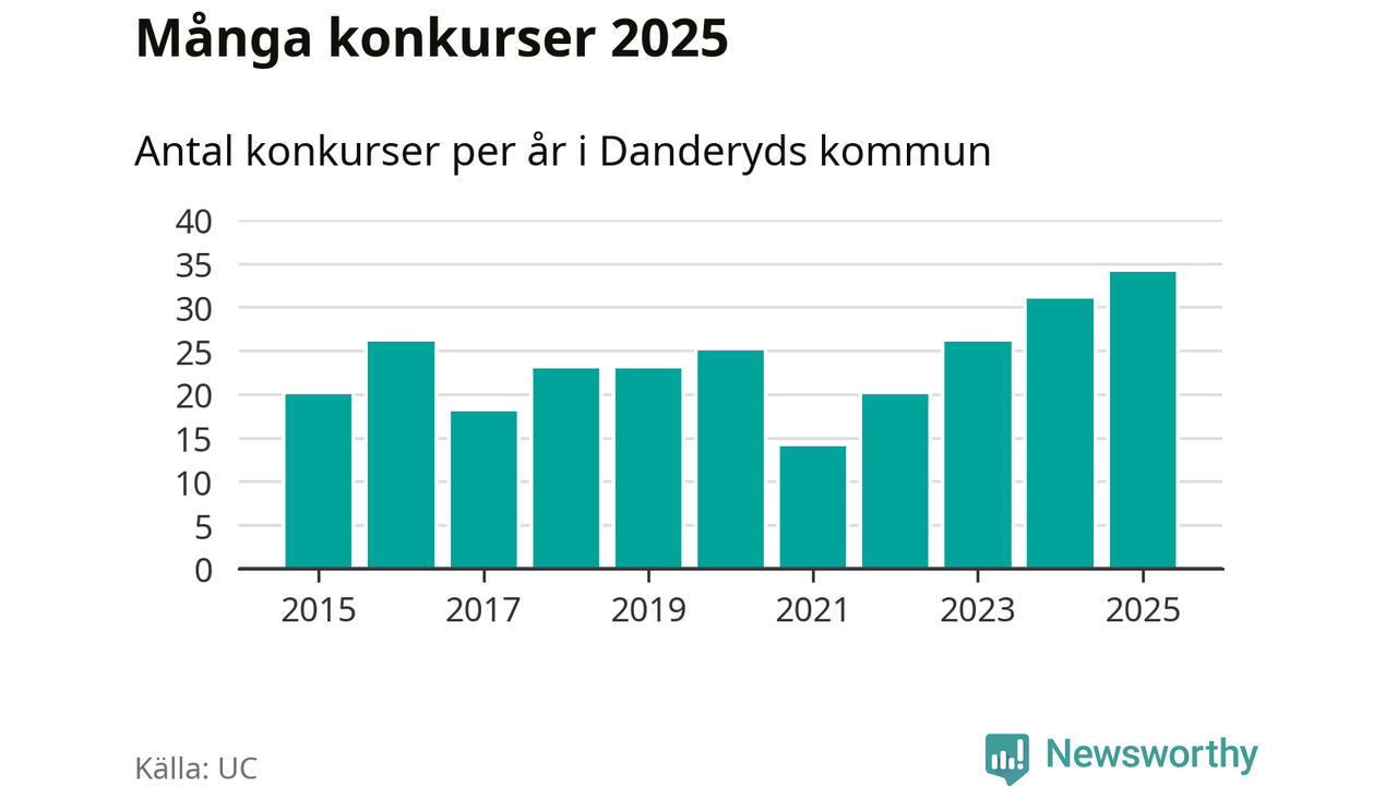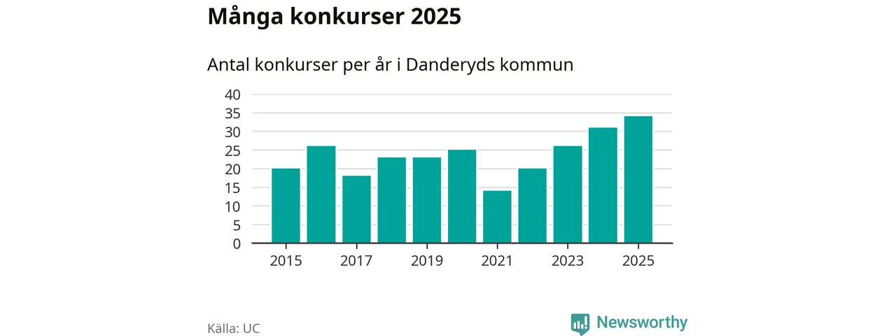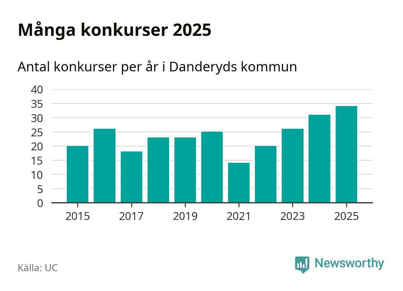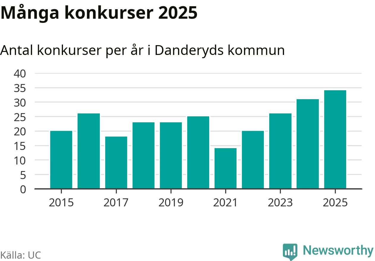 Under år 2025 gick sammanlagt 34 bolag med säte i Danderyds kommun i konkurs. Det är det högsta antalet sedan åtminstone år 2015. Det visar ny statistik från UC.